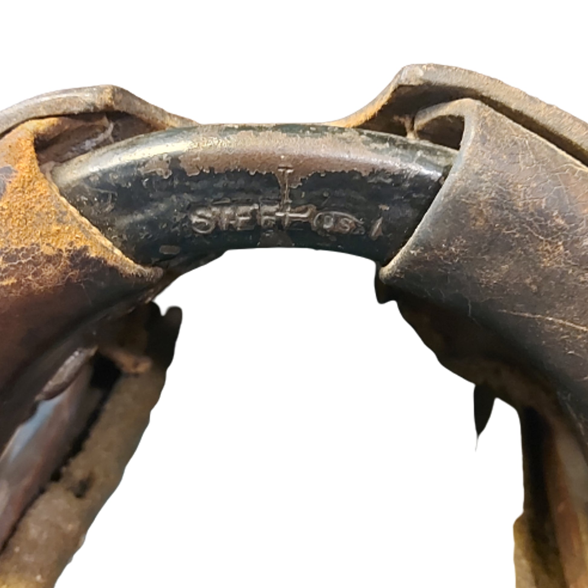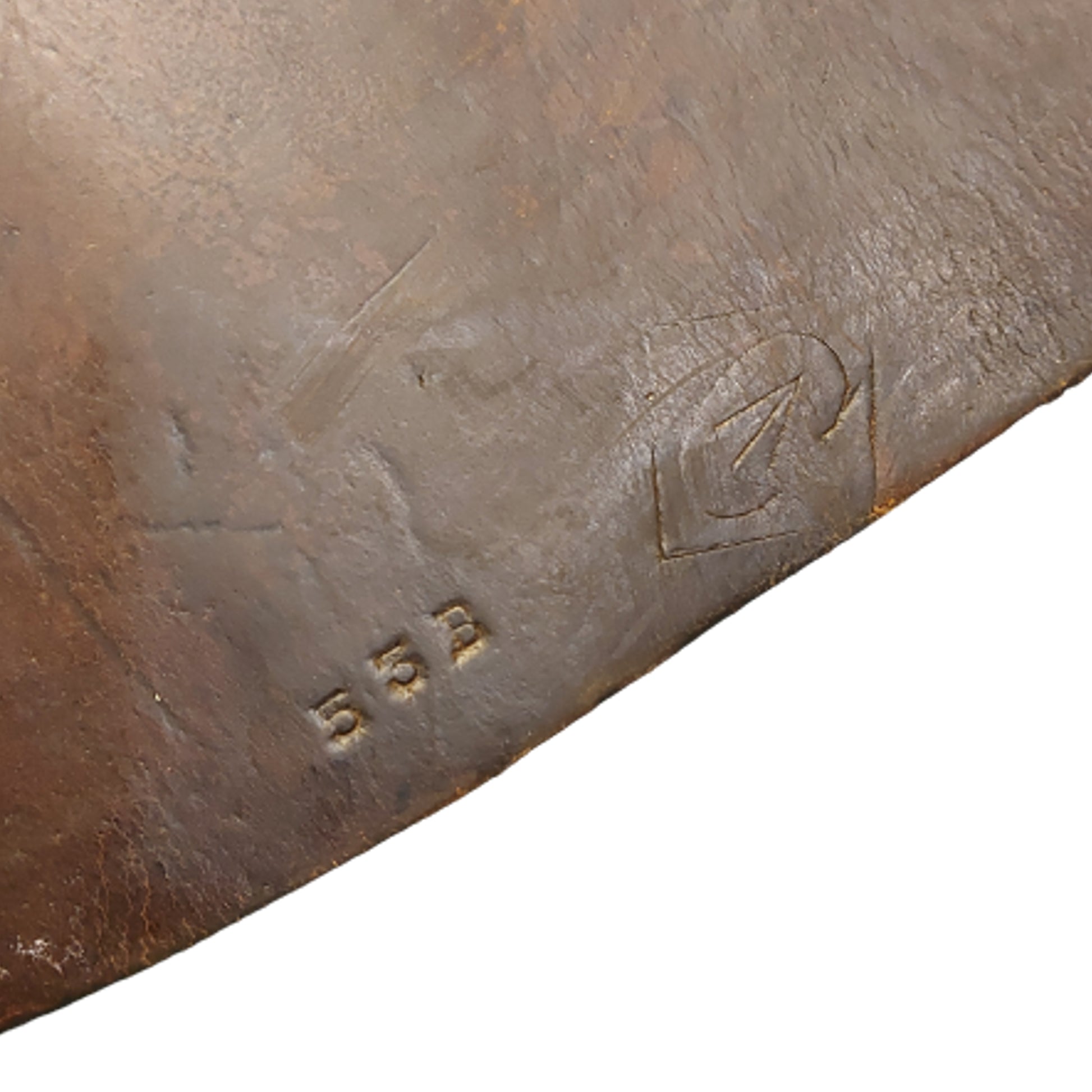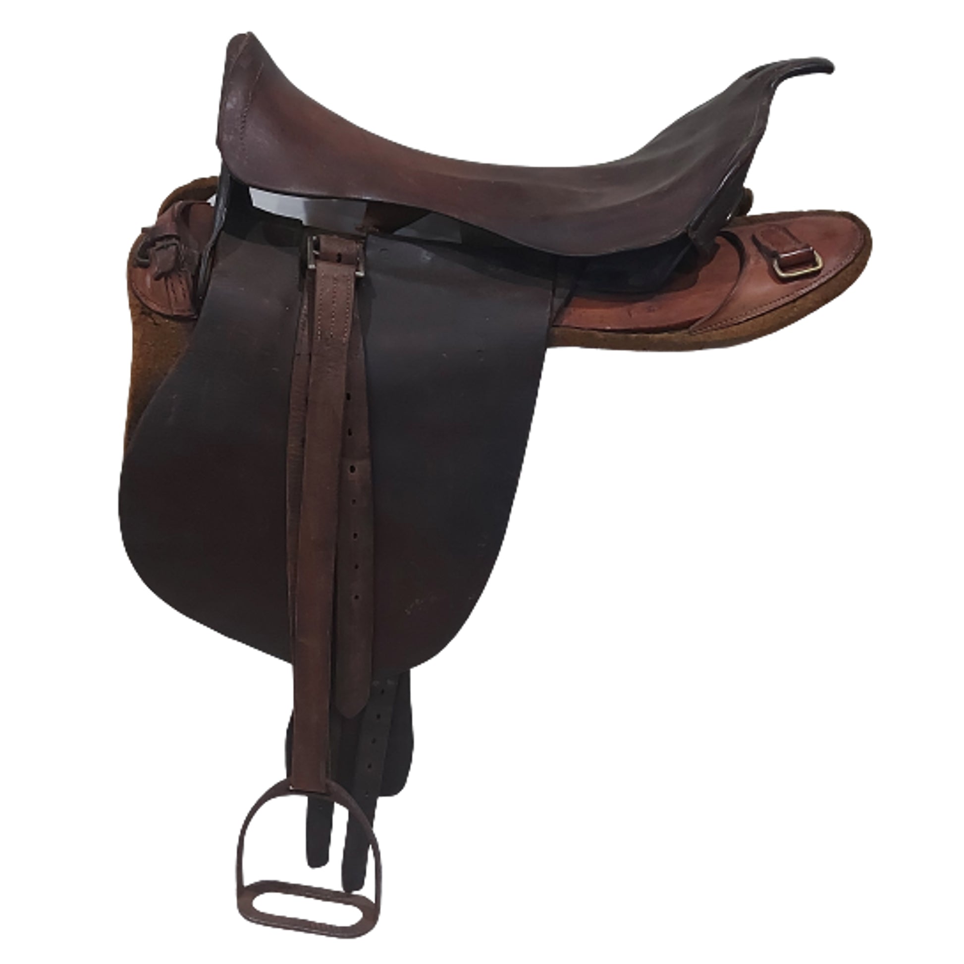 WW! Canadian Universal Pattern Cavalry Saddle, leather construction on a wood tree with a steel cantle and steel stirrups. Large Canadian C-Broadarrow stamp to each fender, and also stamped "53B" as well, for the 53rd Overseas Battalion, Saskatchewan-Manitoba. Large Canadian C-Broadarrow also present to one of the back leather tree caps. All leather straps and buckles in place. One stirrup shows a Canadian C-Broadarrow and the date 1915. Saddle is very solid and rideable with the original felt to the underside being present and in very good condition as well. SKU: 60107