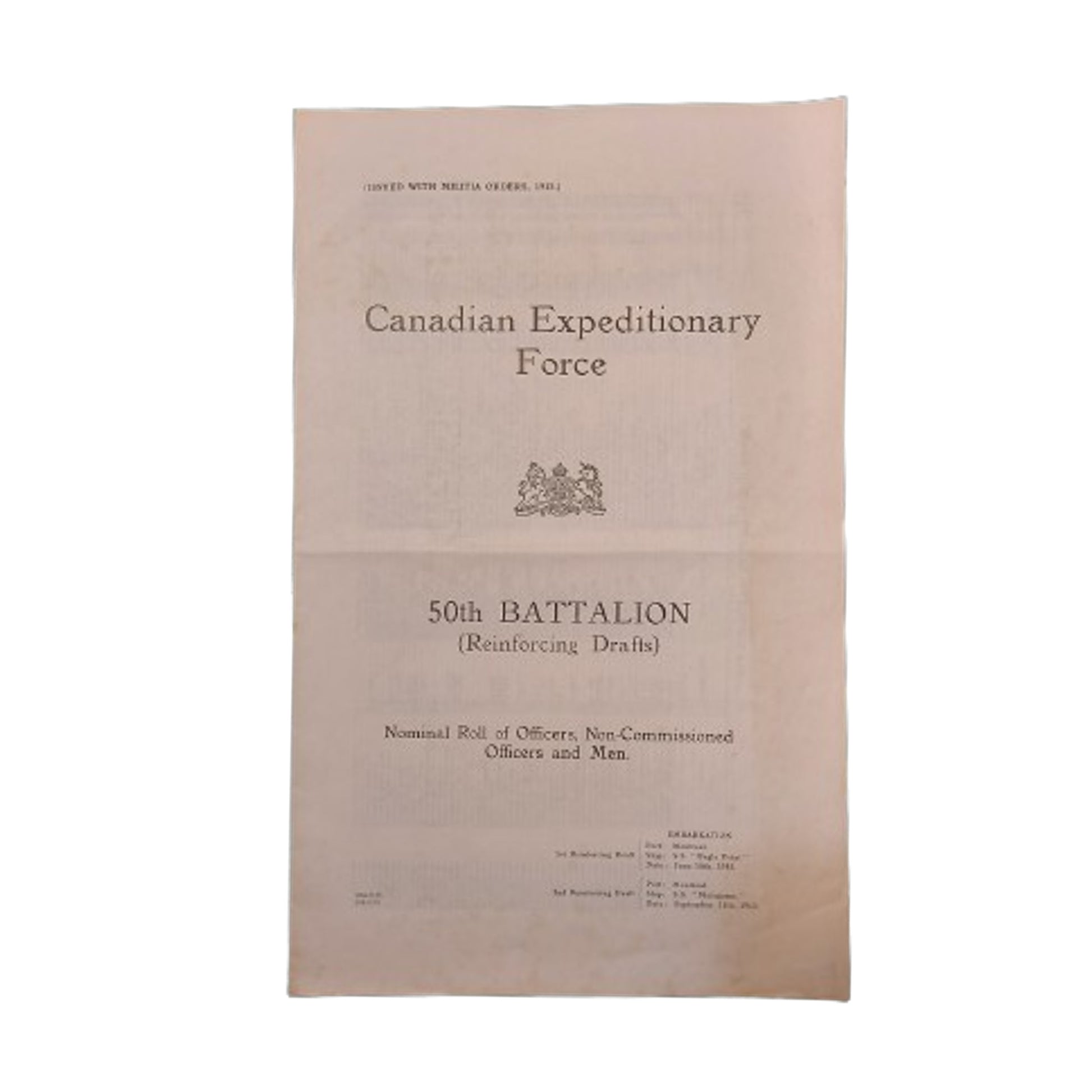 Nominal Roll of Officer's, Non-Commissioned Officers and Men. Printed on paper, marked as issued with Militia Orders, 1915. Measures 8 1/4 by 13 1/4 inches containing 11 pages. SKU: 61585