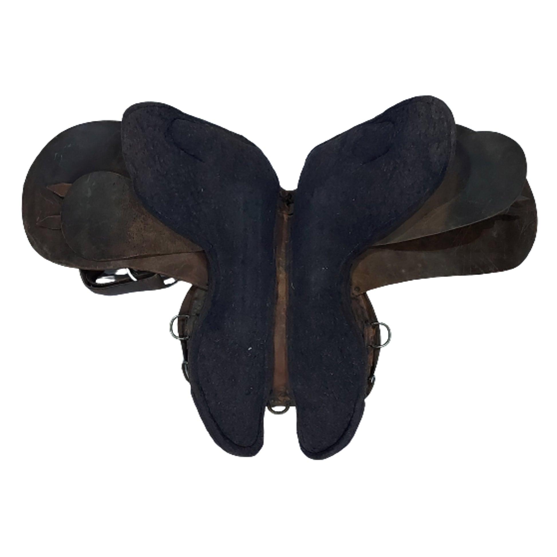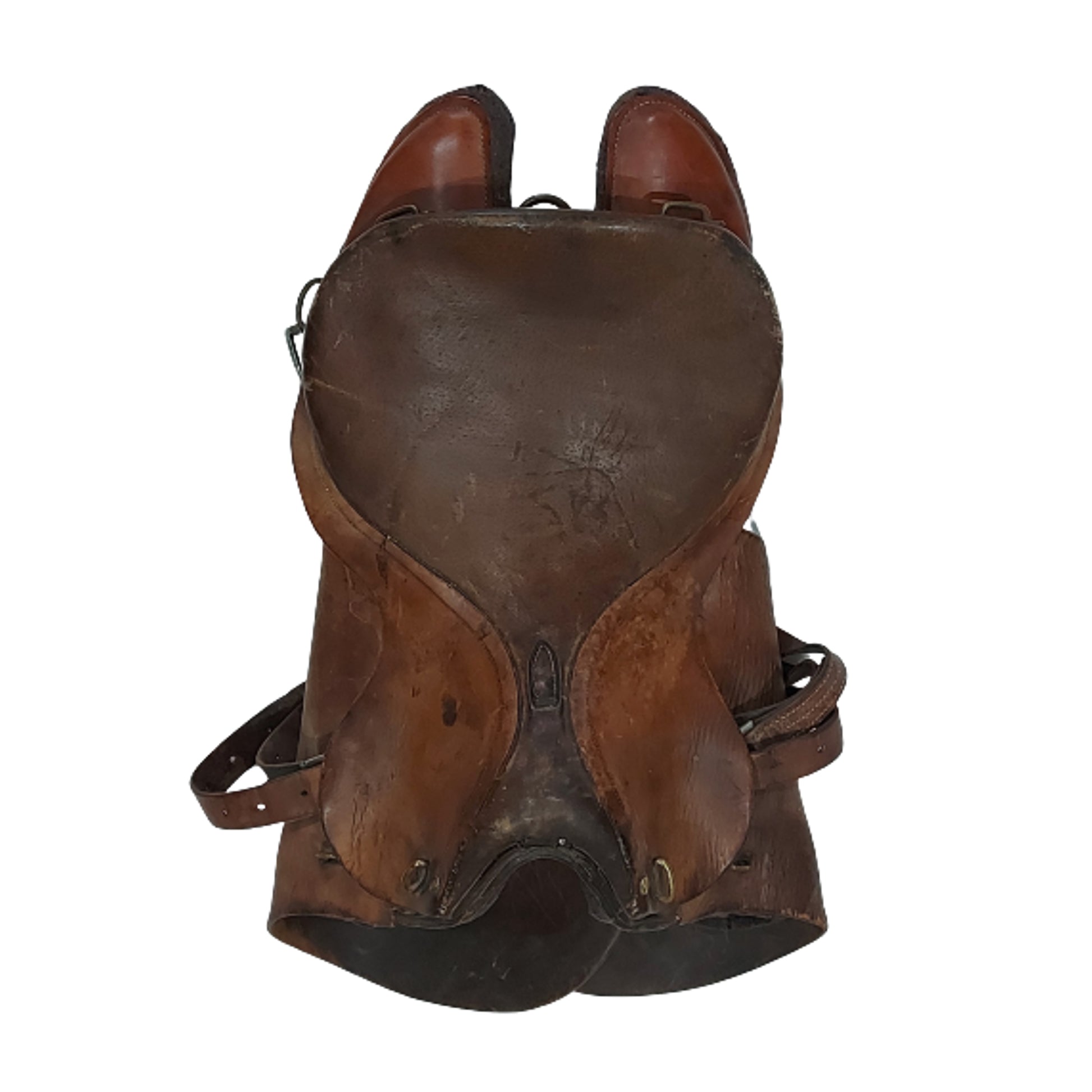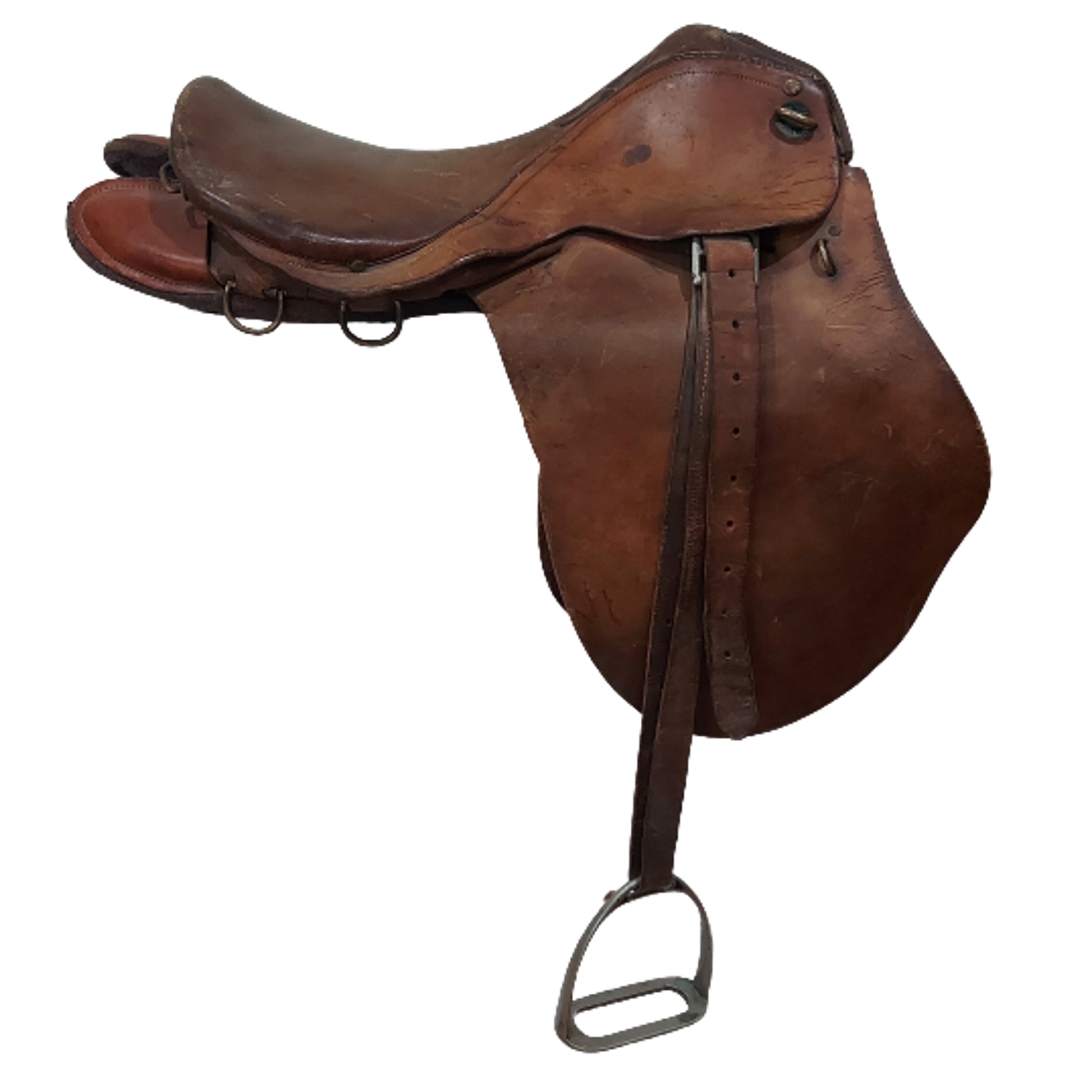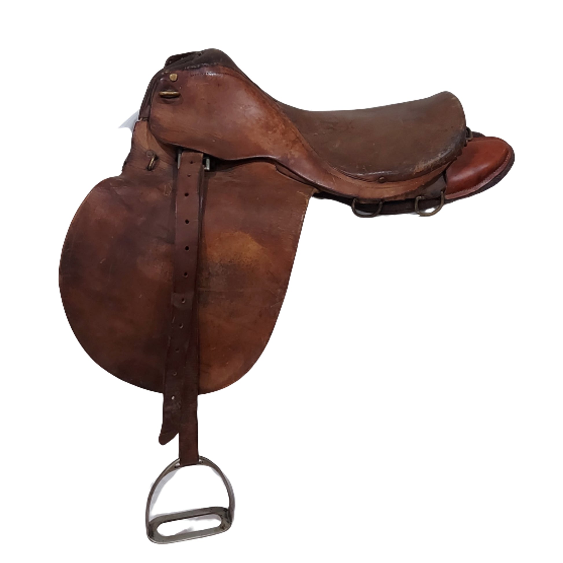 Leather construction on a wood tree with brass fixtures. Nickel silver stirrups that are C-Broadarrow marked and stamped "A.R.C.D. " and dated 1915 with the number '4 23" to one of the stirrups. One leather fender is also stamped with the number "53". Saddle appears complete and the tree is solid. Very good original condition overall.