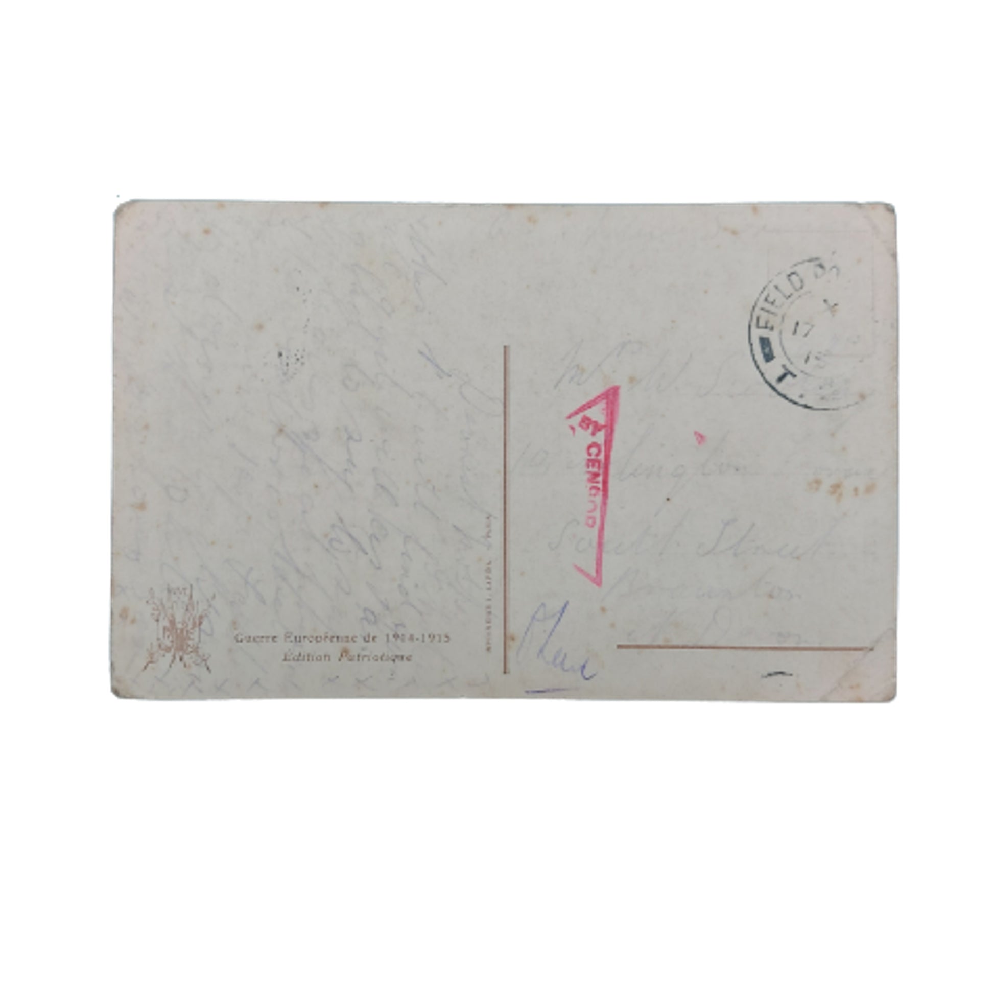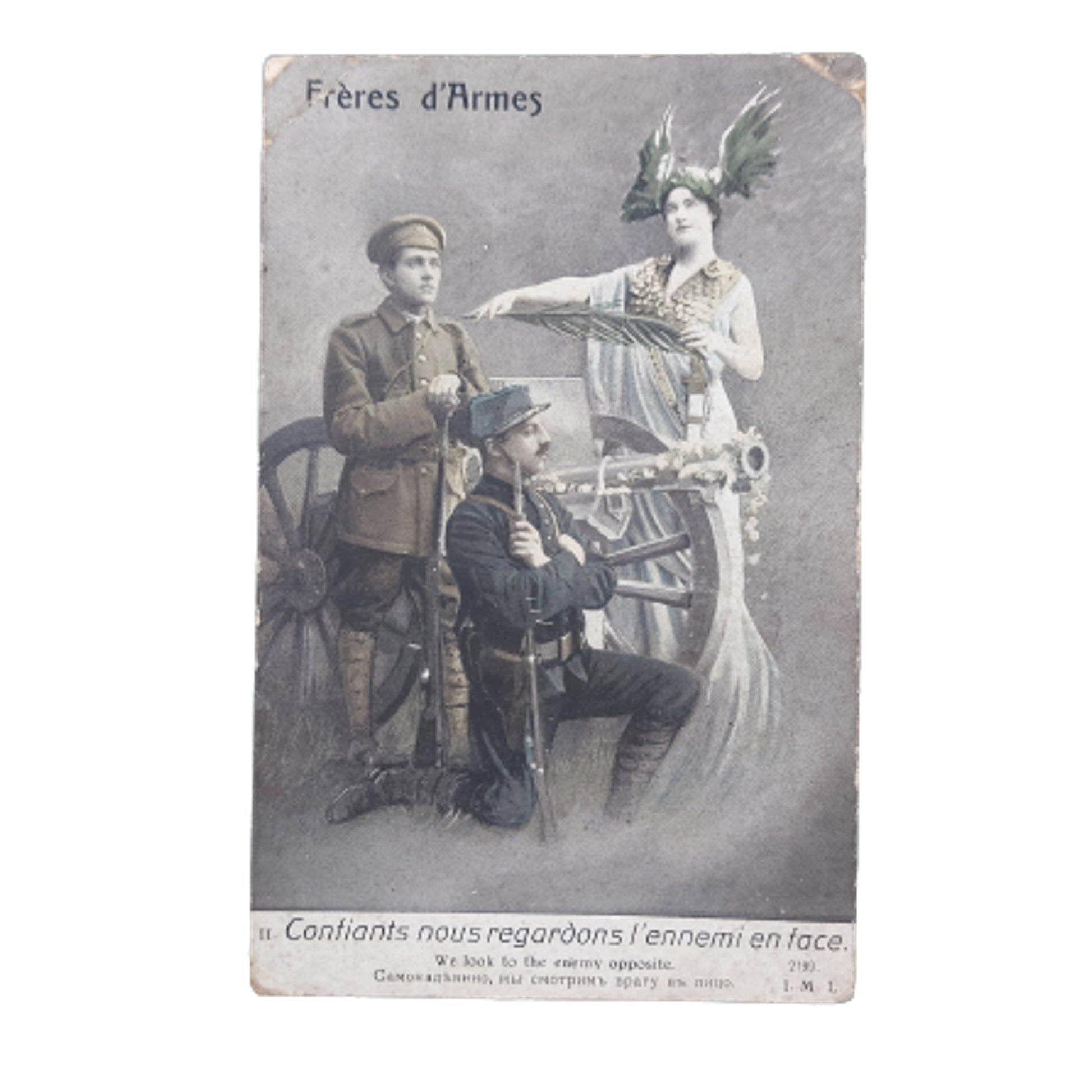 WW1 black and white picture postcard marked to the bottom, "Confiants nous regardons l'ennemi en face". (Confident, we look at the face of the enemy). Faint hand written period letter to the reverse. SKU: 60436