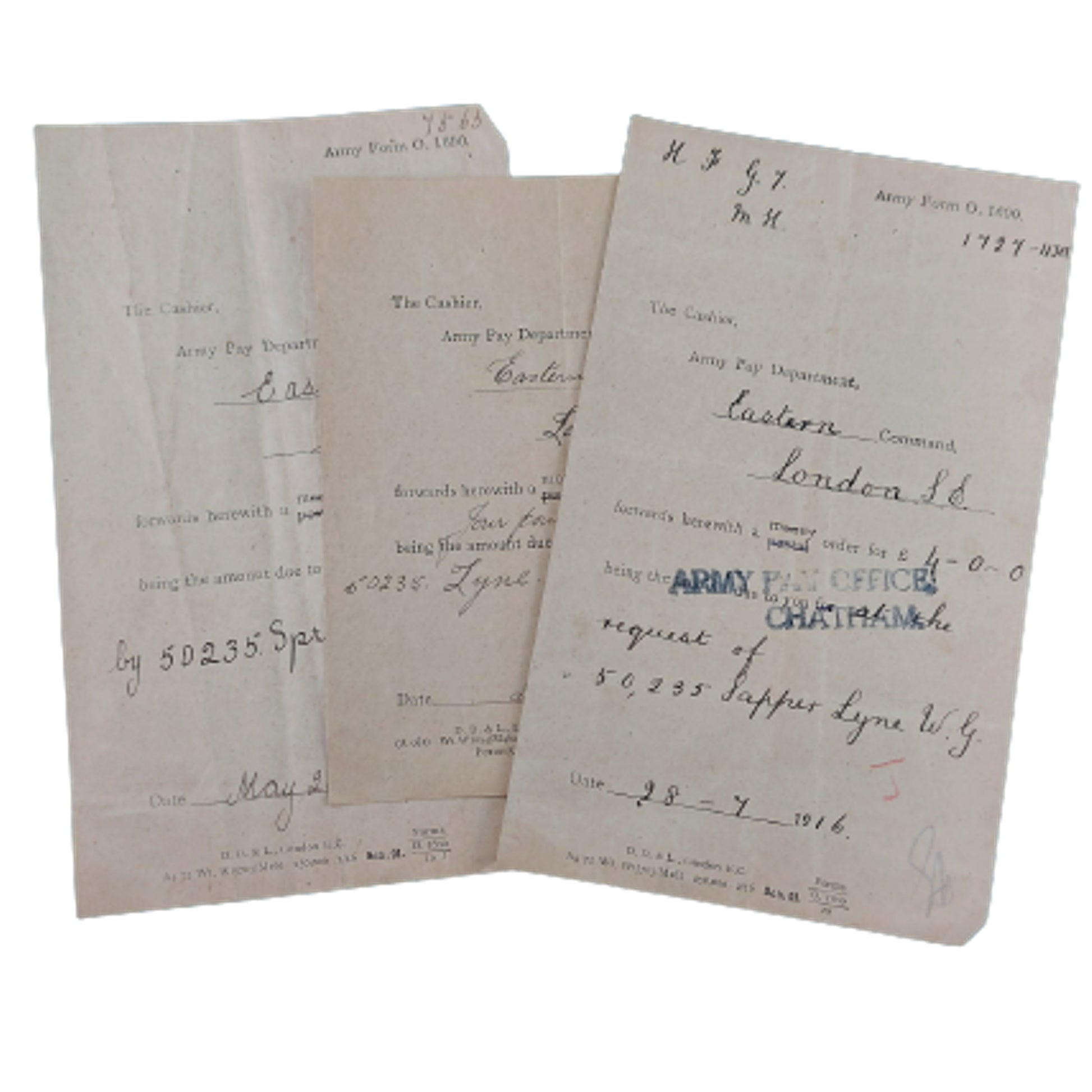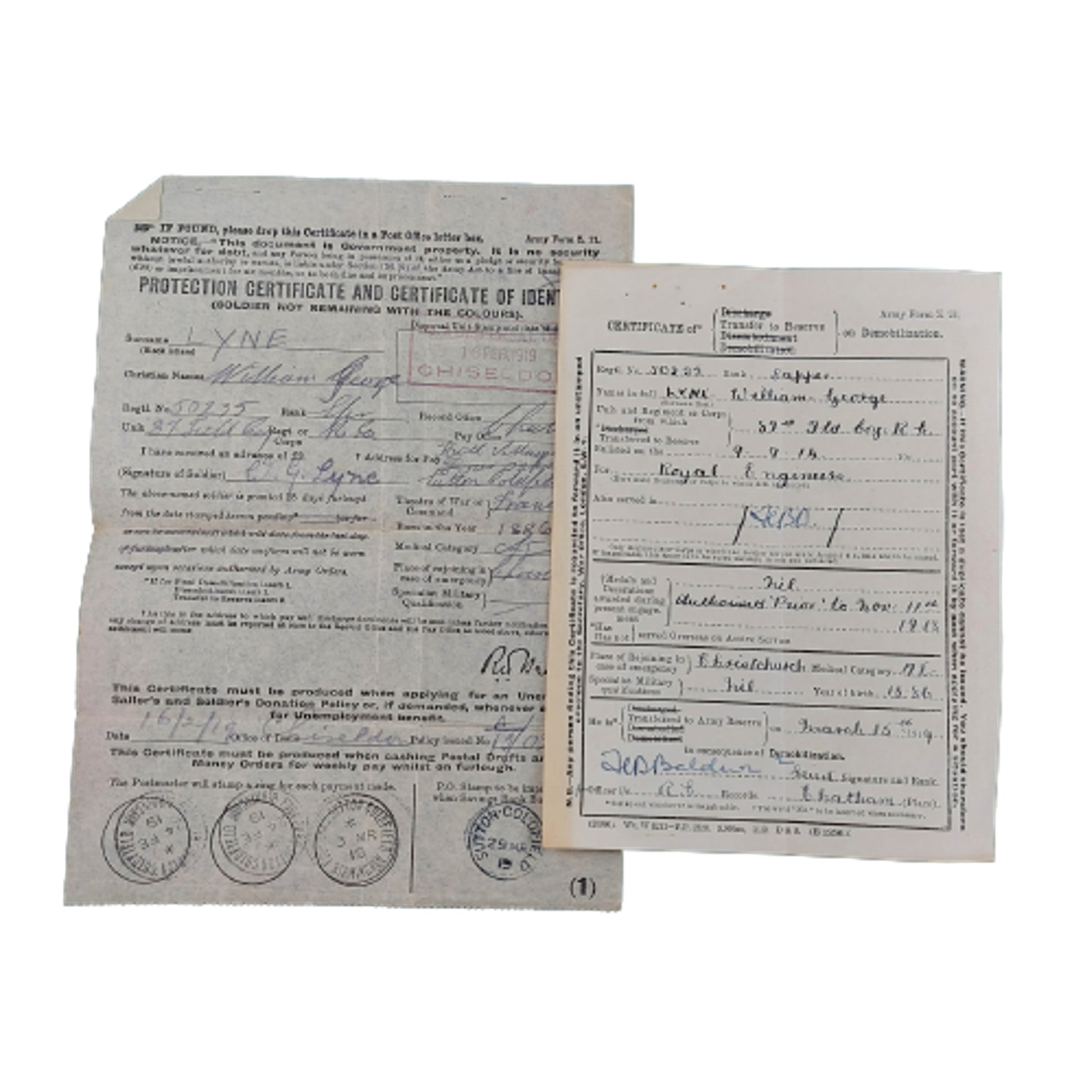 WW1 Paperwork To 50235 Spr. W. Lyne 87th Field Company Royal Engineers