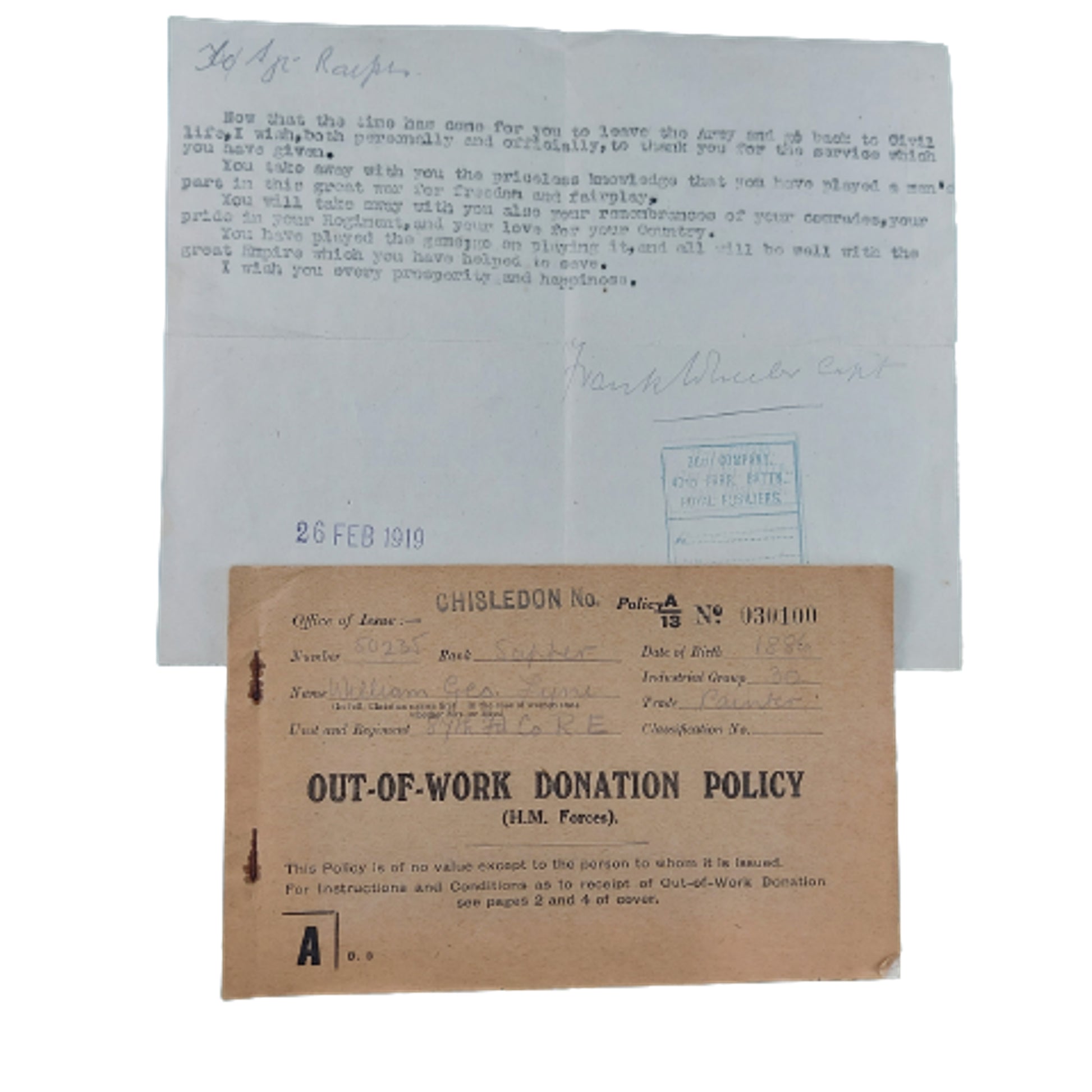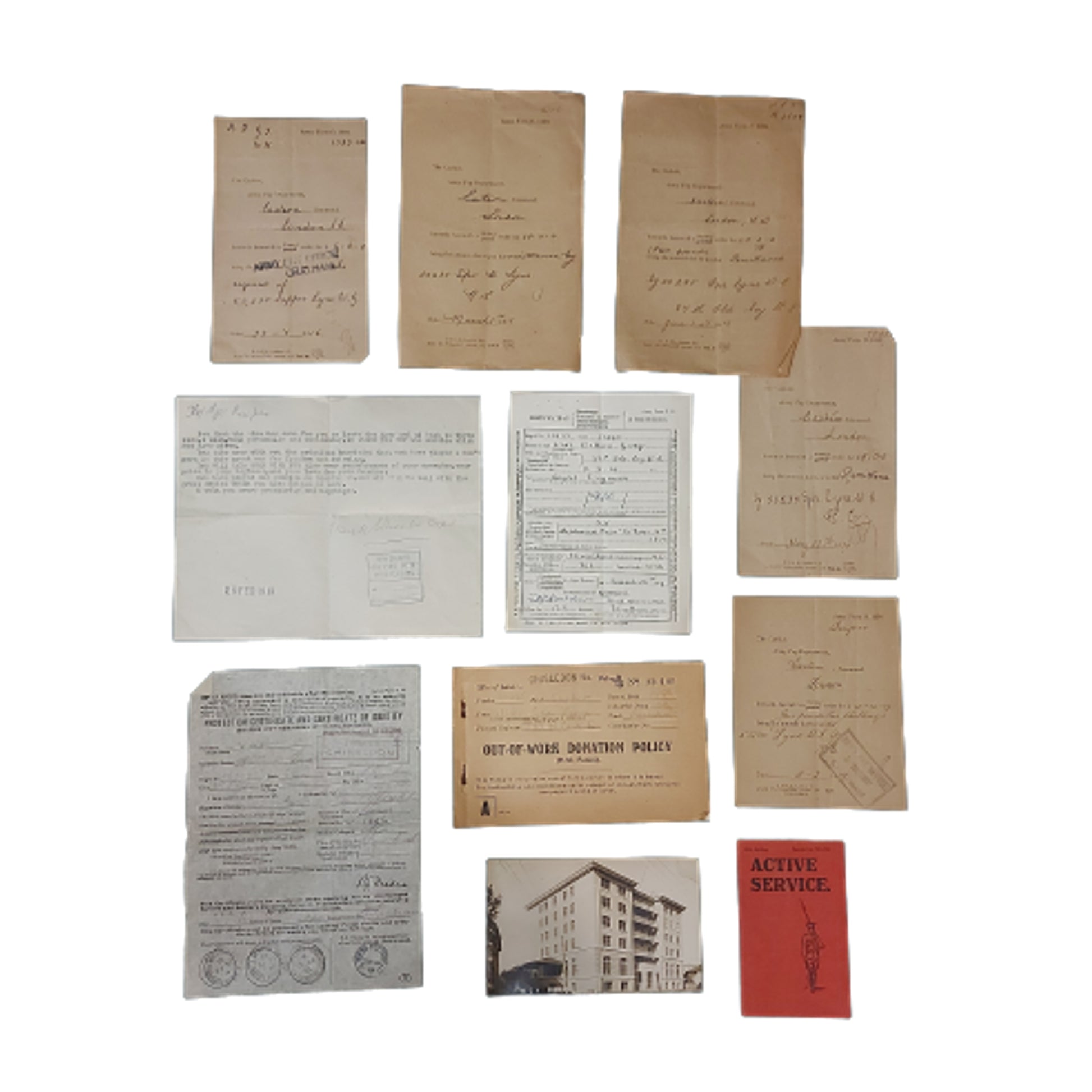 Comprising of 5 Army Pay remittance forms, Active Service Booklet, Out Of Work Donation Policy Form Book, letter of Thank You For Service, Certificate Of Identity, Certificate Of Transfer To Reserve, and a picture postcard. All items are WW1 dated.