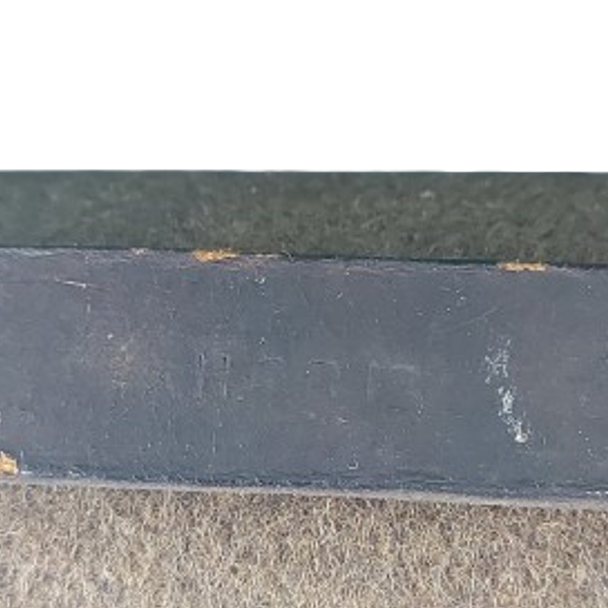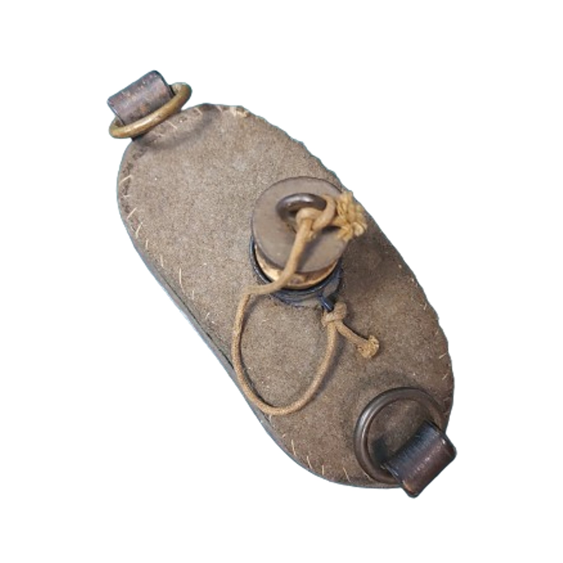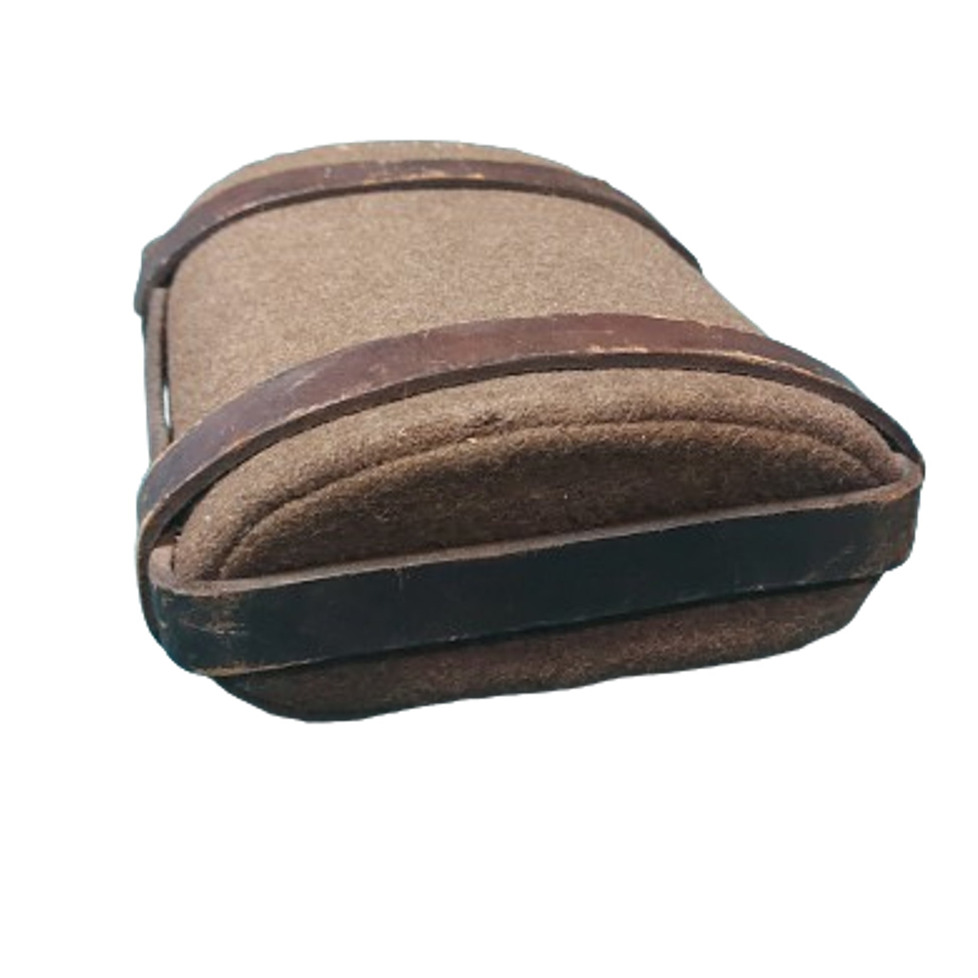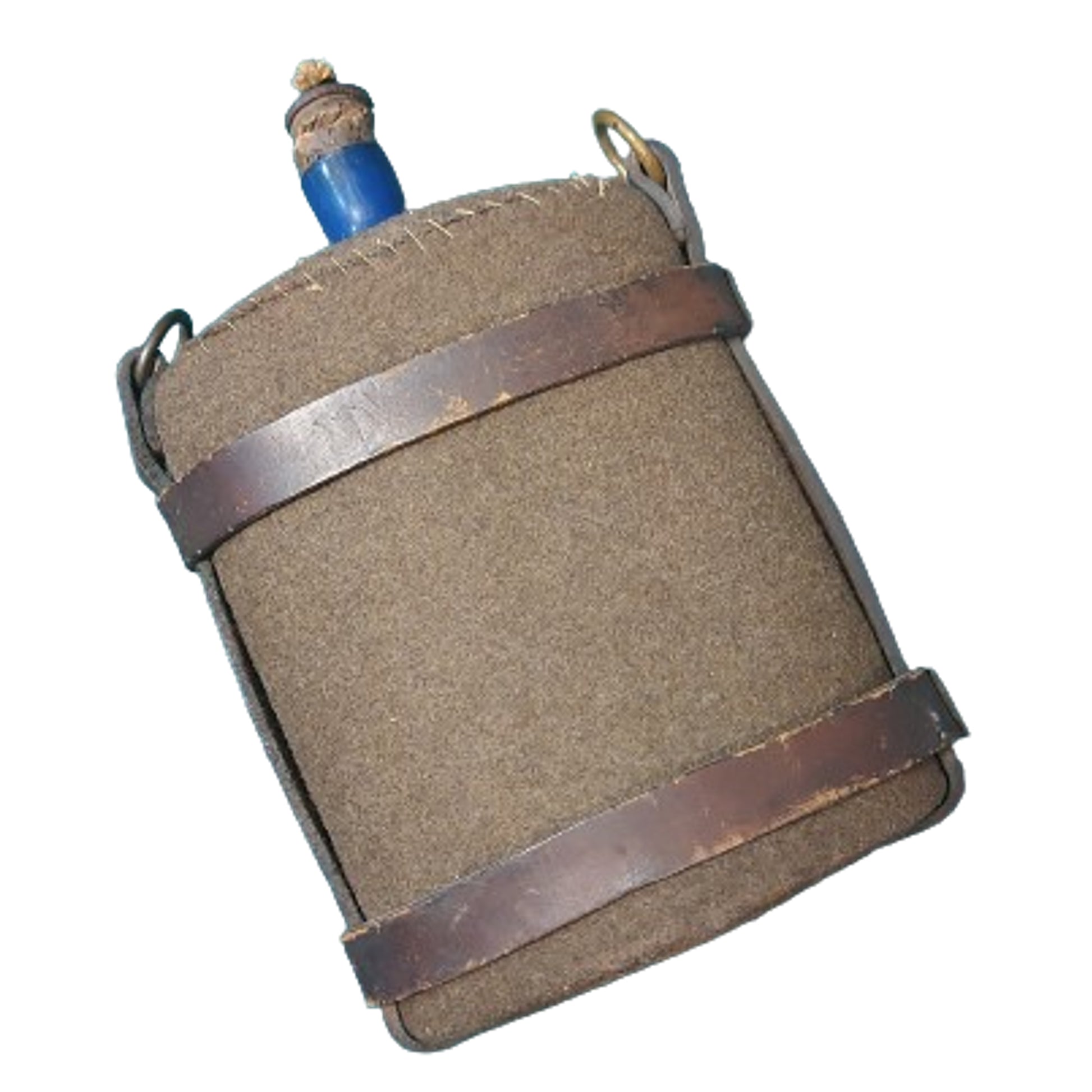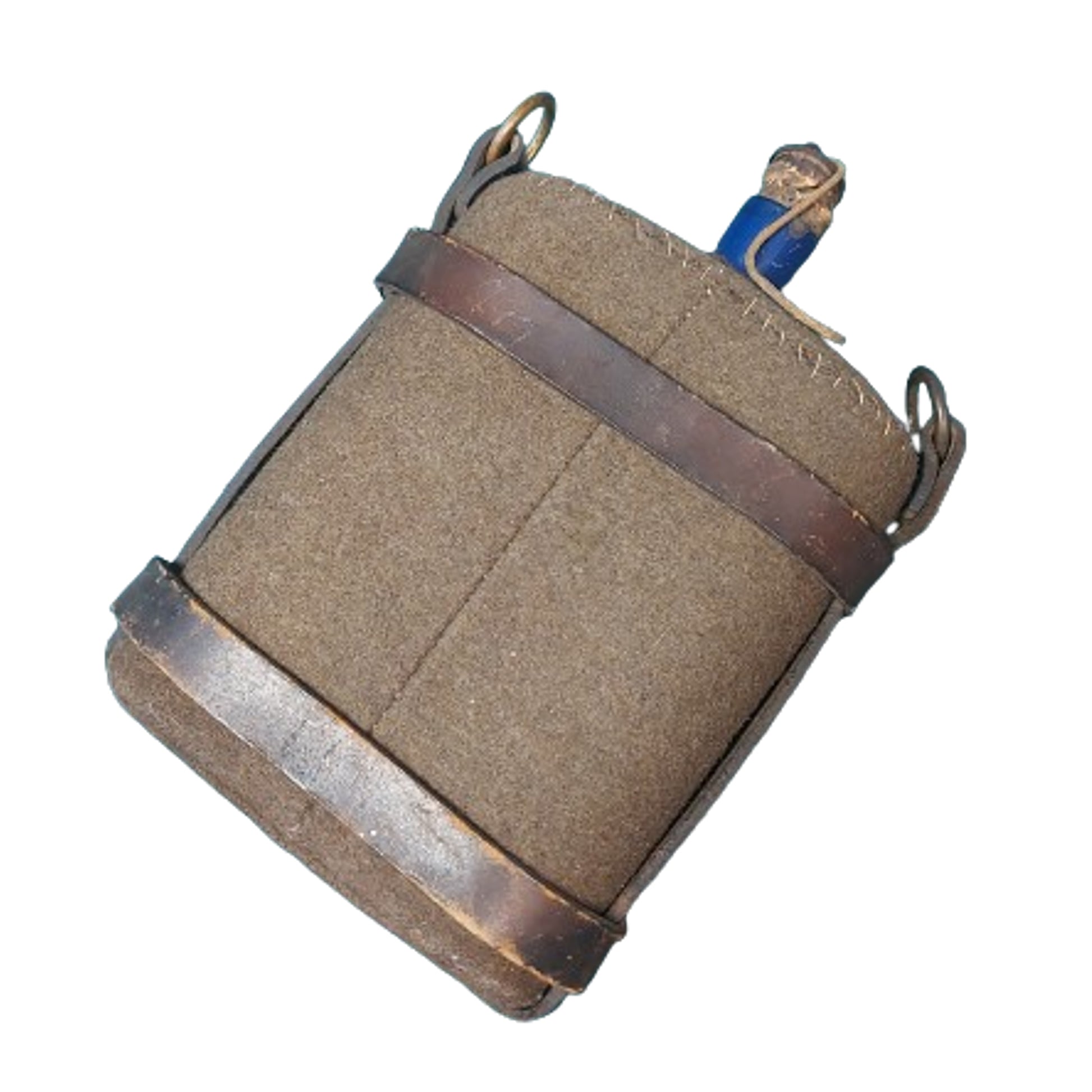 Felt material covered blue enamel field canteen with cork and string in place. In the issue leather carrier with brass connector rings. Maker marked to the side of the carrier. SKU: 61905