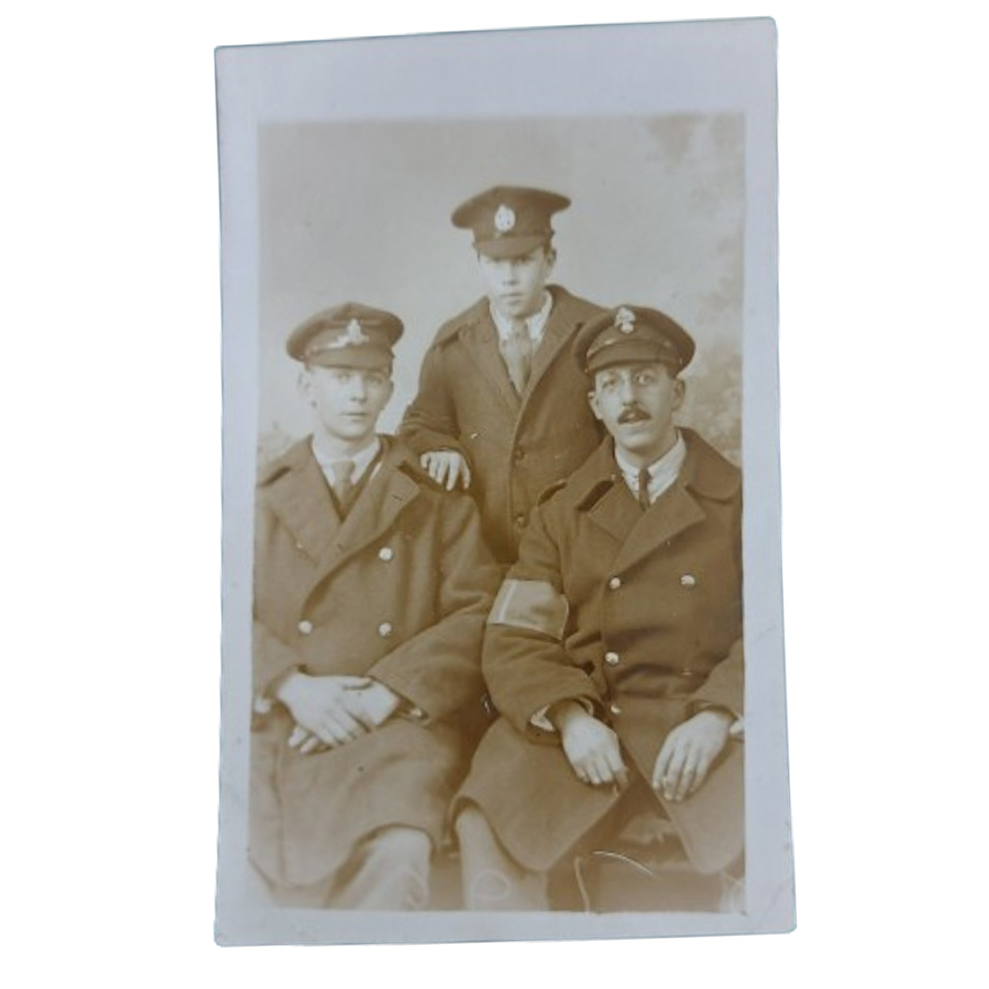 WW1 black and white picture postcard showing 3 soldiers wearing great coats and wearing visor caps. Badges visible in the photo. SKU: 61358