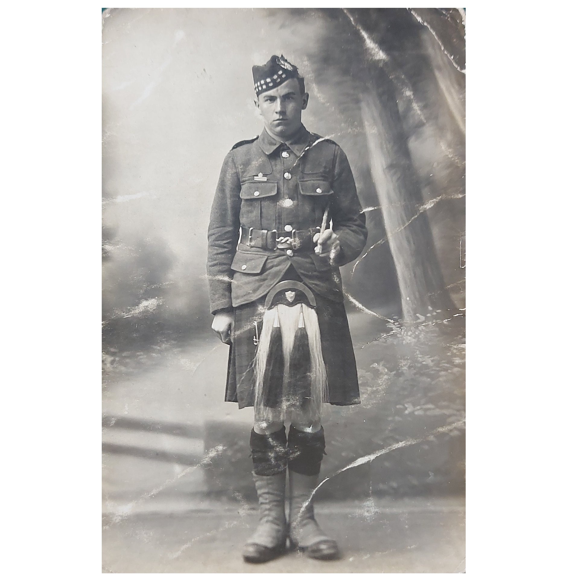 WW1 black and white photo picture postcard showing a soldier in full Scottish Regiment uniform including cut-away tunic, kilt, sporran and glengarry with badge. SKU: 59992