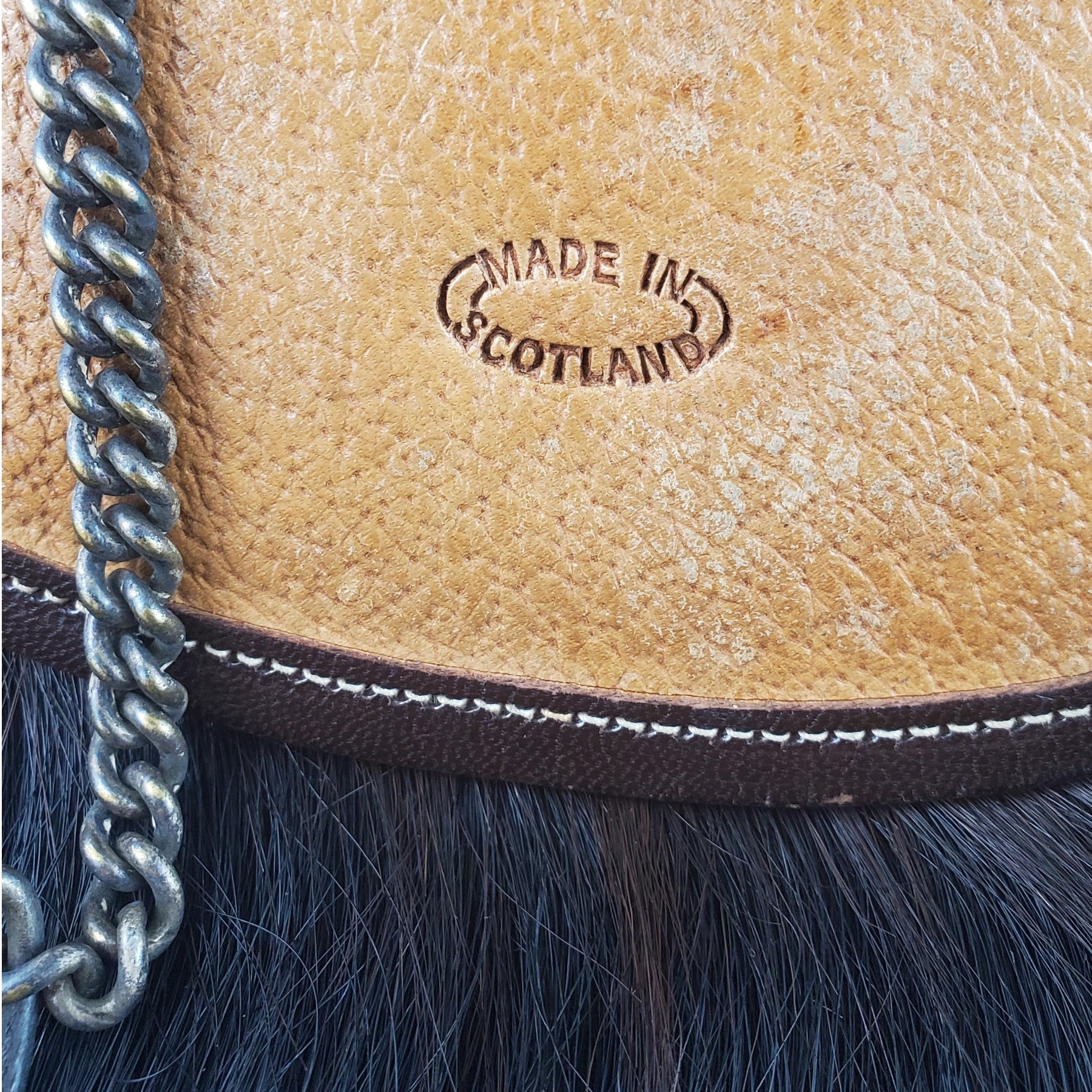 Black horsehair with 6 white horsehair bells to the front. Nickel silver cantle with leather backing. Chain and leather waist belt in place. Stamped to the reverse, "Made In Scotland".