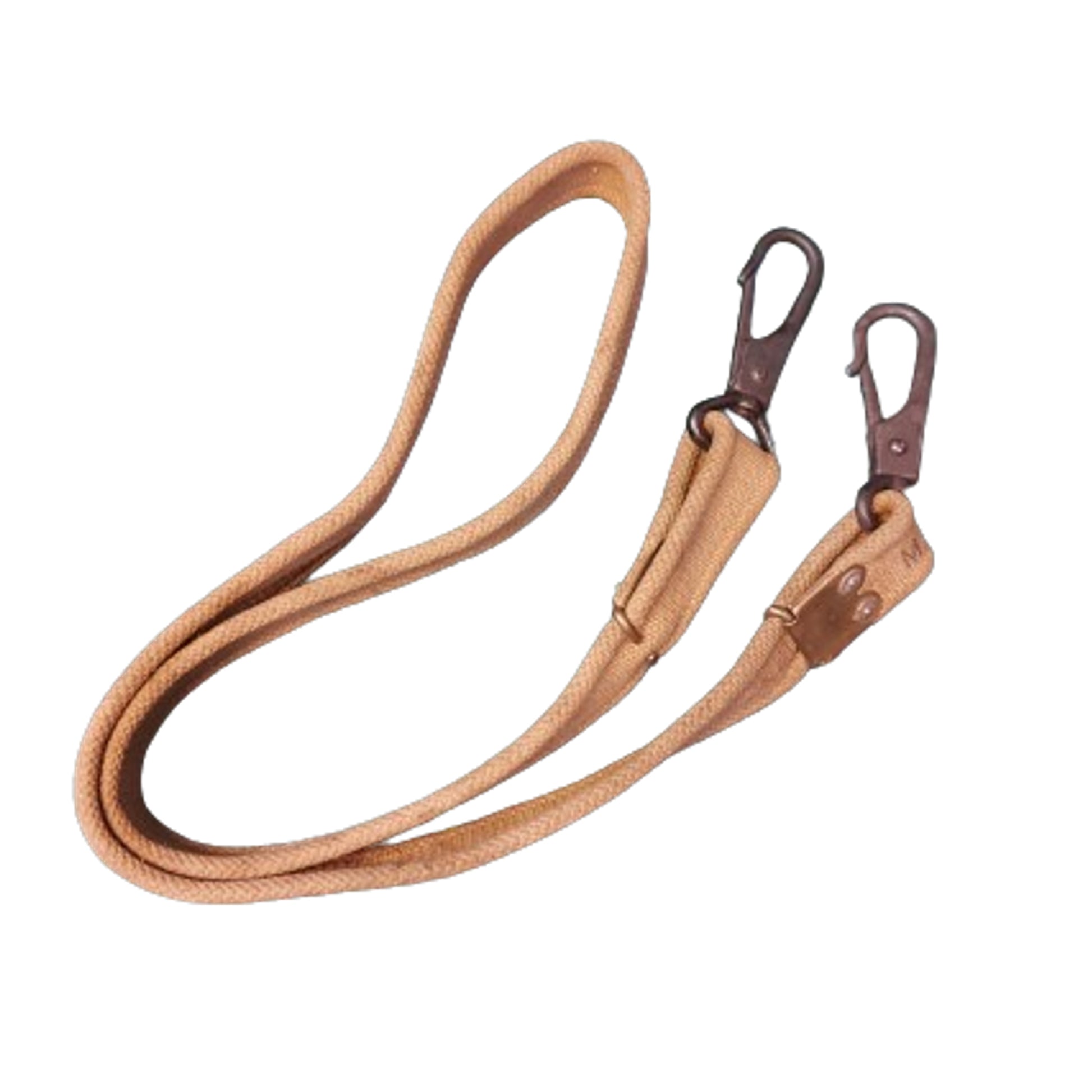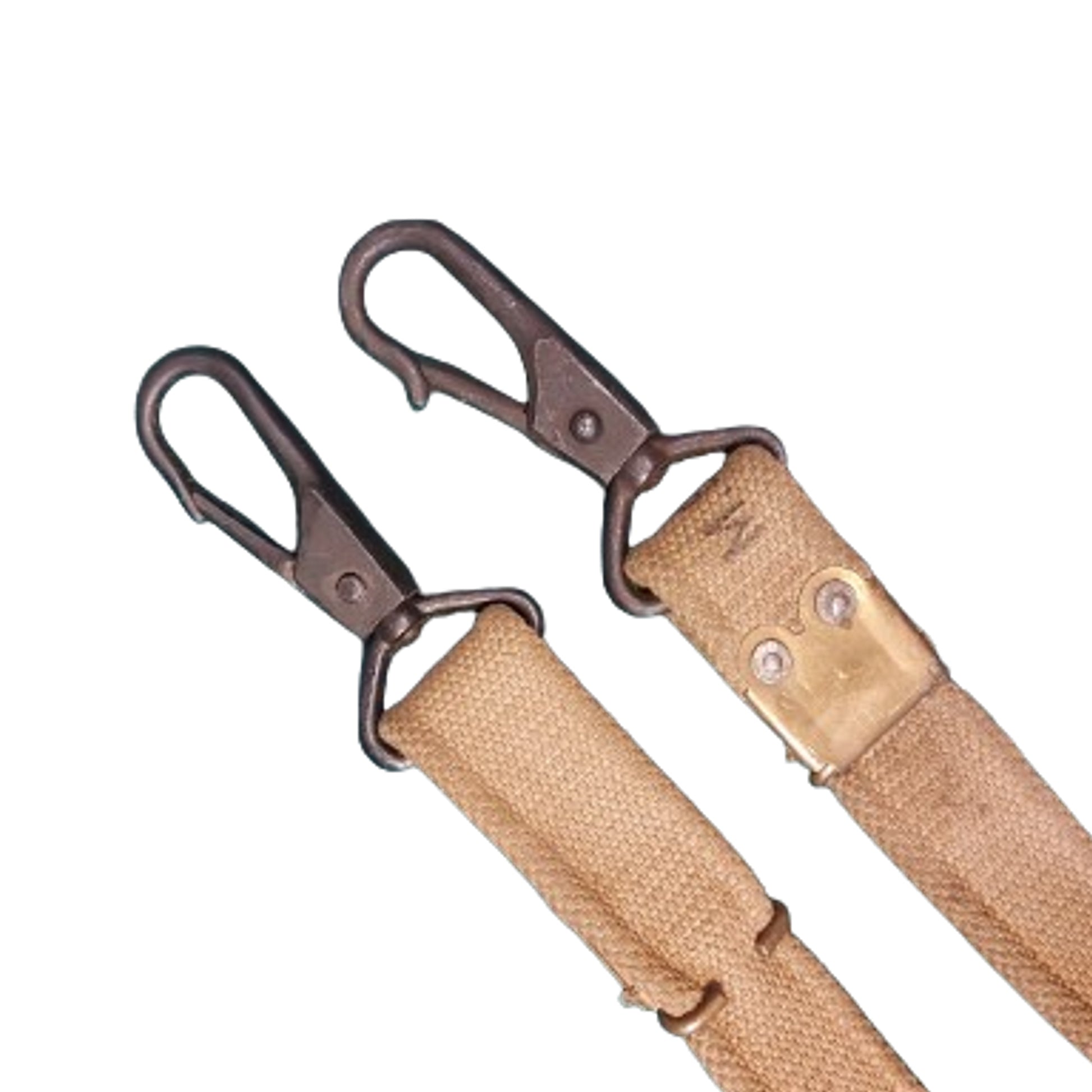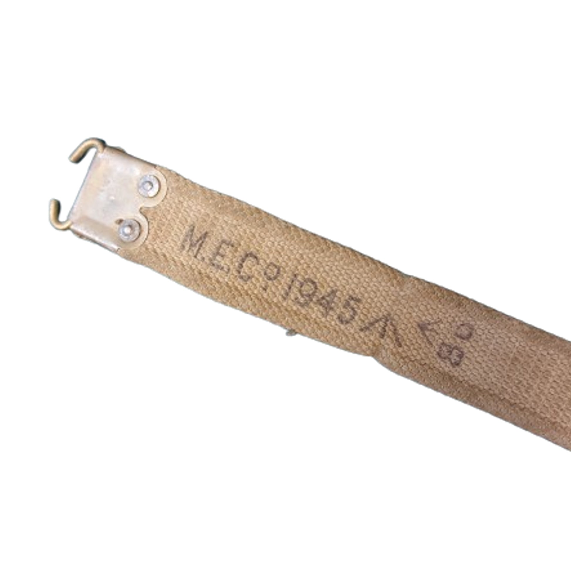 Webbed construction sling with both steel mounting hooks in place. Maker marked M.E.Co.  and dated 1945 with a British Broadarrow.  For use with the British and Canadian Mk.I and Mk.I* models. Shows use and wear. SKU: 61246