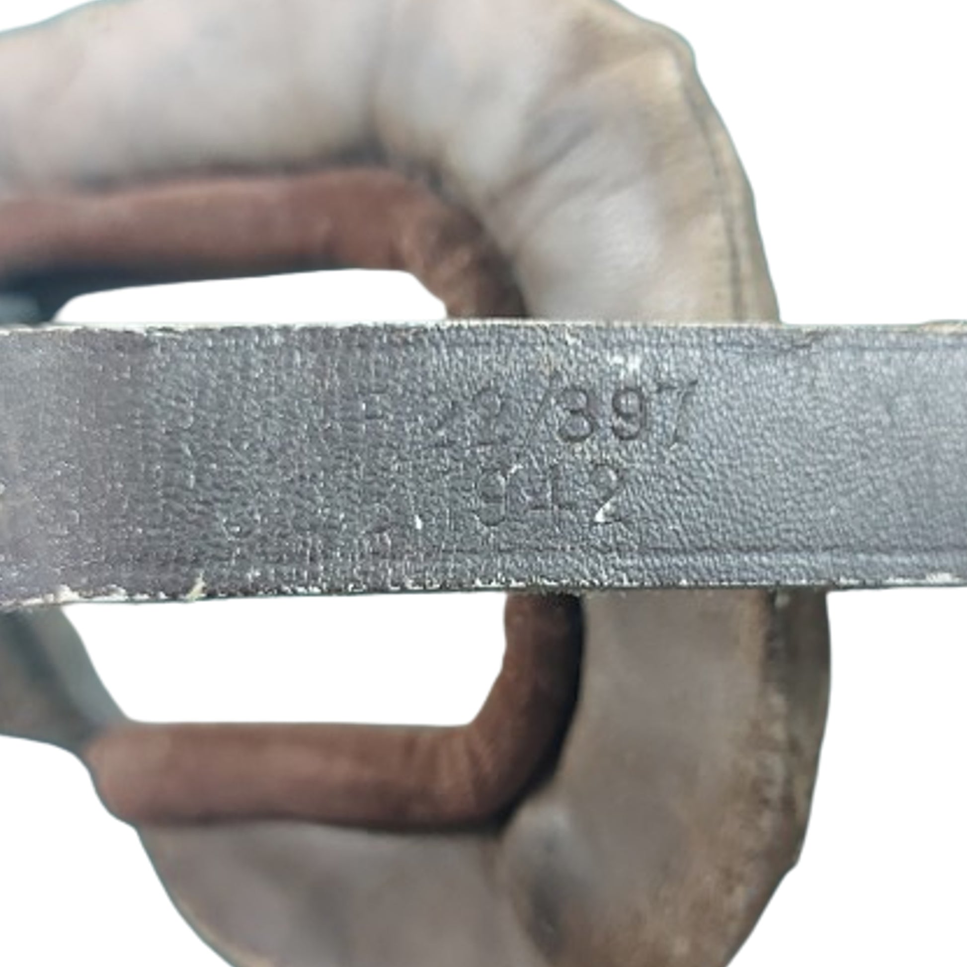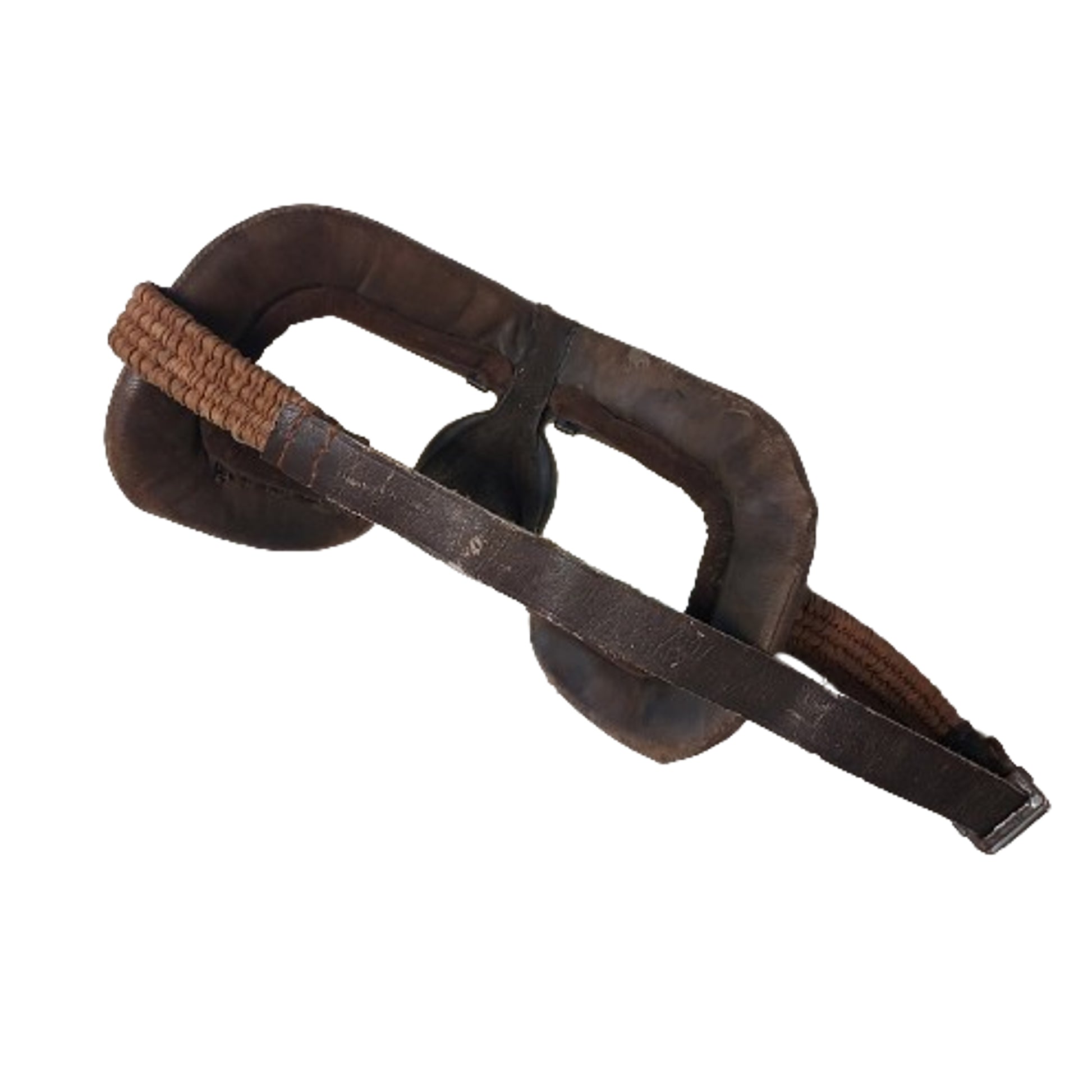 Folding leather construction flight goggles with metal frames surrounding the lenses and an adjustable leather and elastic head strap that is dated 1942. Shows expected use and wear but without damage. SKU: 62287