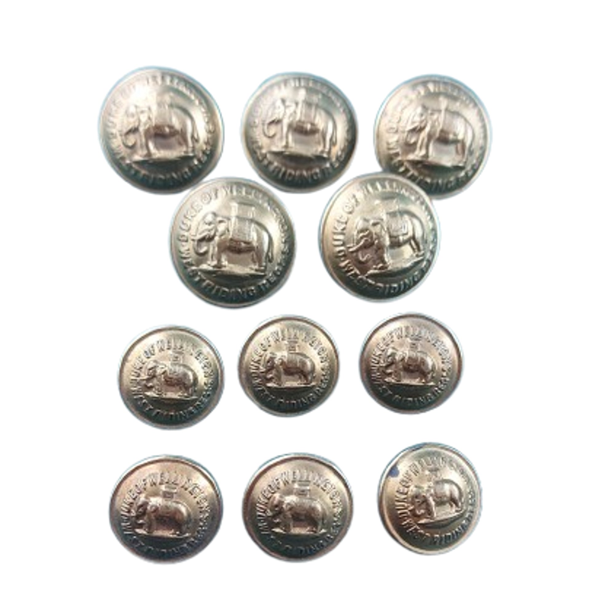 Set of 11 brass British Duke Of Wellington's Regiment West Riding Uniform Buttons, comprising of 5 large size buttons for the front of the tunic, and 6 medium size buttons for wear on cuffs and pockets. SKU: 63275