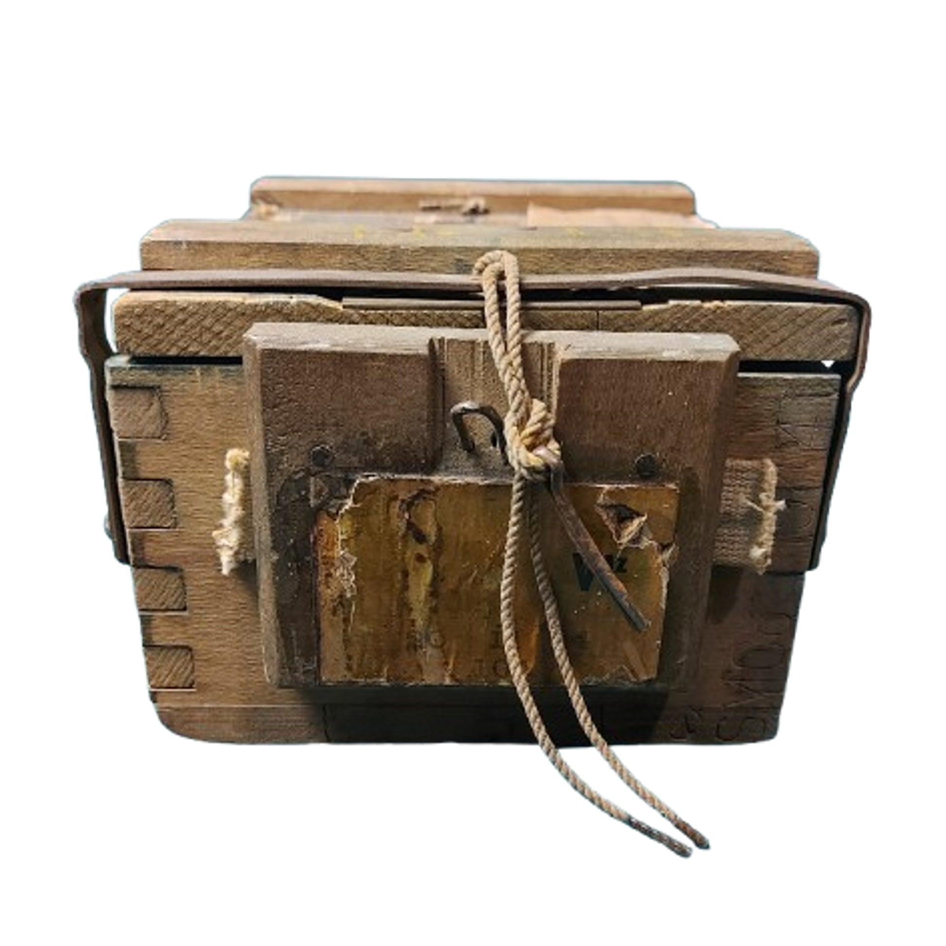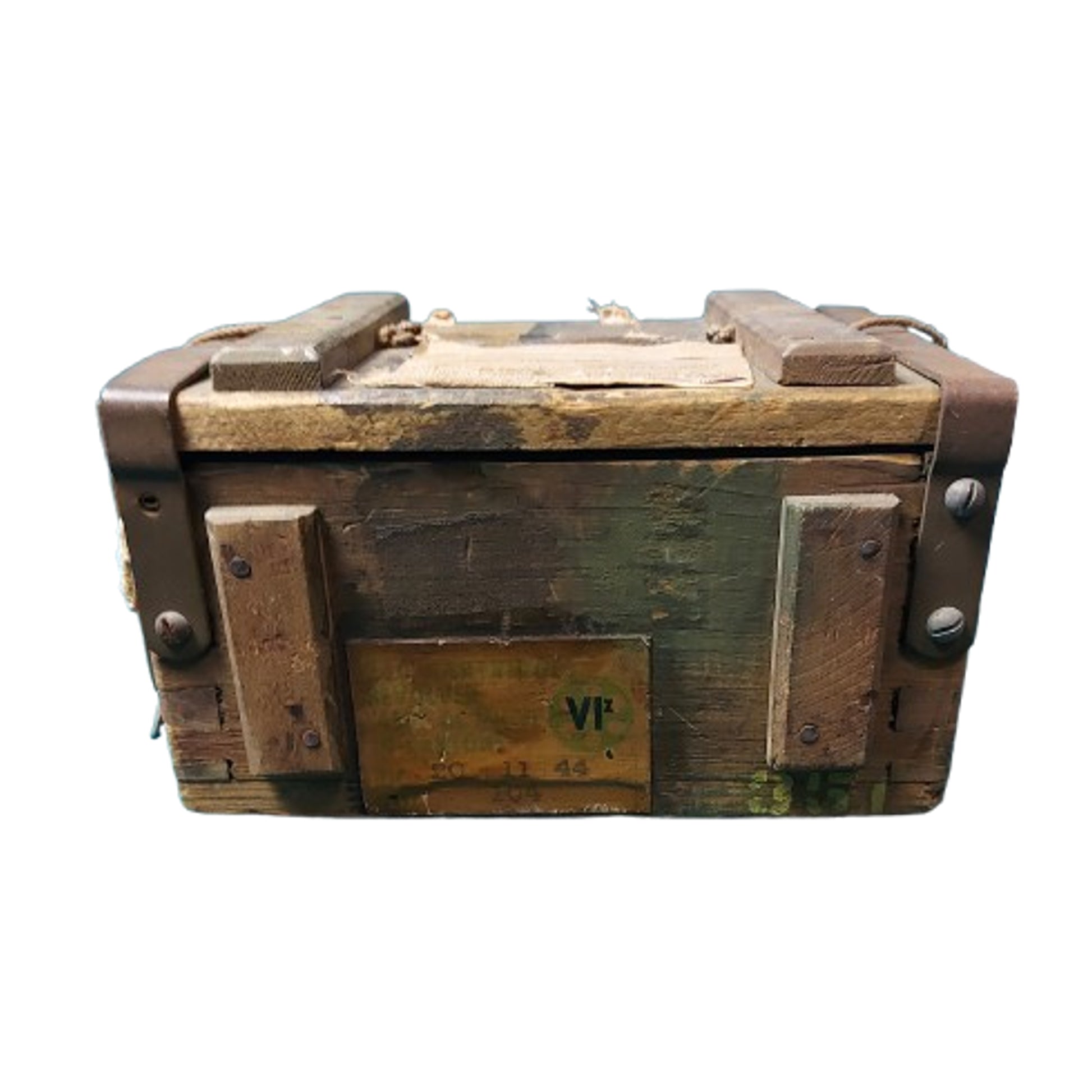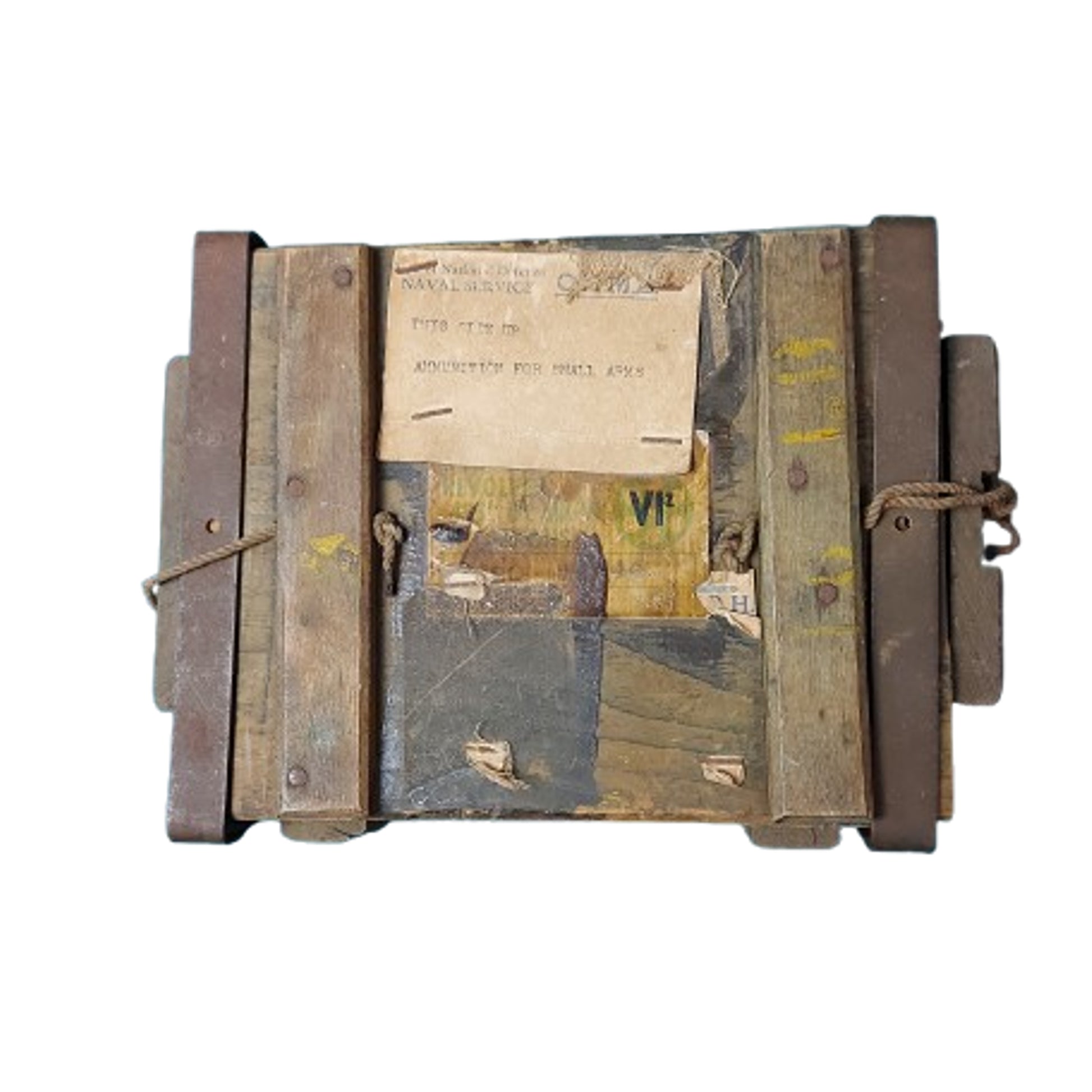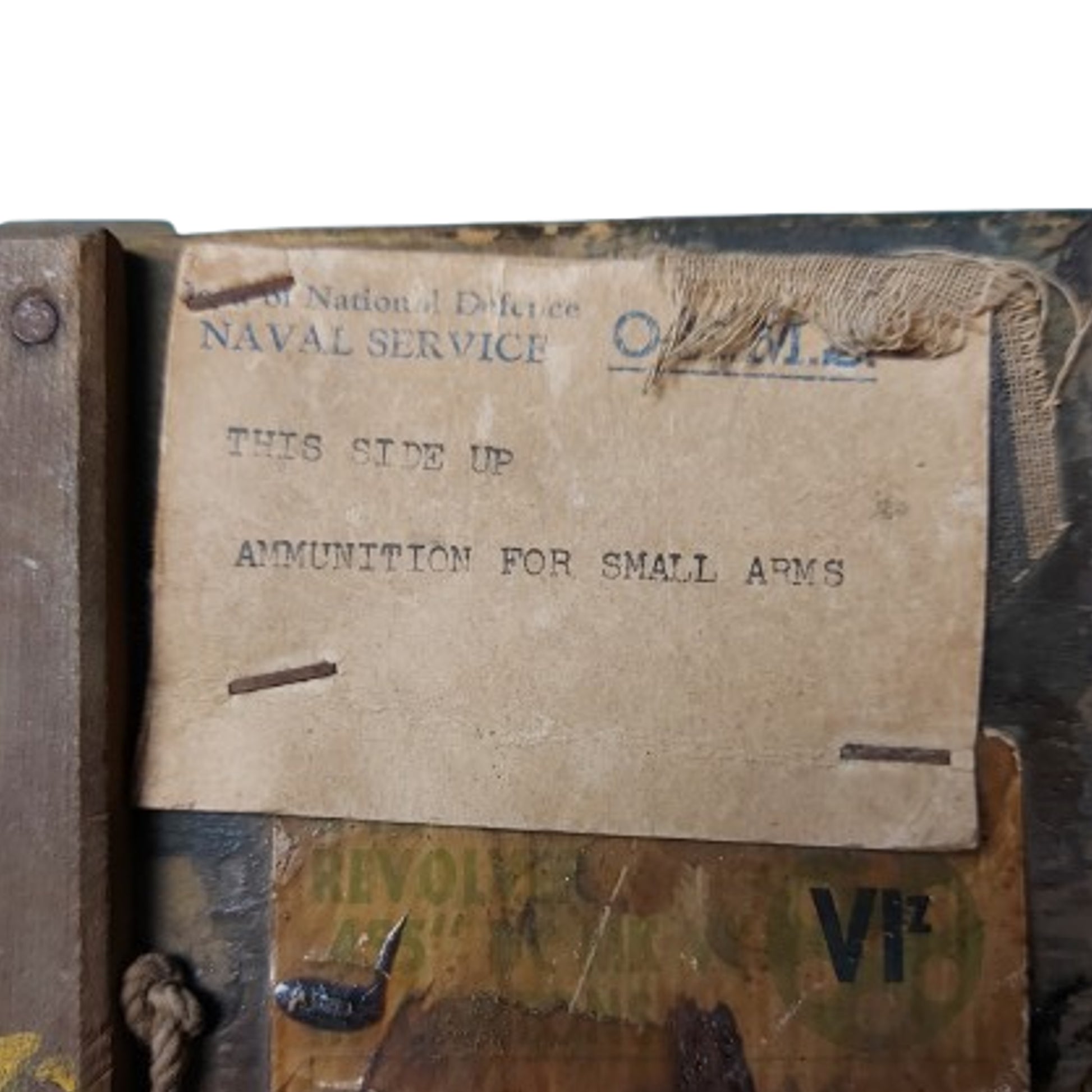 Wood construction ammunition crate measuring 9 by 6 1/4 by 4 3/4 inches with metal insert and lid in place to the interior. Label in place to the interior metal lid reading "240 Cartridges Revolver DC Mk.VI" and dated November 20, 1944. Exterior labels in place showing the same markings and date, with a heavy paper label to the top marked for Naval Service. A not often seen WW2 item. SKU: 63378