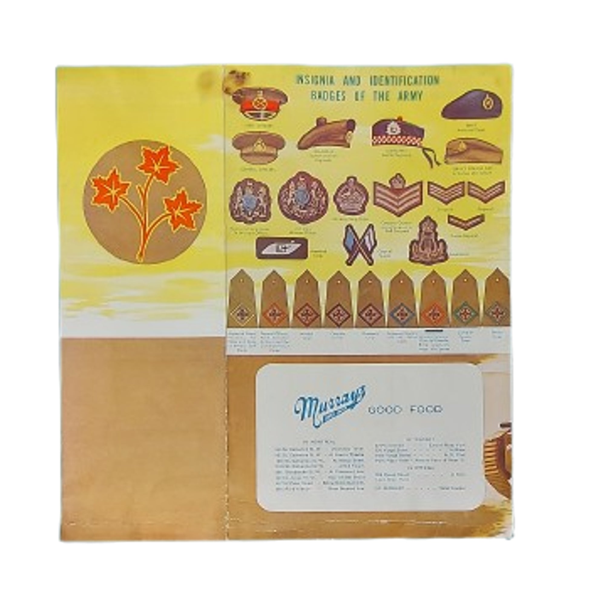 Printed in color on heavy paper stock, measuring 6 1/4 by 10 1/2 inches in the folded position, and 16 1/2 by 10 1/2 in the open position. Front shows military ranks of the Canadian Army, along with a Canadian Officer and a Canadian tank below. The reverse showing insignia and Identification badges Of The Army. From Murray's Lunch Limited, Toronto and Ottawa. SKU: 63252