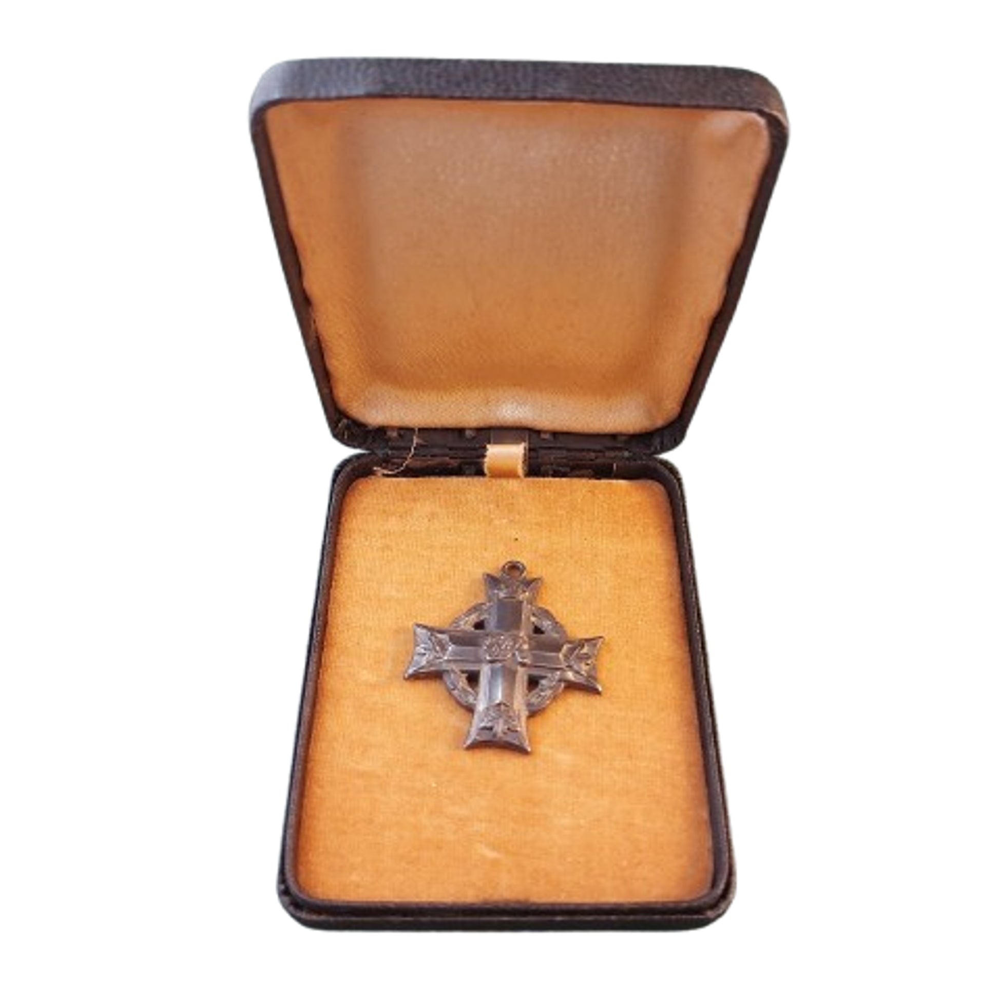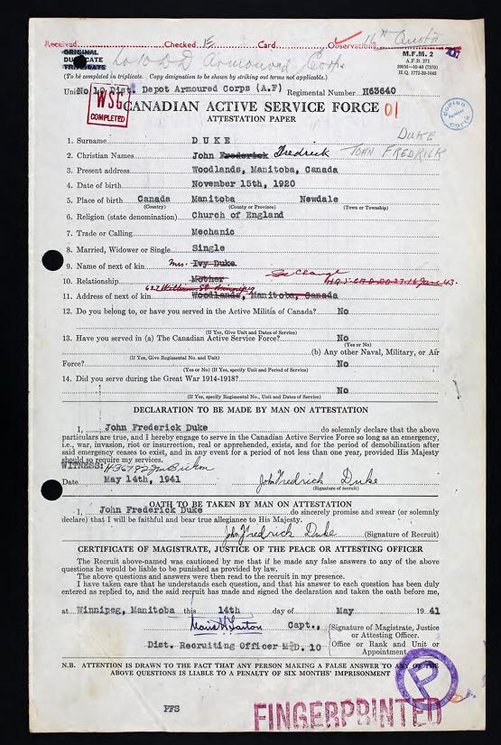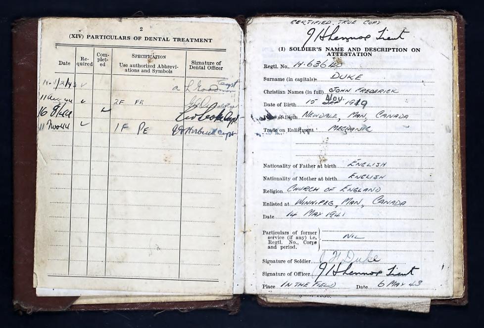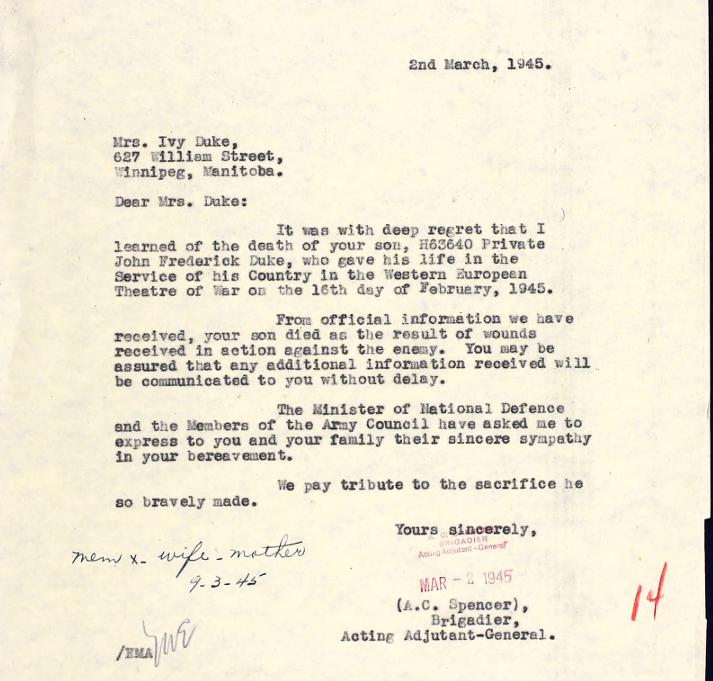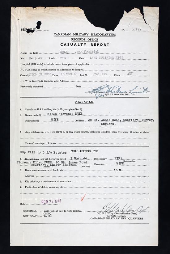 WW2 Canadian Cased Memorial Cross, named to H-63640, Pte. J.F. Duke. Marked Sterling to the bottom reverse and in case. No ribbon or suspension in place. John Frederick Duke from Newdale Manitoba enlisted in Winnipeg Manitoba on May 14, 1941, and served overseas with the Lake Superior Regiment. Listed as a tank driver / mechanic, he was KIA in Holland on February 16th, 1945 and is buried at the Nijmegen Canadian Military Cemetery, 4 miles S.E. of Nijmegen, Holland. The medal is accompanied with a copy of portions of the service file from the LAC website. SKU: 63386