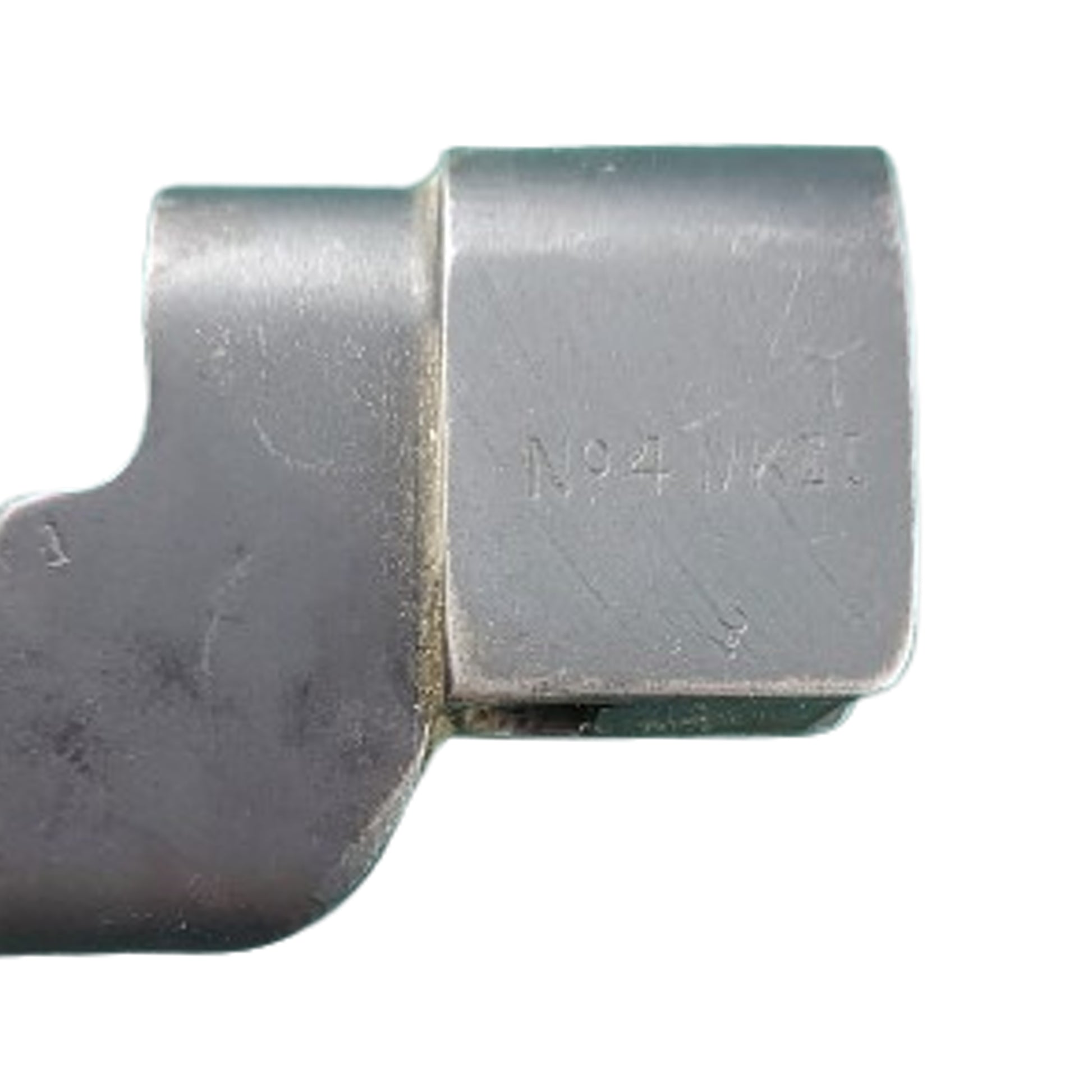 All steel construction bayonet for use with the WW2 SMLE #4 Mk.I bolt action service rifle in 303 British. Measures 9 7/8 inches in length and stamped No.4 Mk.II to the one side with an LB stamp for Long Branch (Toronto Canada). With steel field scabbard in place. Some spotting and discoloration to the blade present. Working release button in place. SKU: 63312