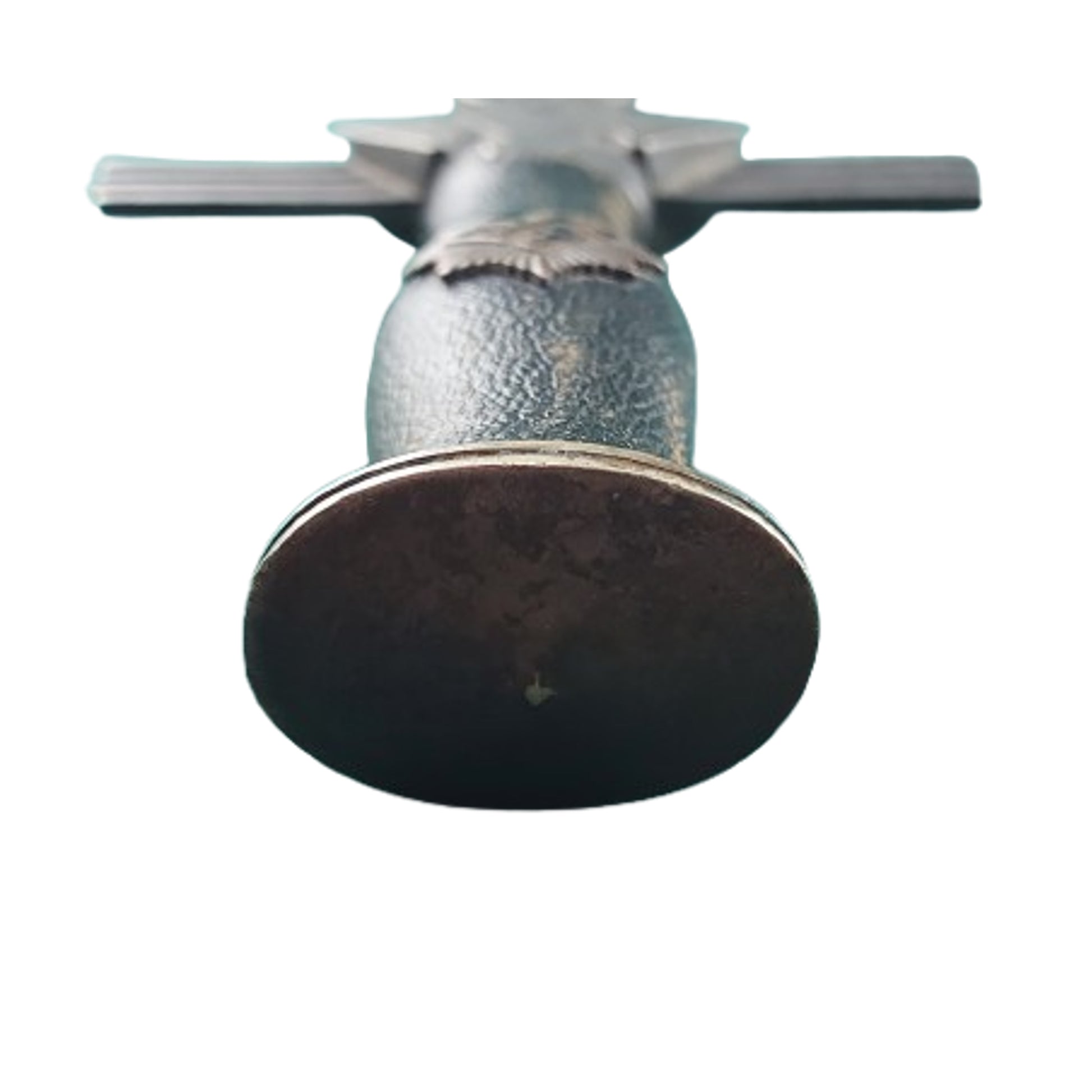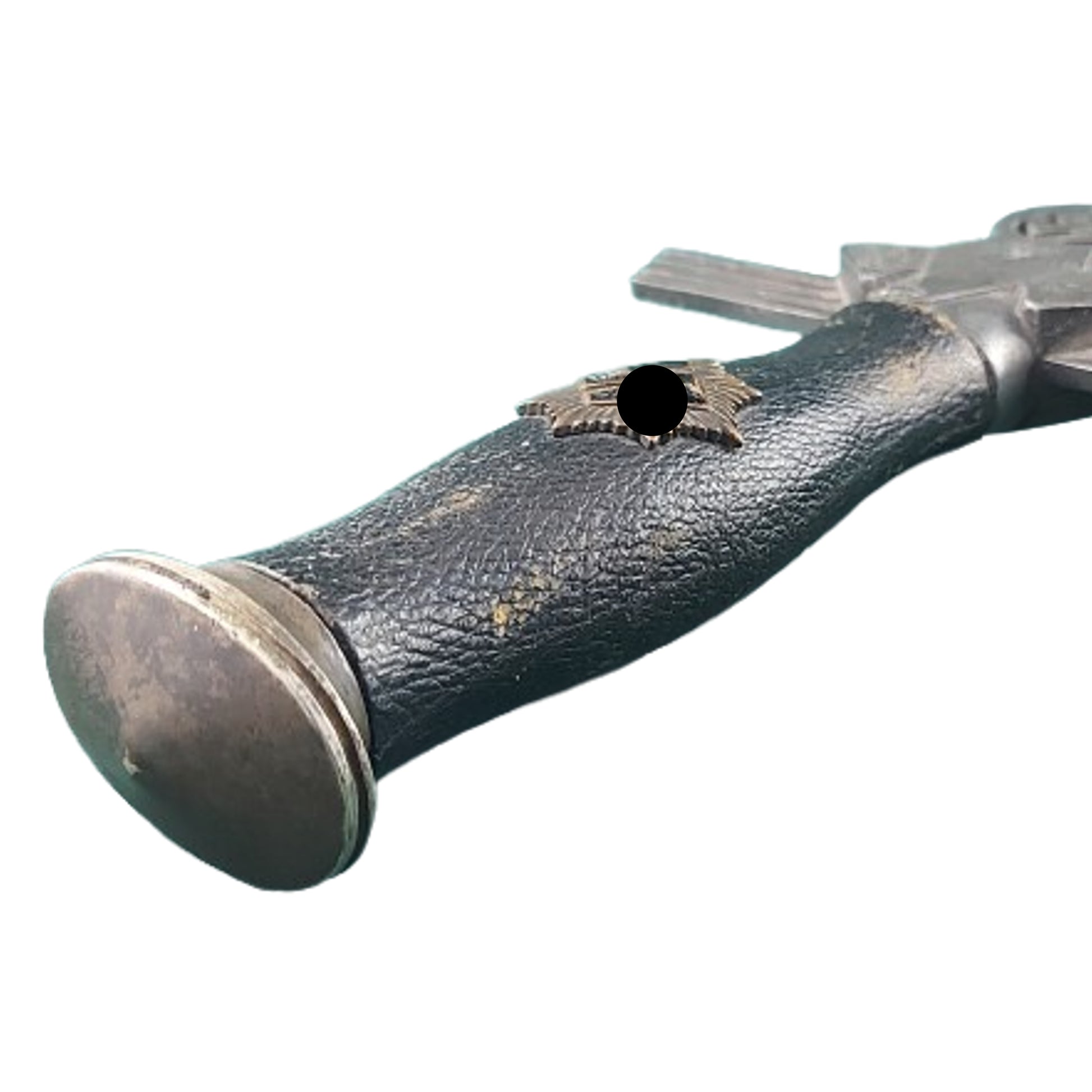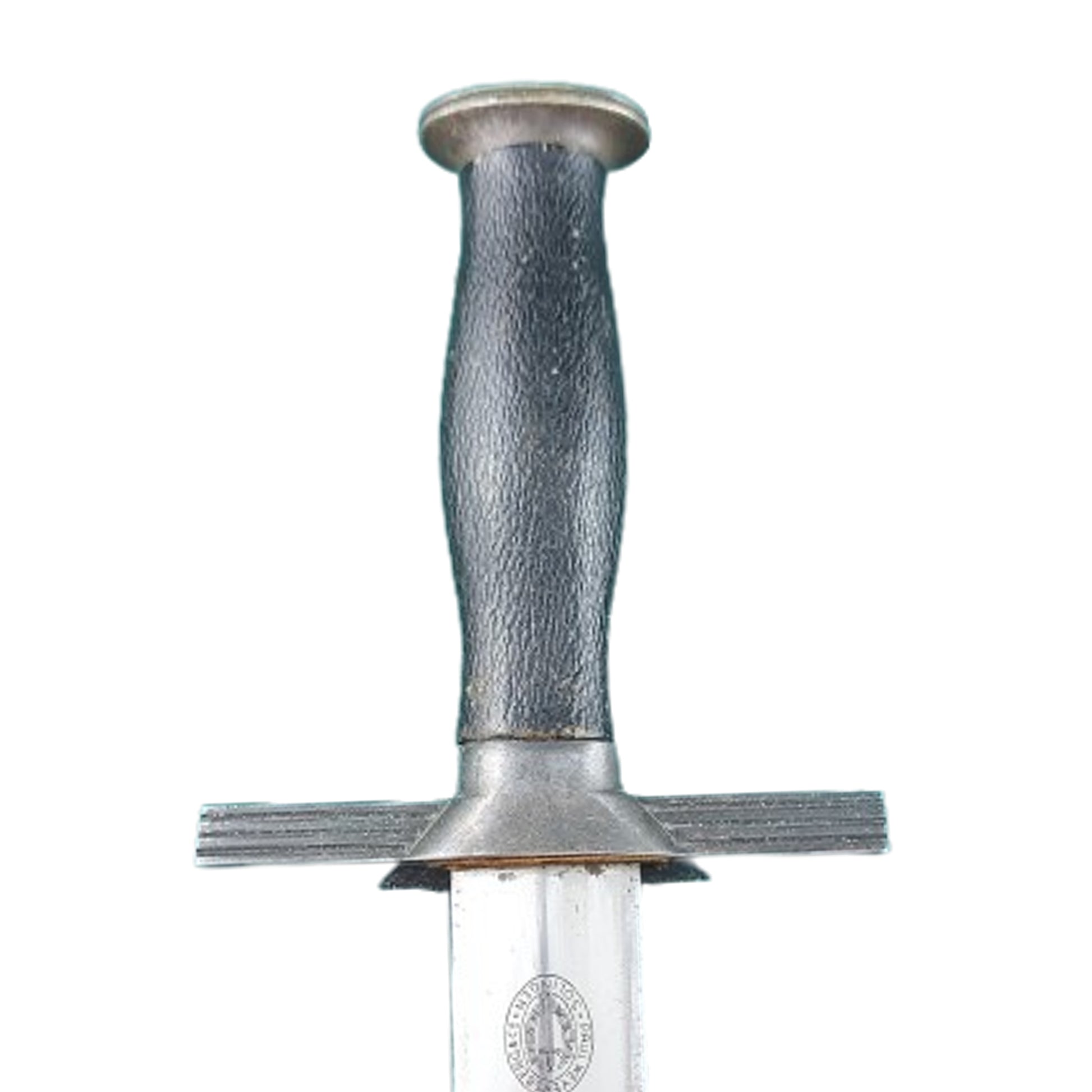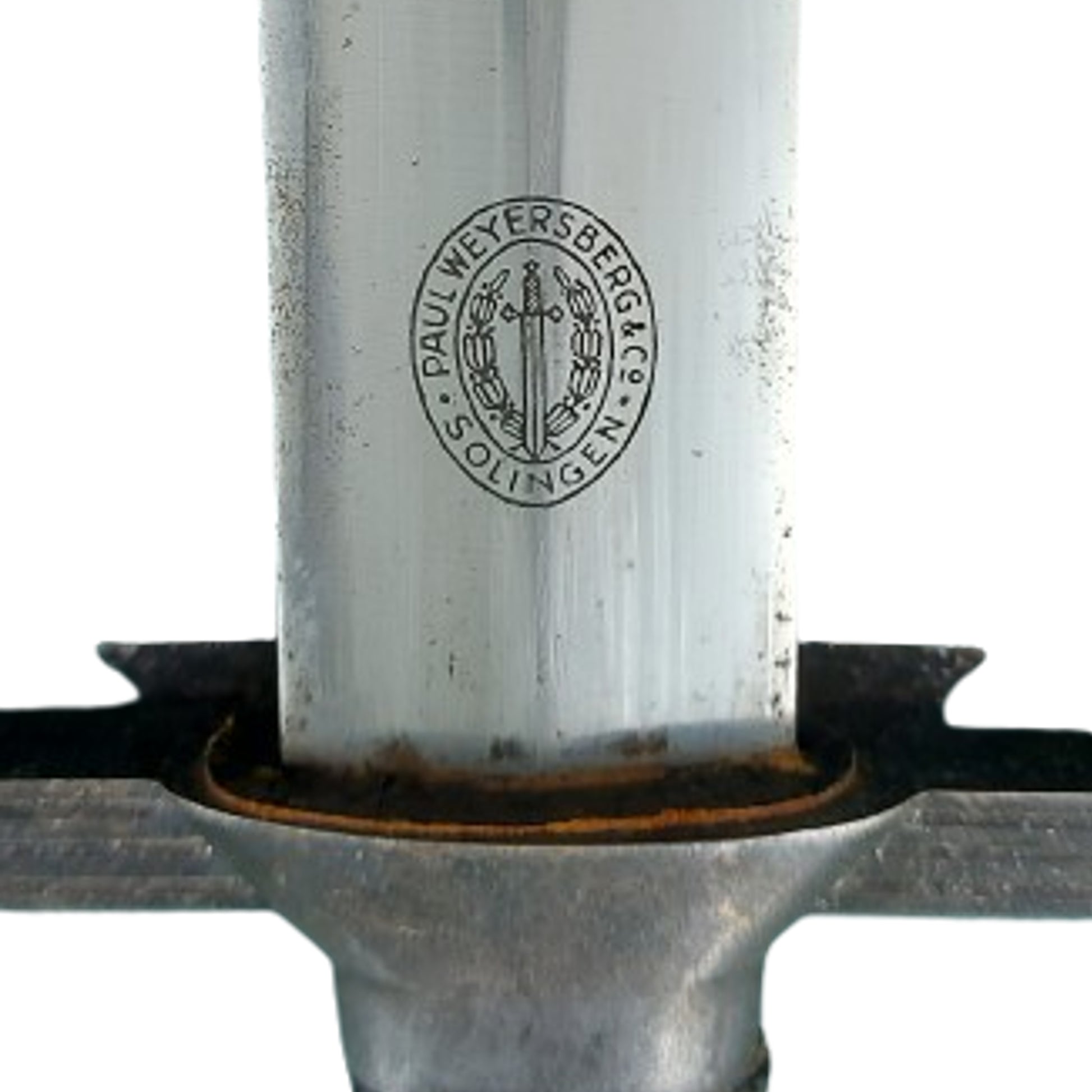 Measuring 13 1/4 inches overall with an 8 3/4 inch, double edged, nickel/silver plated, drop forged steel construction blade with a raised central ridge. Maker marked to the one side of the blade, Paul Weyersburg Solingen within an oval sword and wreath logo. Leather washer in place above the Art Deco cross guard with long, straight extended grooved arms, and large eagle with circled symbol below. The black Moroccan Leather wrapped grip with the RLB sunburst symbol to the center that has some chipping and finish loss to the black enameled on brass symbol.  White metal oval pommel cap in place at the top of the grip. The metallic metal scabbard with 2 suspension rings that fits tightly to the blade is also covered in black Moroccan Leather as well. The blade is in very good condition, being mostly bright, with some areas of discoloration, but no signs of  polishing or sharpening. The blade and grip have a slight looseness, with the cross guard and pommel cap having an even and original aged finish, as does the metal parts of the scabbard, with some spotting and speckling to the medal parts. Some light handling marks and finish loss to the leather of the grip, as well as to the one outer edge of the scabbard. For more information please see GERMAN KNIFE AND SWORD MAKERS by J. Anthony Carter. SKU: 63290