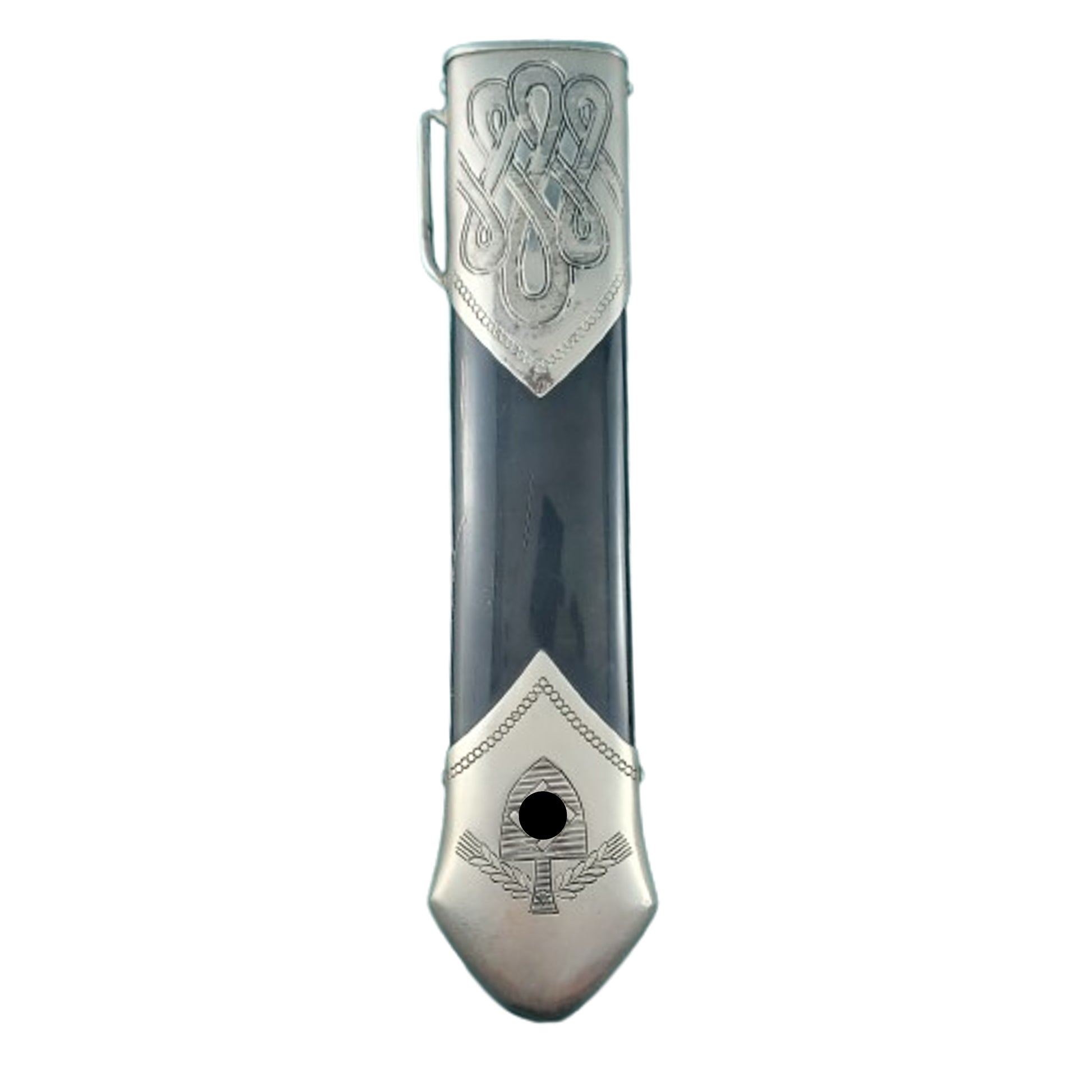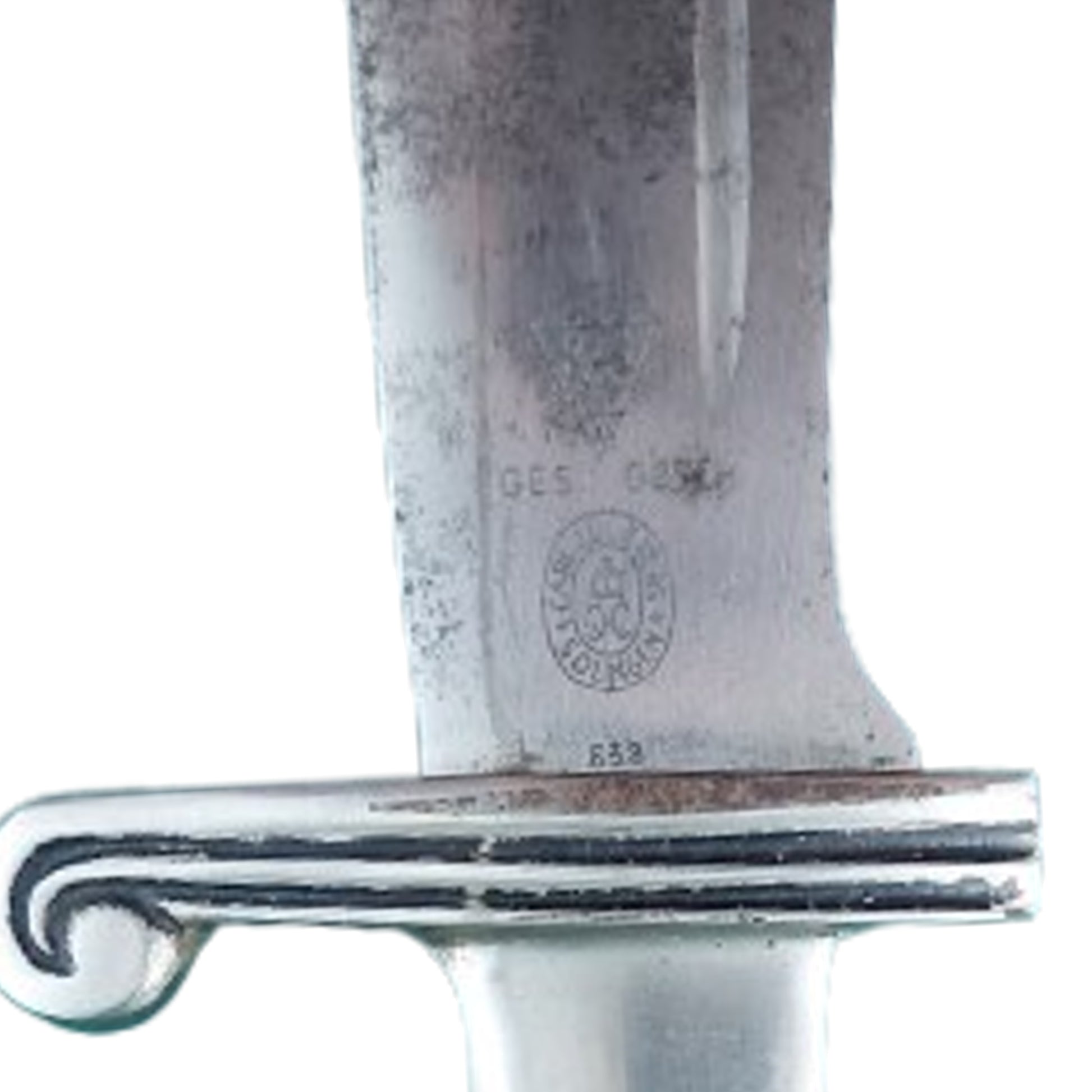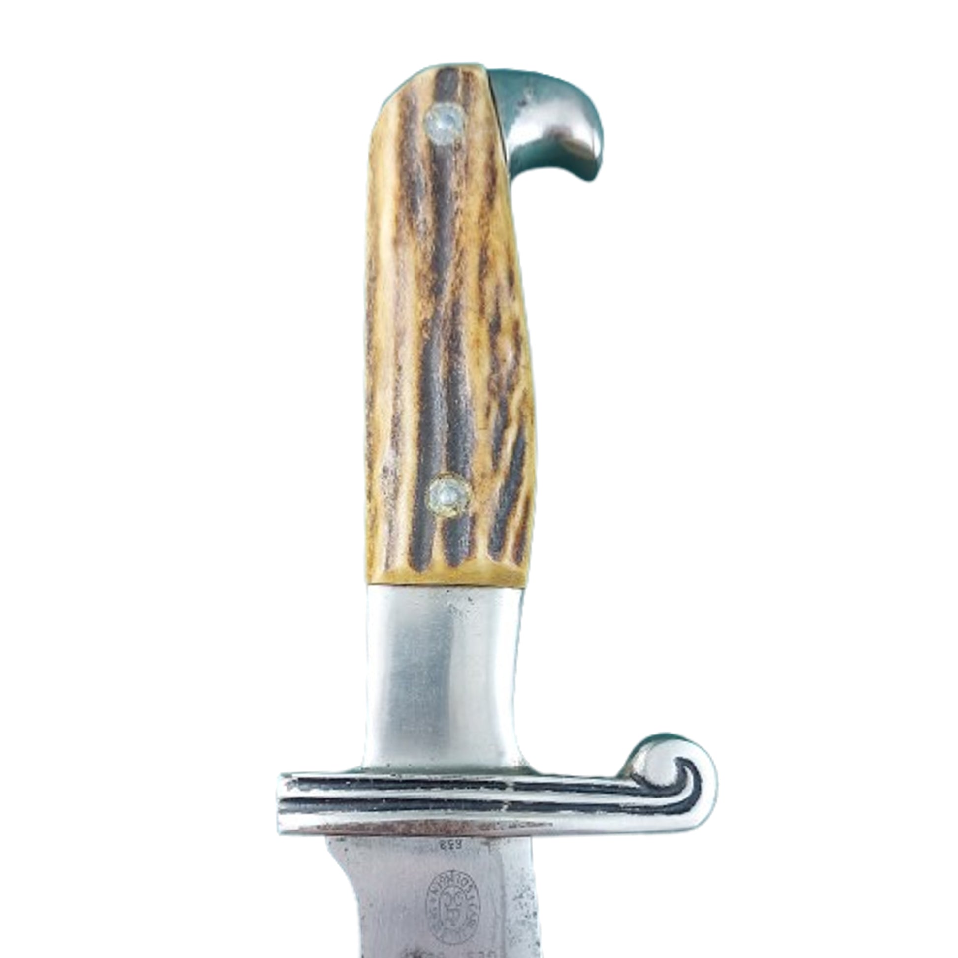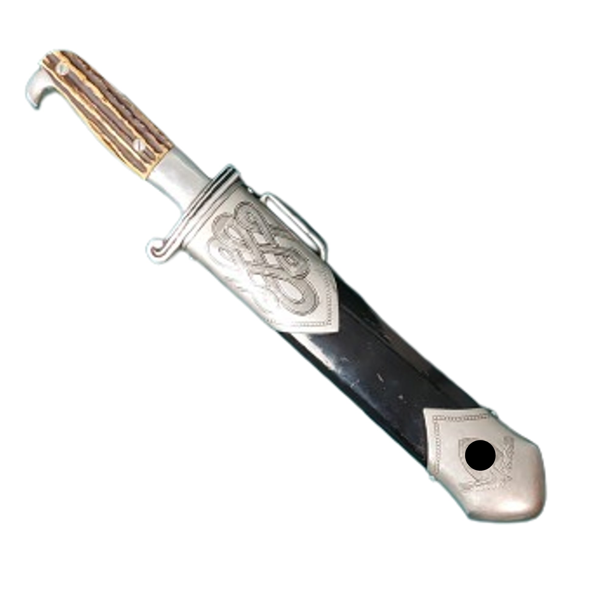 WW2 German RAD Subordinates Hewer with a broad drop forged steel, nickel/silver plated bowie style blade measuring 9 1/2 inches in length. One side of the blade shows the acid etched RAD motto, "Arbeit adelt" in Germanic script, with the opposite side having the makers name and logo, Julkrebs Solingen, with GES. Gesch above along with a triangular RADJ inspection mark. Natural stag grip panels in place secured by 2 mounting bolts, and a magnetic sheet metal scabbard with nickel/silver top and bottom. Blade shows spotting and discoloration with the grips being in very good condition and the scabbard showing expected wear and use. Dagger fits tightly to the scabbard. SKU: 63354