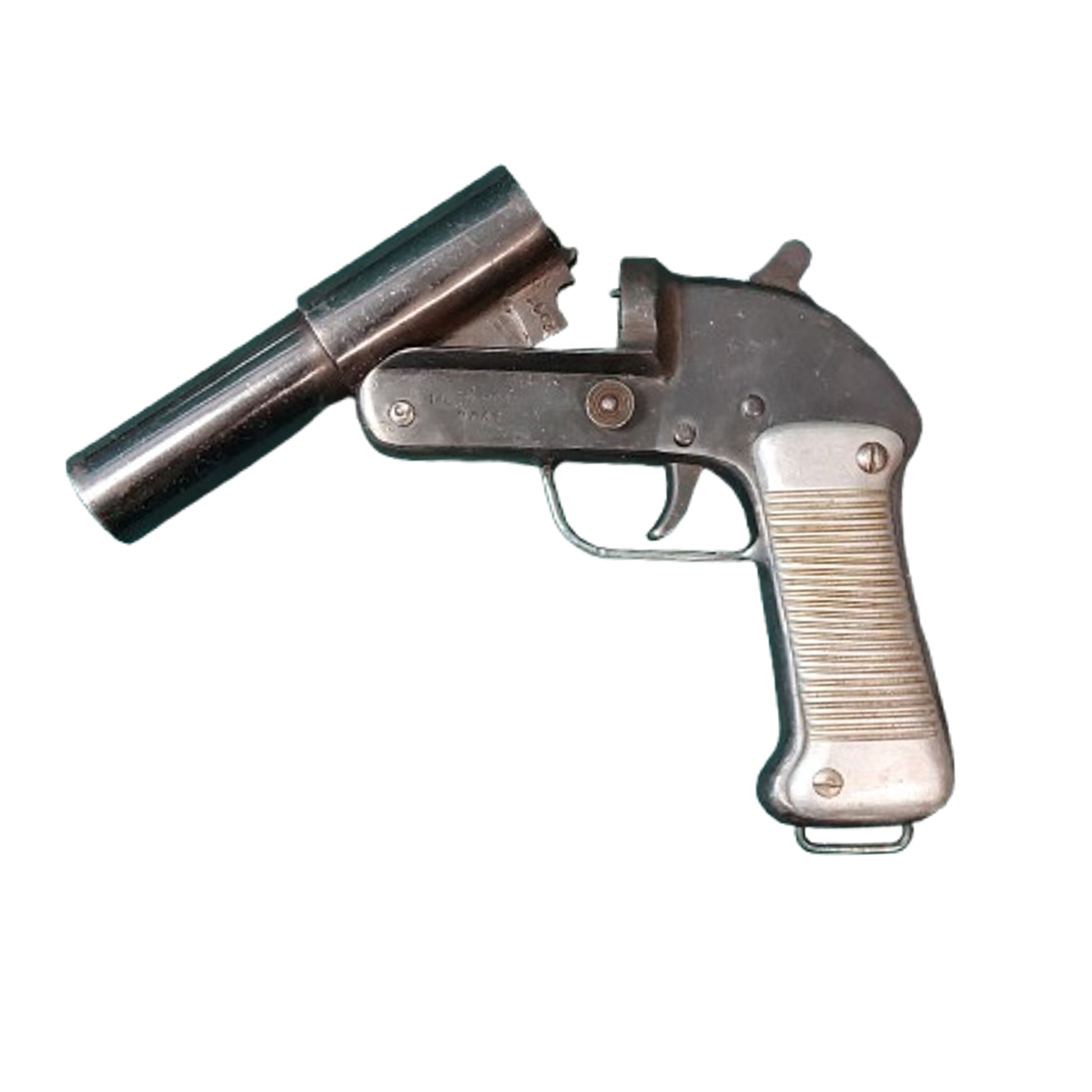 All steel construction, single shot, single action, break open flare pistol with a stepped steel barrel for the 26.5mm flare cartridge. Grooved aluminum 2 piece grip panels with rectangular steel lanyard ring below. Manufacture stamped to the left side and dated 1945 with serial number below. Functions correctly. SKU: 63639 CANADIAN SALES ONLY.