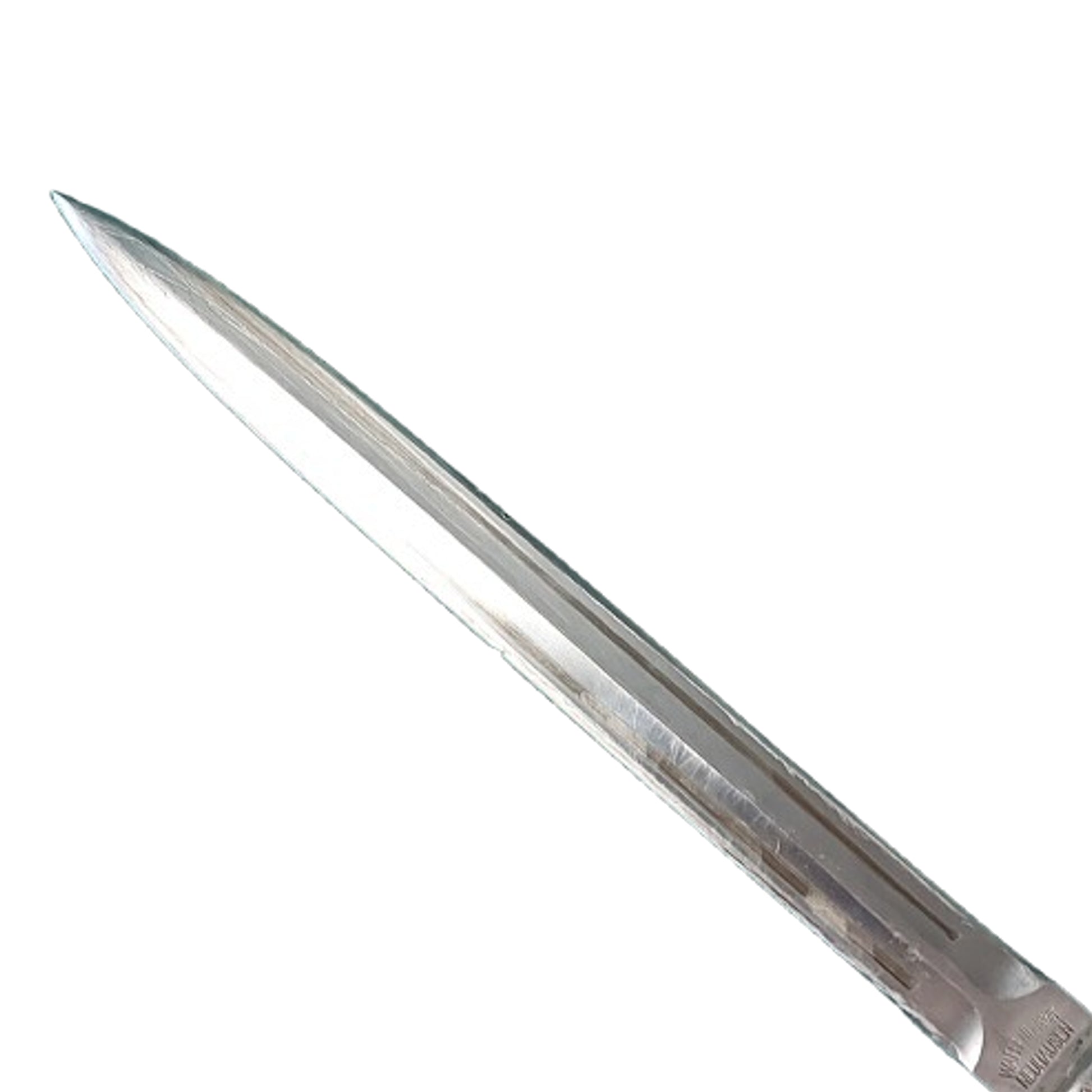 Measuring 17 inches overall with a 12 inch double edged blade that is maker marked Waffenfabrik Neuhausen to the one side, and serial numbered to the cross guard with a Swiss Cross stamp to one end. 2 piece wood grip panels with functioning release button. Housed in the steel field scabbard with the leather frog that is manufacture marked to the reverse and dated 1941. Shows some handling marks to the grip panels and a couple of small nicks to one edge of the blade. SKU: 63475