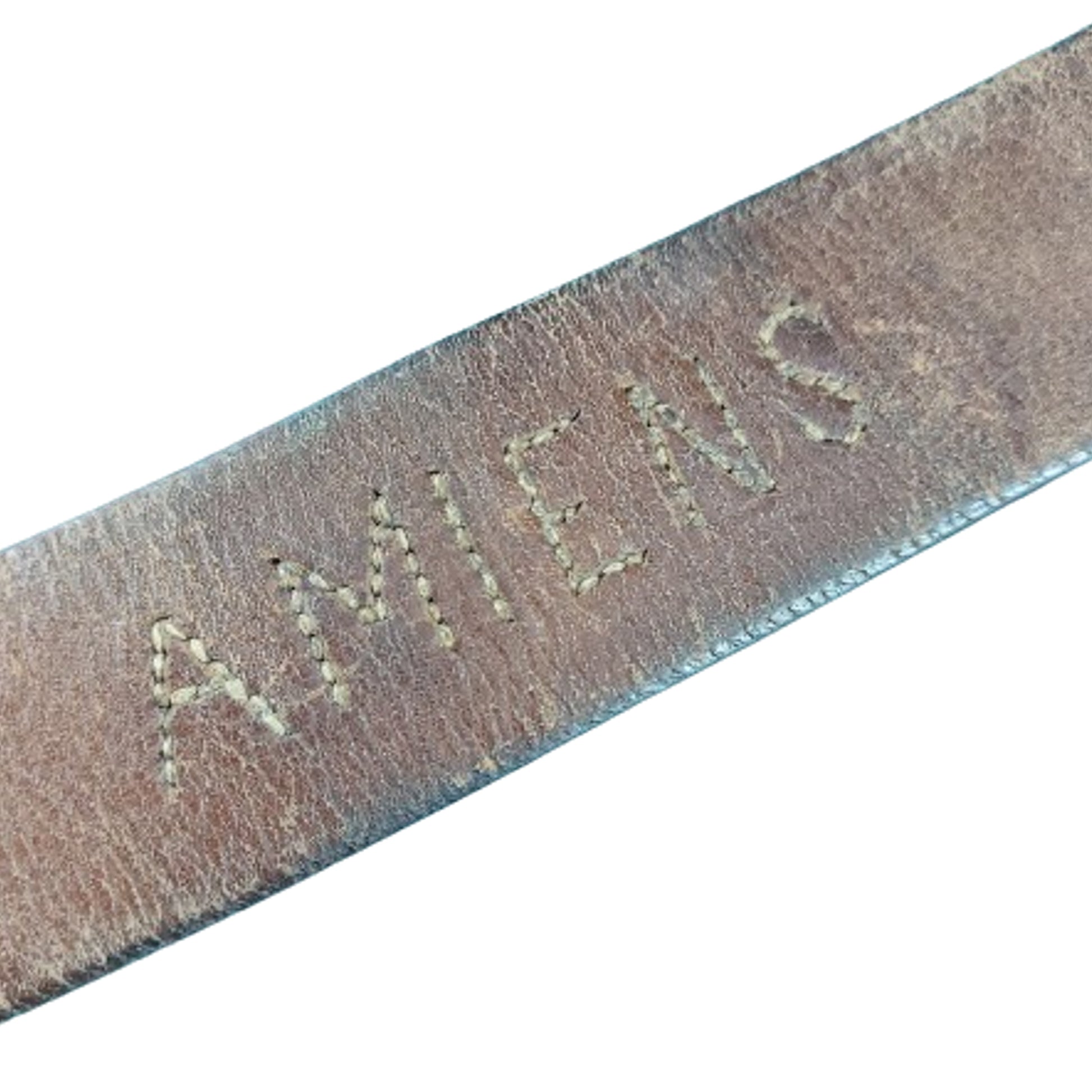 One-piece construction wartime M1915 Prussian stamped metal box belt buckle, factory painted field grey with a raised front. To the reverse is its raised buckle catch, and a metal prong bar with dual prongs that is attached to the issue adjustable length leather belt that measures 34 inches over all with the metal buckle catch in place. To the back center of the belt, punched and stitched is "AMIENS", the place of capture by a Canadian soldier.