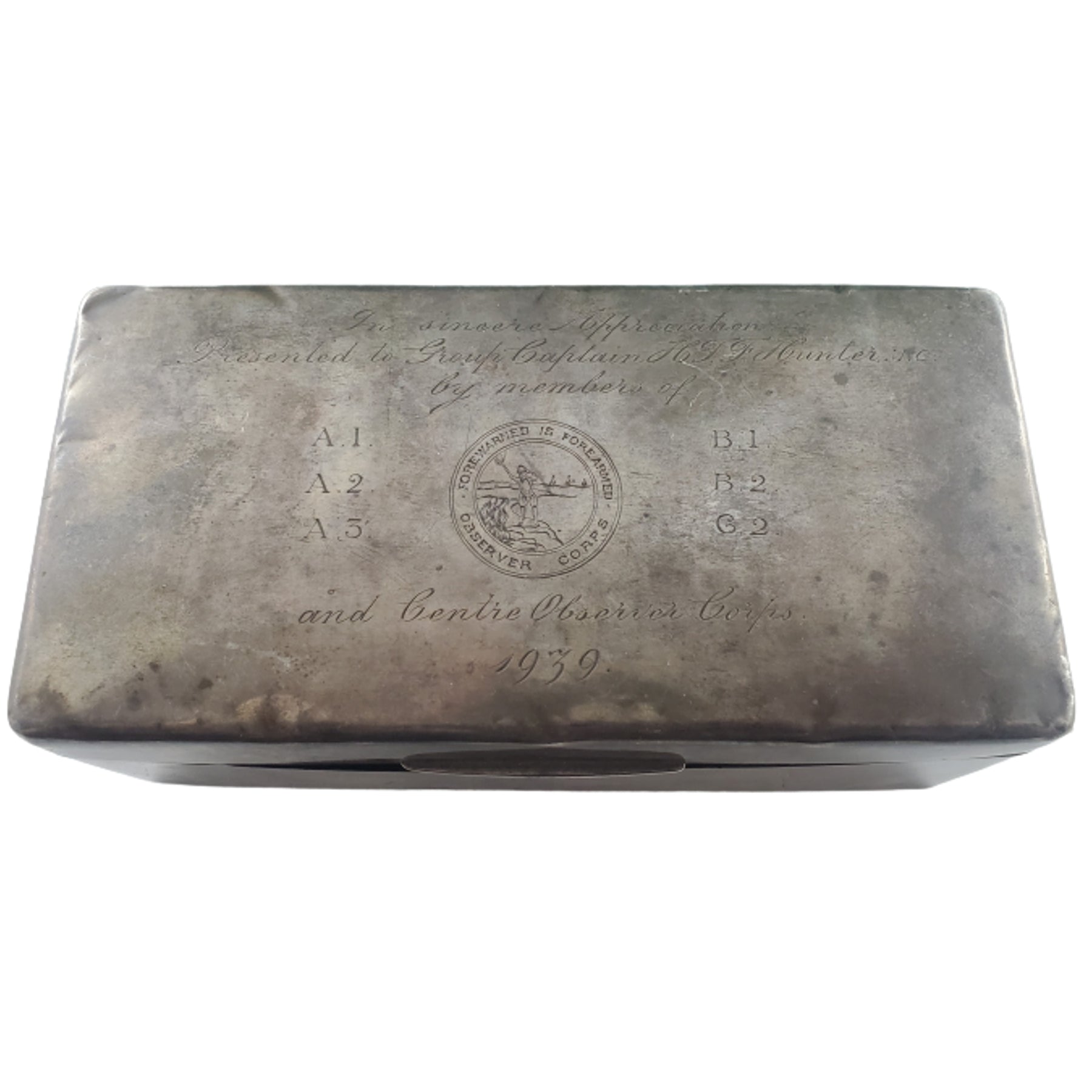 Measuring 7 1/2 by 3 1/2 by 2 12 inches, with Sterling Silver hallmarks to the side and cedar lined to the interior. Hinged lid engraved to the top, "In Sincere Appreciation Presented To Group Captain H.T.F. Hunter M.C. by members of A1, A2, A3, B1. B2, B3 and Centre Observer Corps, 1939. With likeness of the Royal Observer Corps Crest to the center. Some slight denting present. SKU: 58996