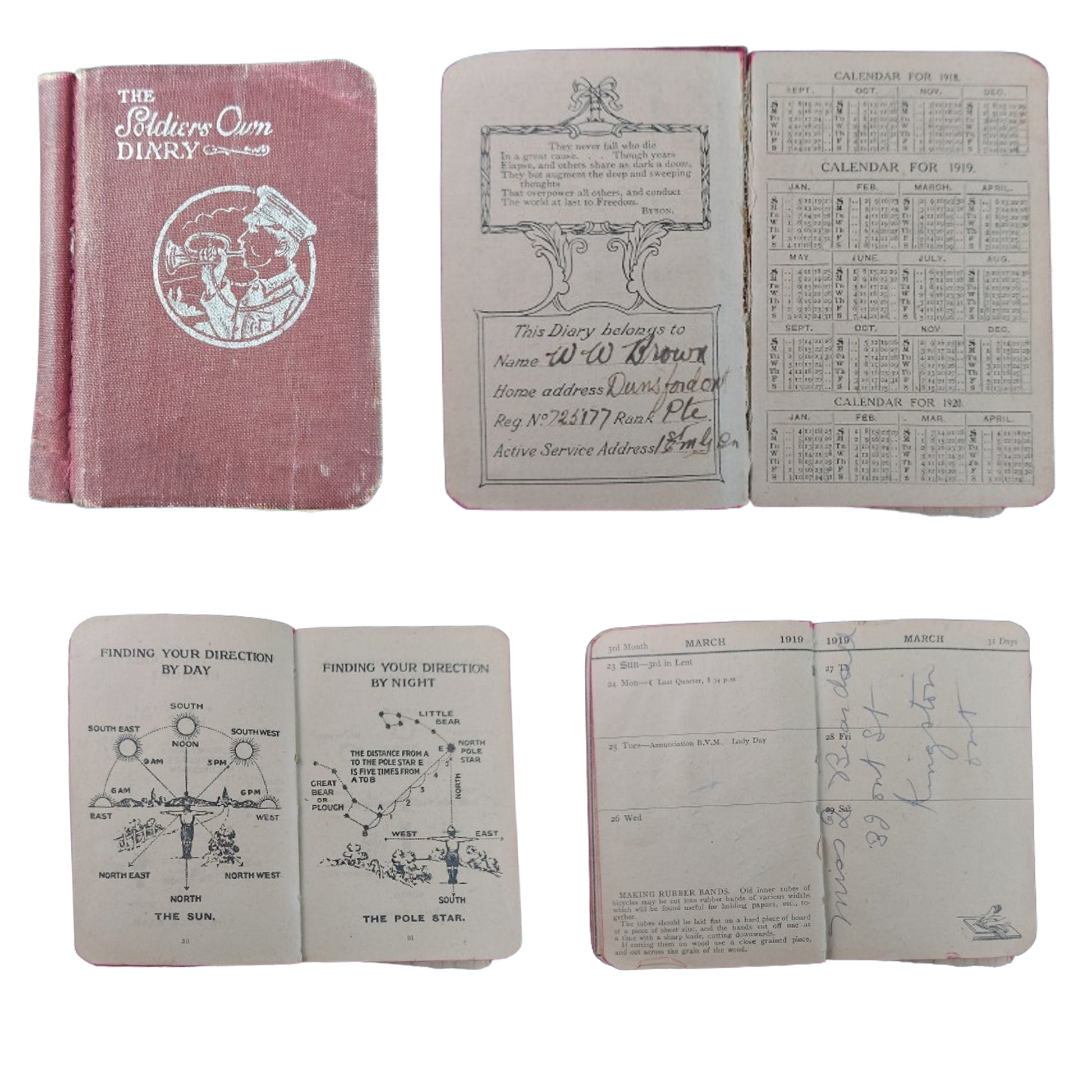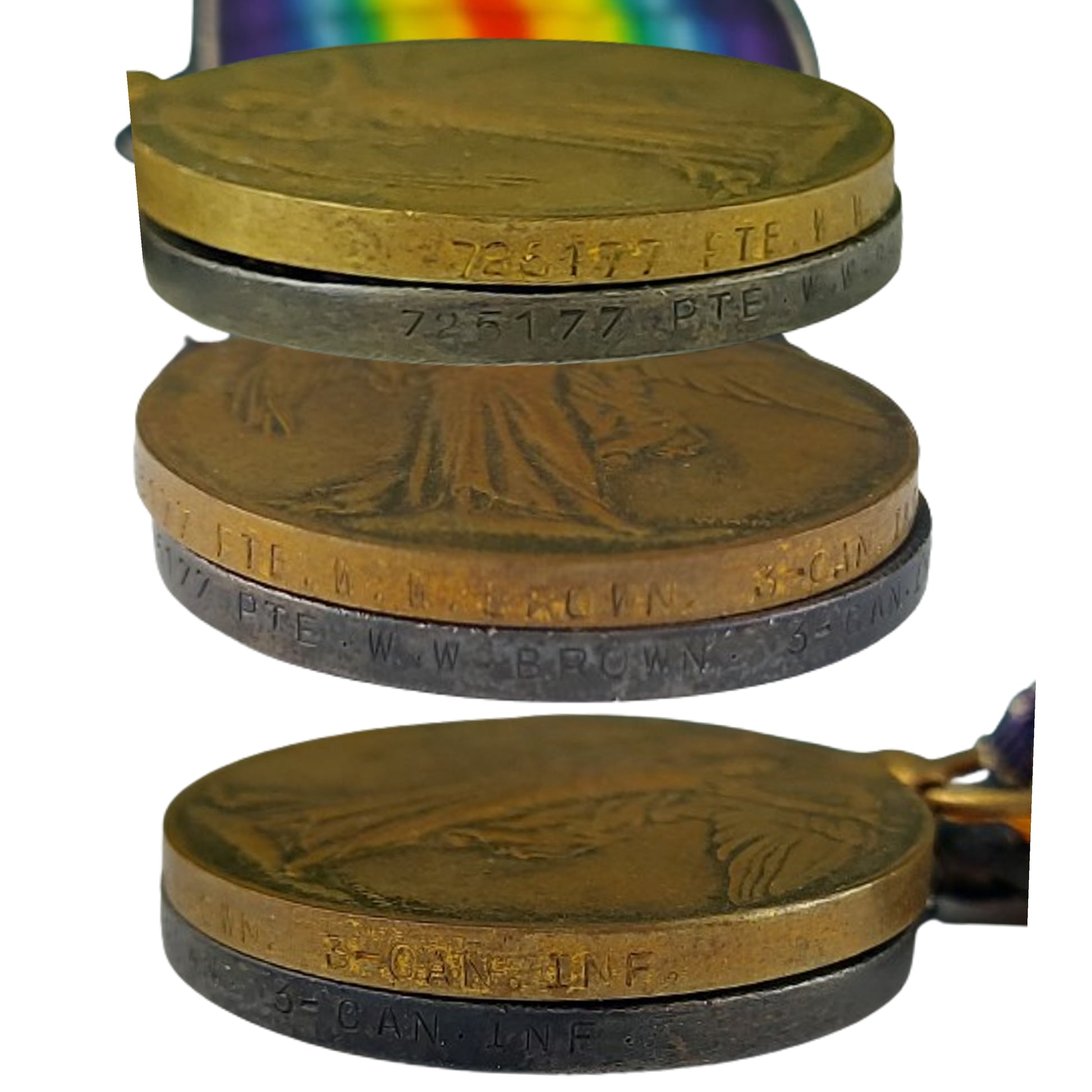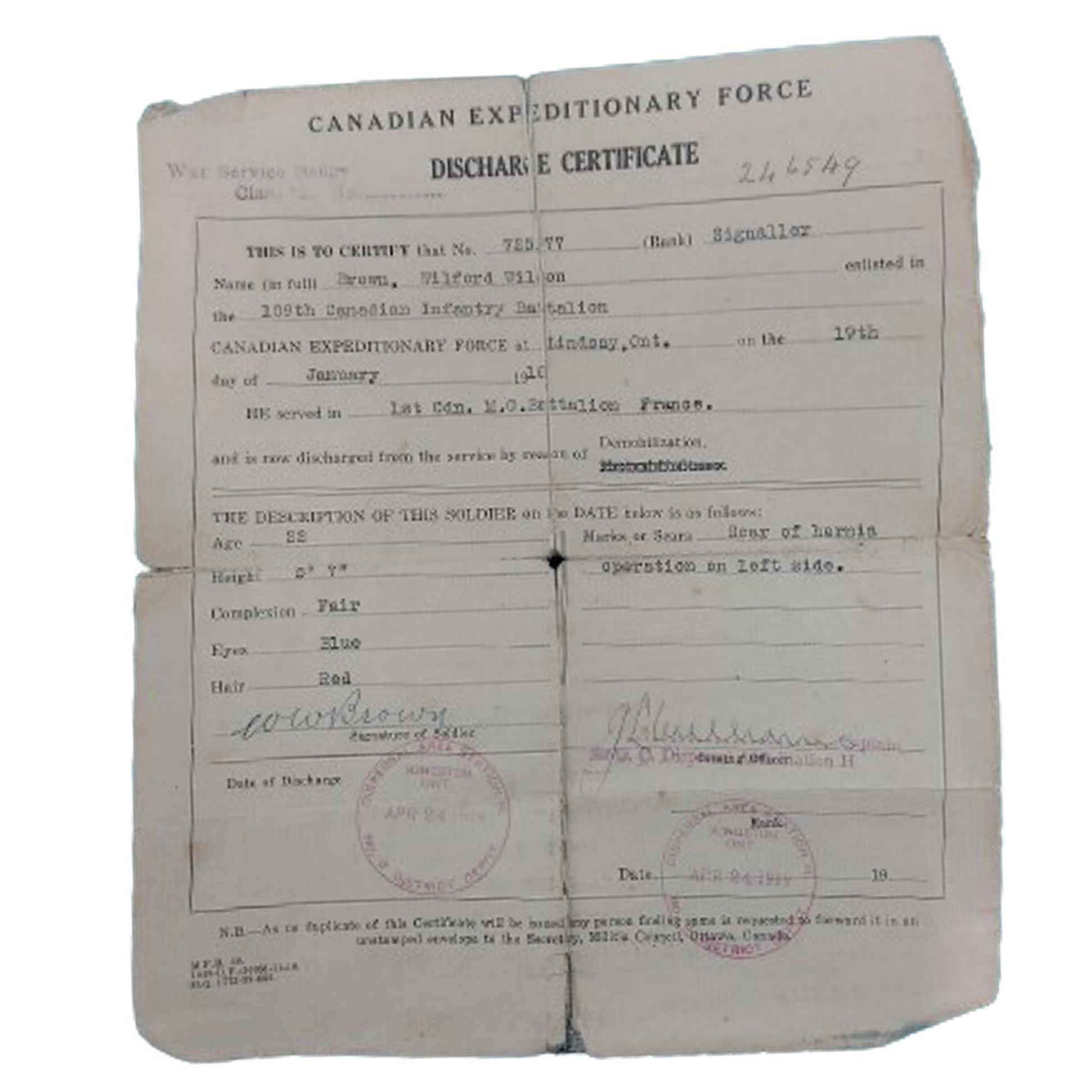 WW1 Canadian CEF Uniform grouping named and belonging to 725177 Pte. Wilford W. Brown, 2nd Company, 1st Canadian Machine Gun Battalion, Signals Section,  comprising of the WW1 5 button, 4 pocket front Canadian Tunic with faint period applied naming the interior, and with all buttons in place. Stand up double hook closure collar with a matching pair of brass collars in place. Cloth division patches to both upper sleeves with an enamel on brass Signals trade badge to the one lower sleeve, and an embroidered on cloth 3 year service chevron to the opposite sleeve. Matching pair of brass CANADA shoulder titles in place to each epaulette. His soft trench cap present with the brass Canadian Machine Gun Corps badge in place to the front, and 2 small brass British side buttons securing the leather chin strap. The cap is Broadarrow marked to the interior. The uniform and cap is also with a set of 3 medals being the Victory Medal and BWM (British War Medal) both correctly named to 725177 PTE. W.W. BROWN 3-CAN. INF. along with a CEF Victoria's County Welcome To returned Soldiers Medal. Along with this is his Force Service At The Front Pin, numbered to the reverse with the Certificate Issued With War Service Badge and his colored enamel on brass CMGC button hole pin. His original linen Discharge Paper is present showing that he served overseas in France with the 1st Cdn. M.G. Battalion, and having enlisted in the 109th Battalion, and was discharged on April 24, 1919. A small green holder containing 6 period black and white photographs present, with him being presumed to be in the photos. A framed Buckingham Palace letter wishing him a safe return home, along with his named  "Soldiers Own Diary" and his personal pocket diary with many period entered hand applied entries talking about his time on his way to the front, and overseas. With this is also a framed period black and white glass front photo measuring 12 by 10 inches of the Signalers School printed in Folkstone England. Private Brown is identified in this photo and positioned 4th from the right, second row from the back. The set is accompanied with copied from the LAC website file along with personal research, and also research describing, verifying, and proving the tunic. SKU: 61421