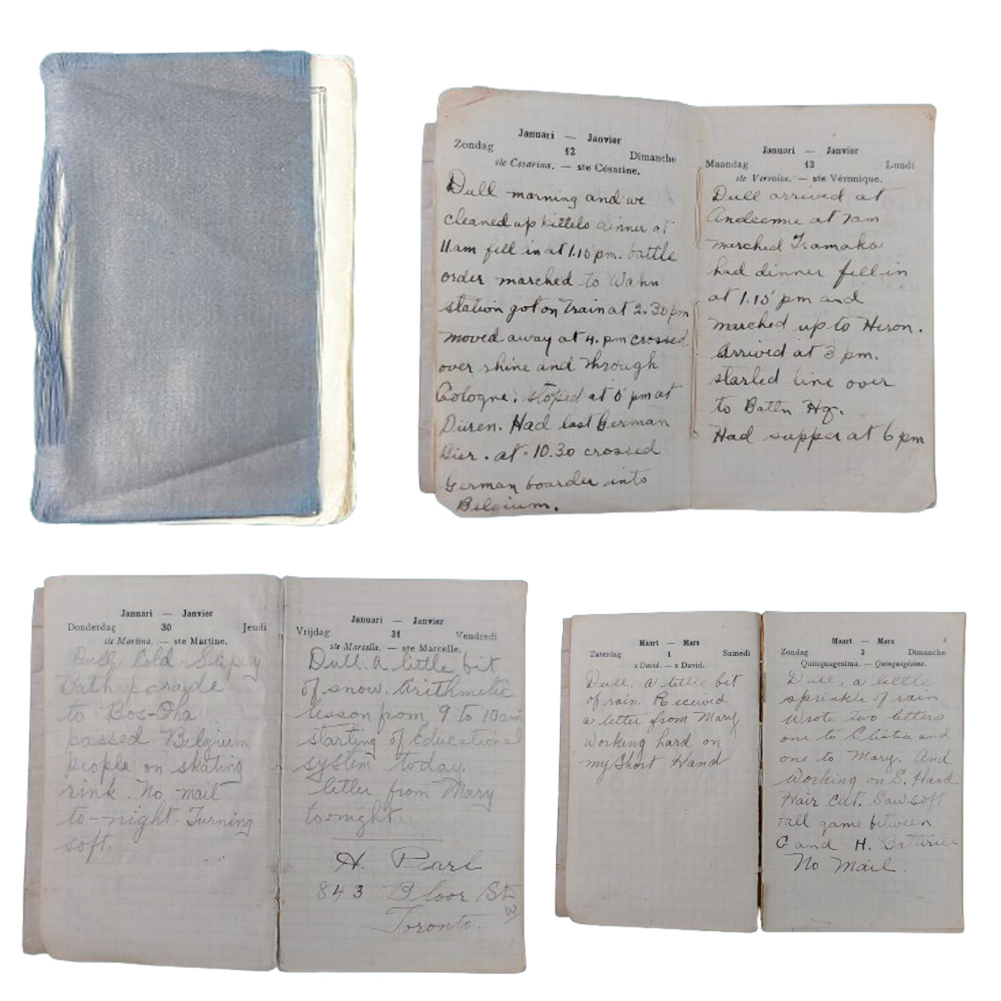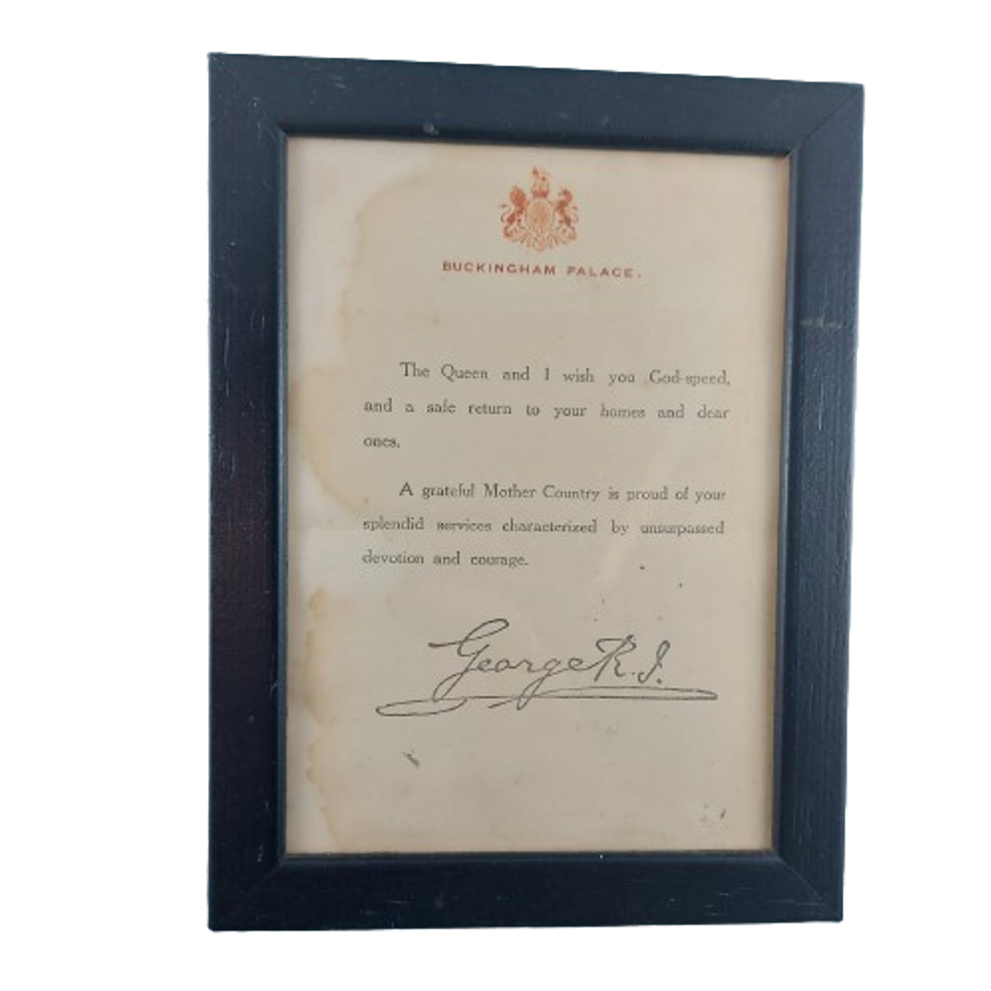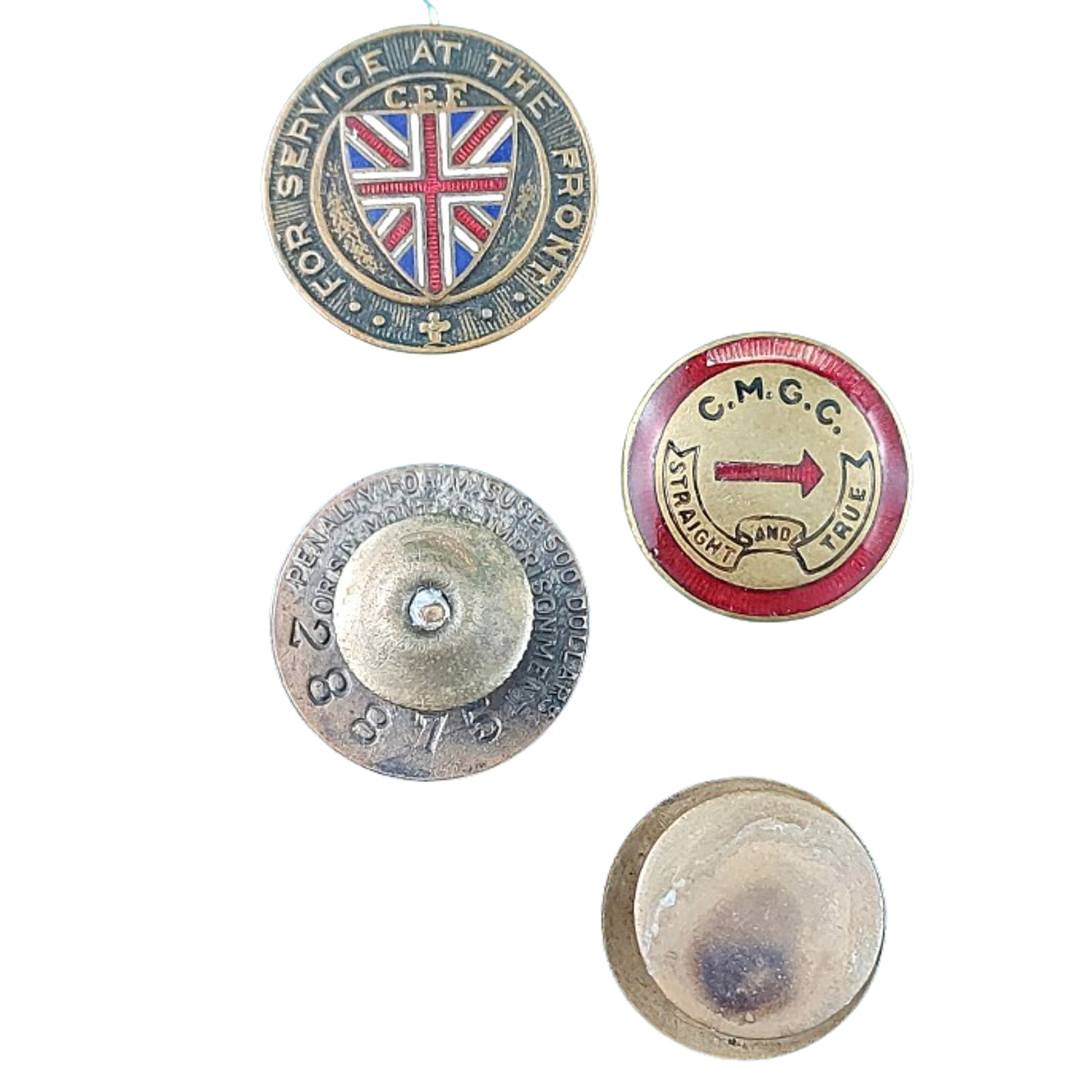 WW1 Canadian CEF Uniform grouping named and belonging to 725177 Pte. Wilford W. Brown, 2nd Company, 1st Canadian Machine Gun Battalion, Signals Section,  comprising of the WW1 5 button, 4 pocket front Canadian Tunic with faint period applied naming the interior, and with all buttons in place. Stand up double hook closure collar with a matching pair of brass collars in place. Cloth division patches to both upper sleeves with an enamel on brass Signals trade badge to the one lower sleeve, and an embroidered on cloth 3 year service chevron to the opposite sleeve. Matching pair of brass CANADA shoulder titles in place to each epaulette. His soft trench cap present with the brass Canadian Machine Gun Corps badge in place to the front, and 2 small brass British side buttons securing the leather chin strap. The cap is Broadarrow marked to the interior. The uniform and cap is also with a set of 3 medals being the Victory Medal and BWM (British War Medal) both correctly named to 725177 PTE. W.W. BROWN 3-CAN. INF. along with a CEF Victoria's County Welcome To returned Soldiers Medal. Along with this is his Force Service At The Front Pin, numbered to the reverse with the Certificate Issued With War Service Badge and his colored enamel on brass CMGC button hole pin. His original linen Discharge Paper is present showing that he served overseas in France with the 1st Cdn. M.G. Battalion, and having enlisted in the 109th Battalion, and was discharged on April 24, 1919. A small green holder containing 6 period black and white photographs present, with him being presumed to be in the photos. A framed Buckingham Palace letter wishing him a safe return home, along with his named  "Soldiers Own Diary" and his personal pocket diary with many period entered hand applied entries talking about his time on his way to the front, and overseas. With this is also a framed period black and white glass front photo measuring 12 by 10 inches of the Signalers School printed in Folkstone England. Private Brown is identified in this photo and positioned 4th from the right, second row from the back. The set is accompanied with copied from the LAC website file along with personal research, and also research describing, verifying, and proving the tunic. SKU: 61421