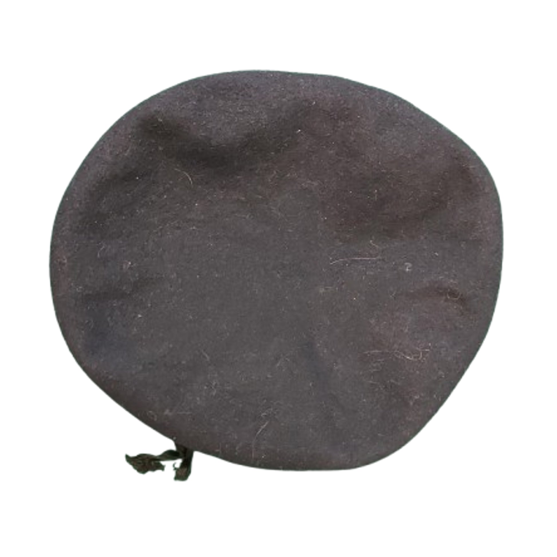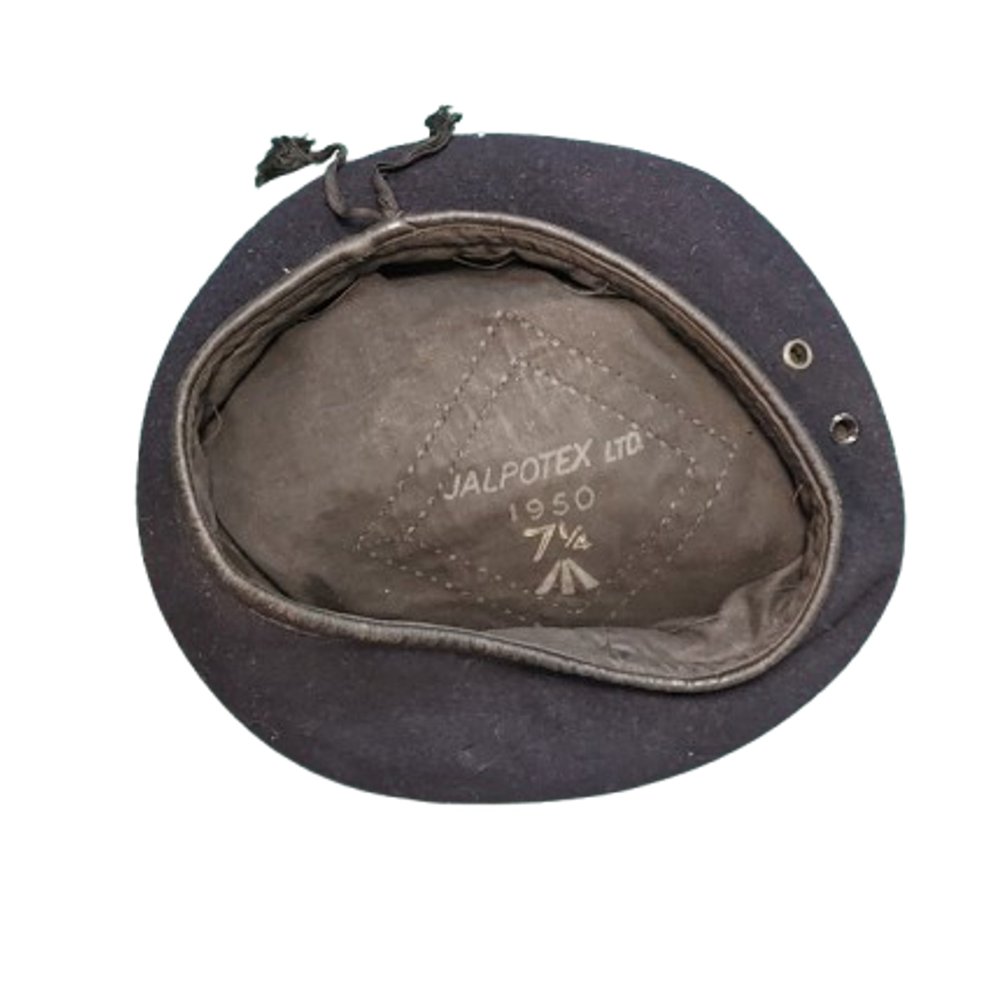 Black wool construction with leather headband and black material lining. Maker marked to the interior, Jalpotex Ltd. and dated 1950 with a large British Broadarrow. Marked as size 7 1/4. SKU: 63468