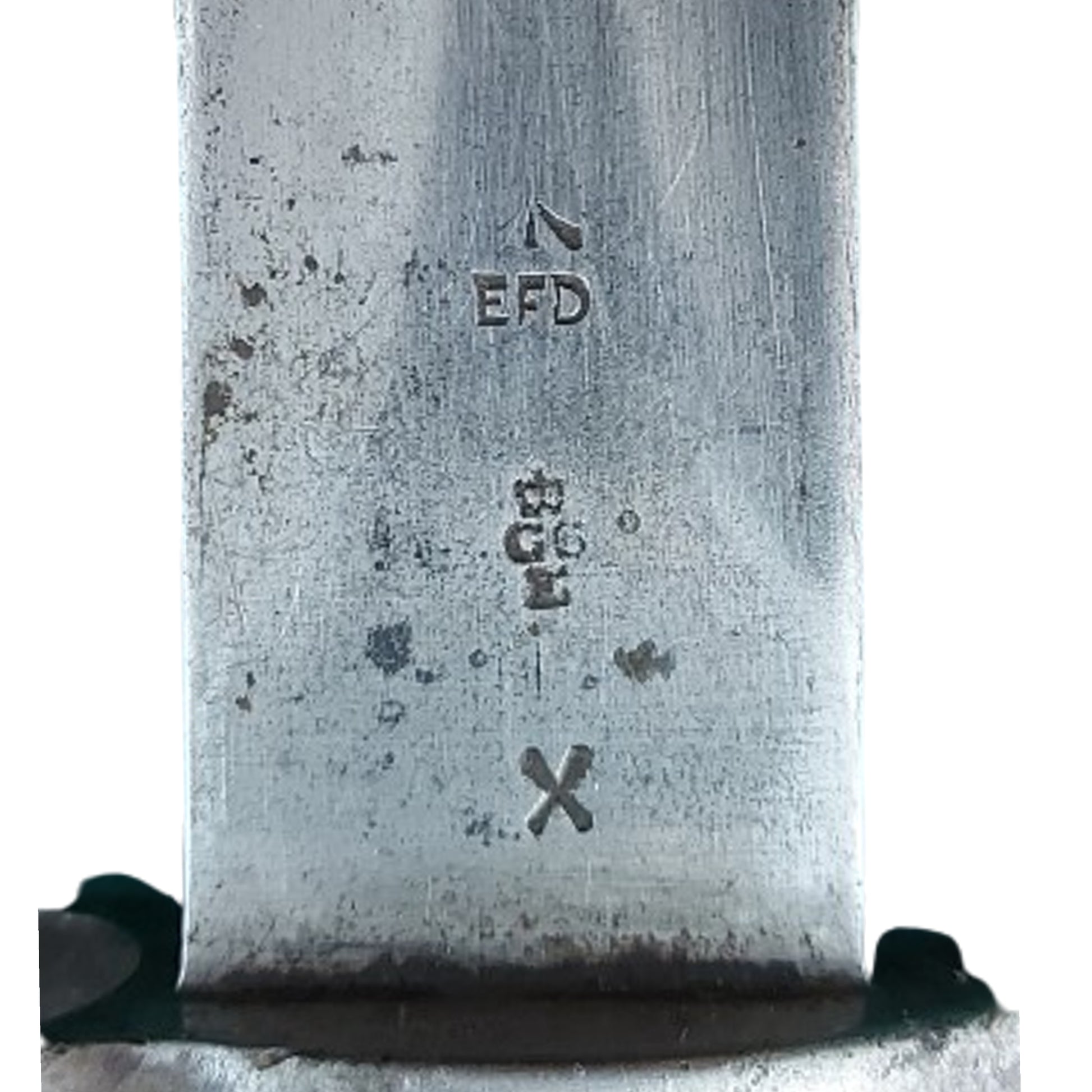 Measuring 16 3/4 inches overall with a 12 inch double edged blade that is manufacture marked EFD with British Broadarrow above and proof mark below. The opposite side shows the Victorian Crown and is date marked 3-'01 (March 1901) 2 piece wood grip panels with two brass pins and functioning release button in place. Some discoloration and age staining as to be expected. Bayonet only, no scabbard present. SKU: 63321