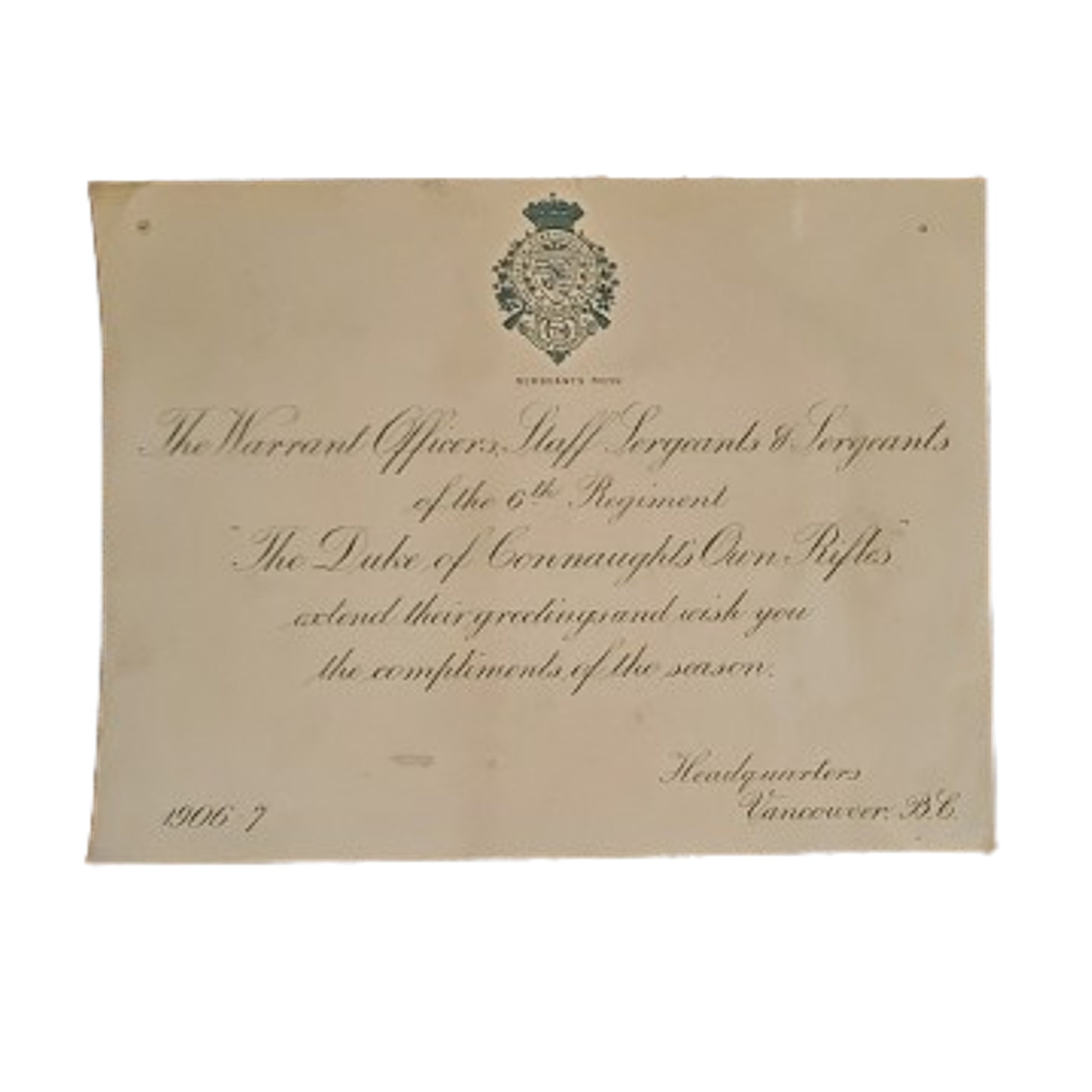 Single sided, printed on card stock, measuring 5 3/4 by 4 1/4 inches with a color likeness of the cap badge at the top. Reads, "The arrant Officers, Staff Sergeants, & Sergeants of the 6th Regiment The Duke Of Connaught's Own Rifles extend their greeting and wish you the compliments of the season. Headquarters, Vancouver, B.C. 1906-1907". SKU: 63347