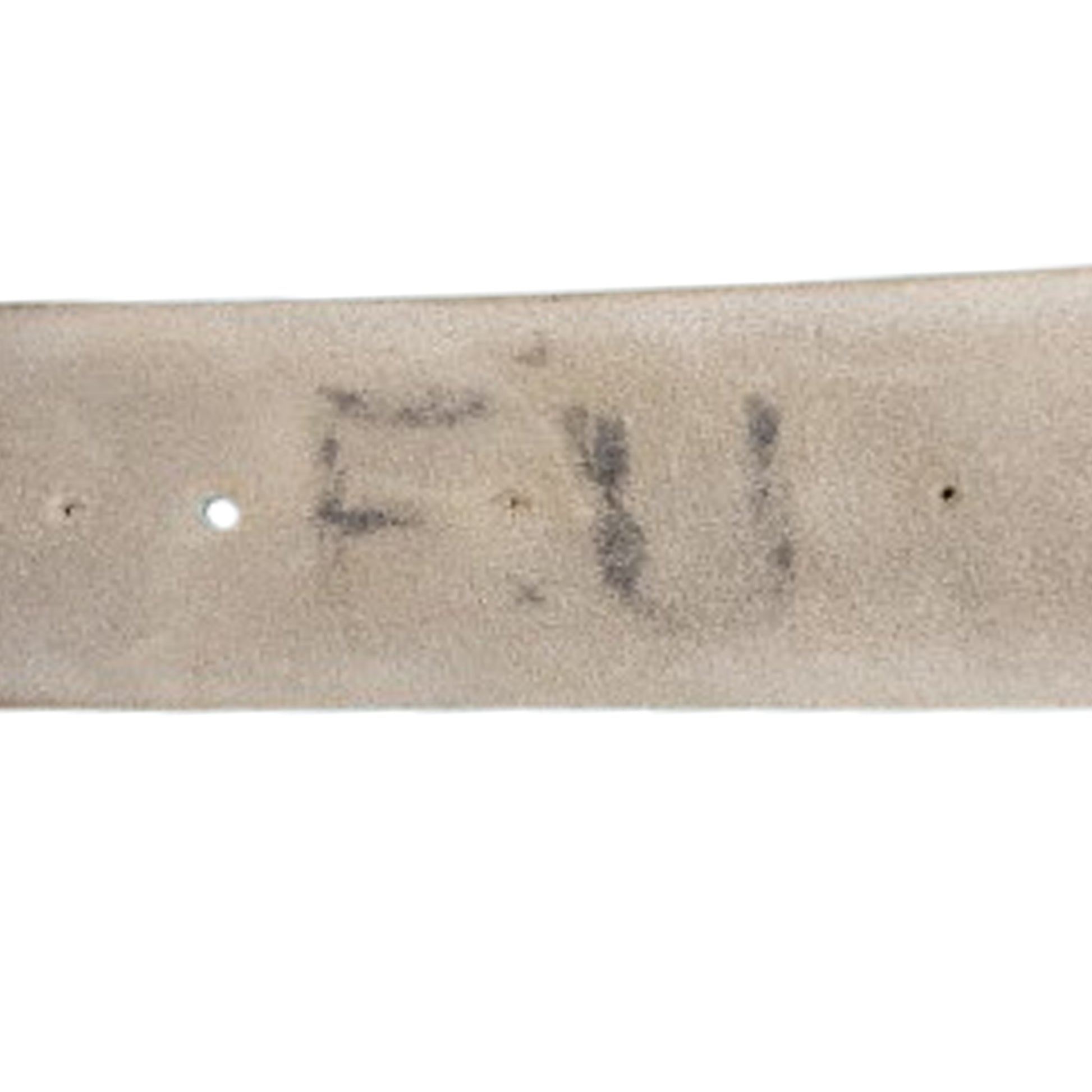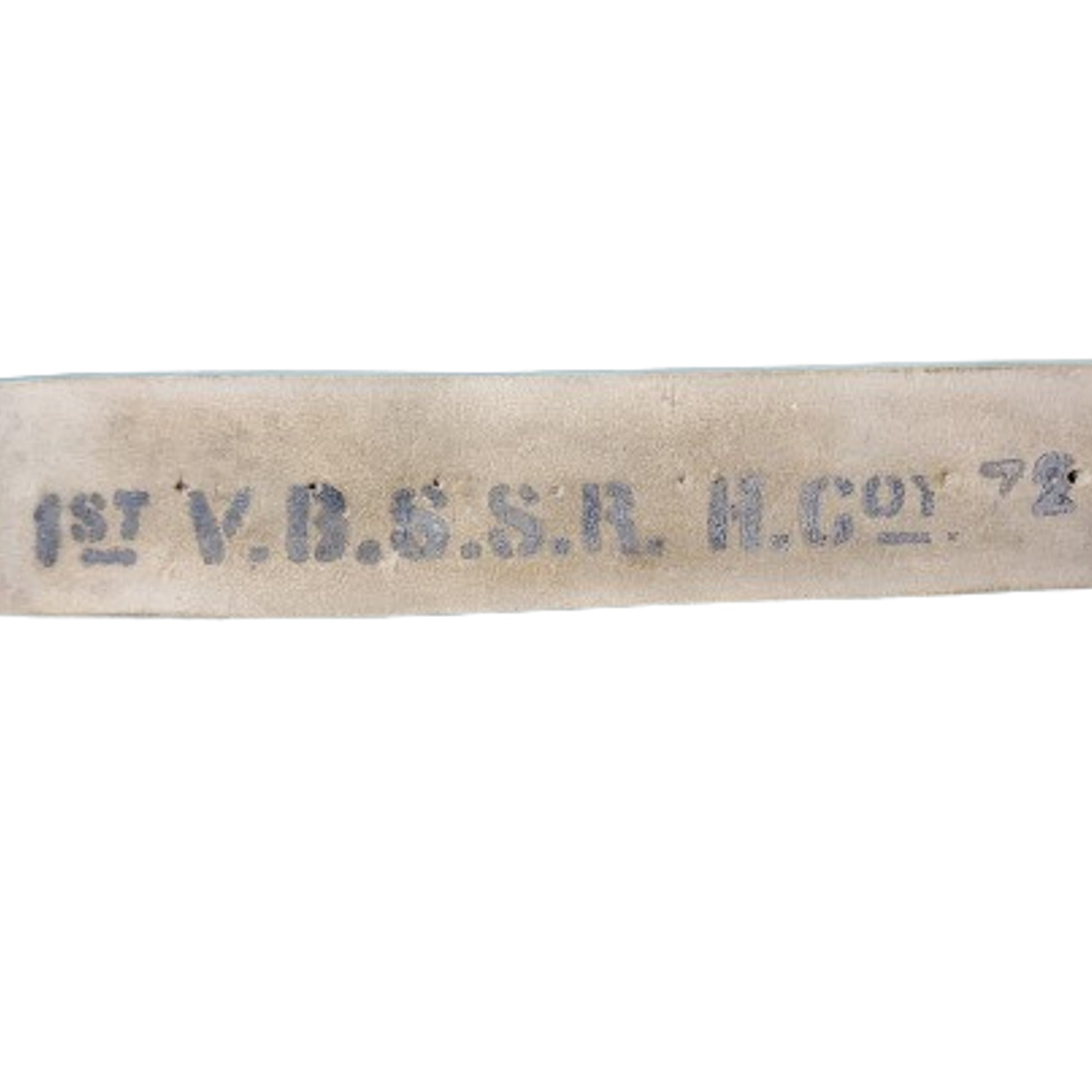 White buff leather construction Slade Wallace waist belt with brass fixture. Measures 48 inches in total length. Marked to the interior, "1st V.B.S.S.R. H.Coy. 72" with hand applied initials to the other side, :"F.U.". Shows use and wear. No buckle present. SKU: 63350