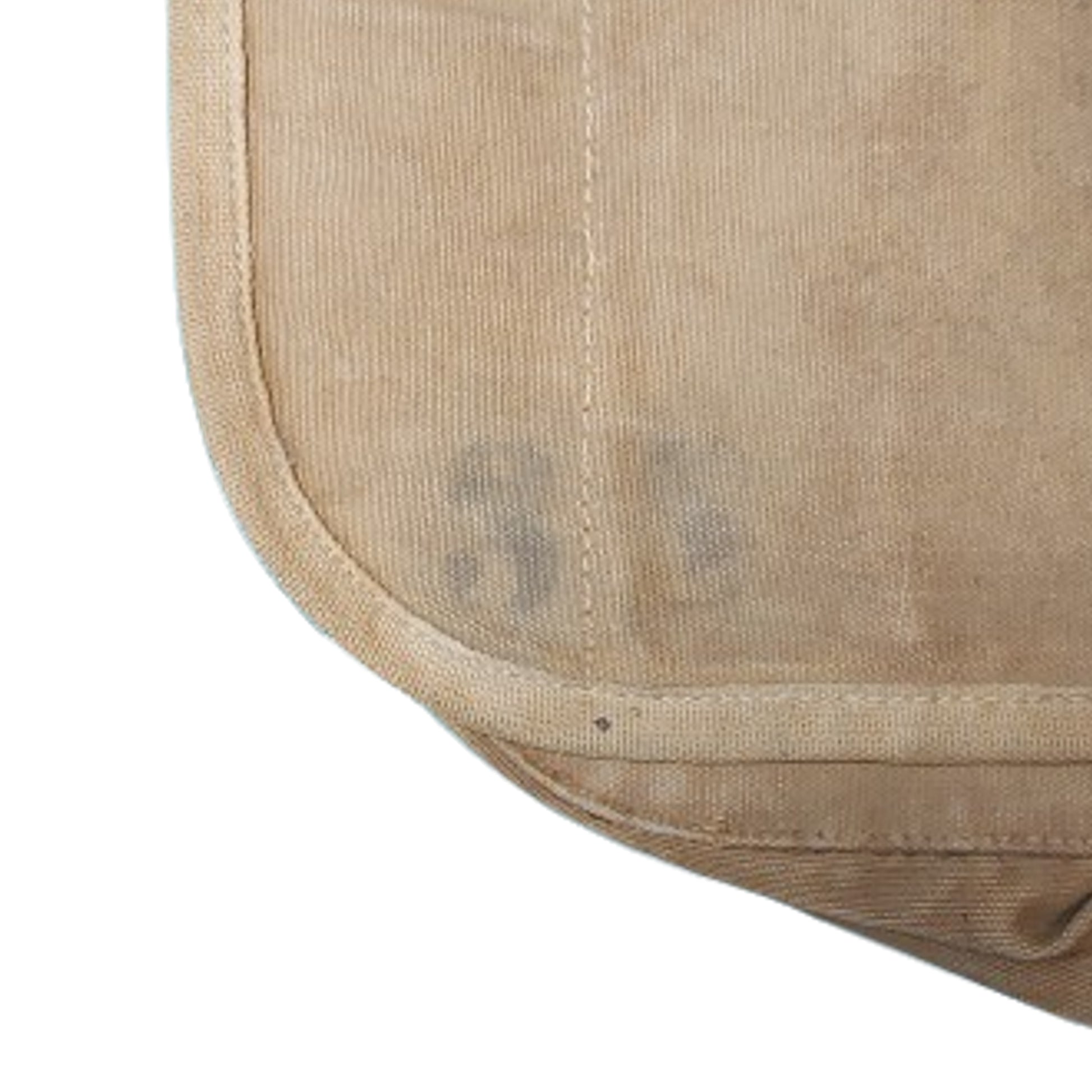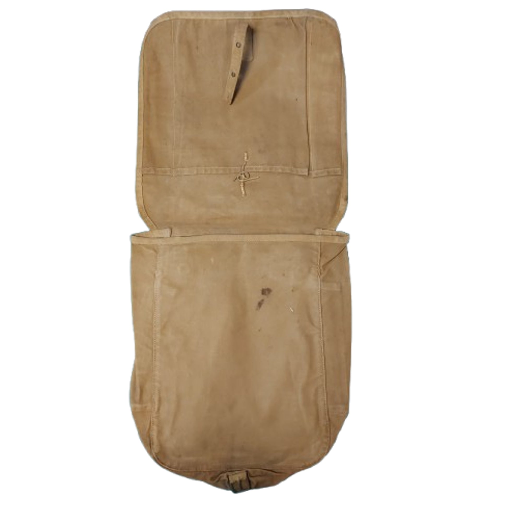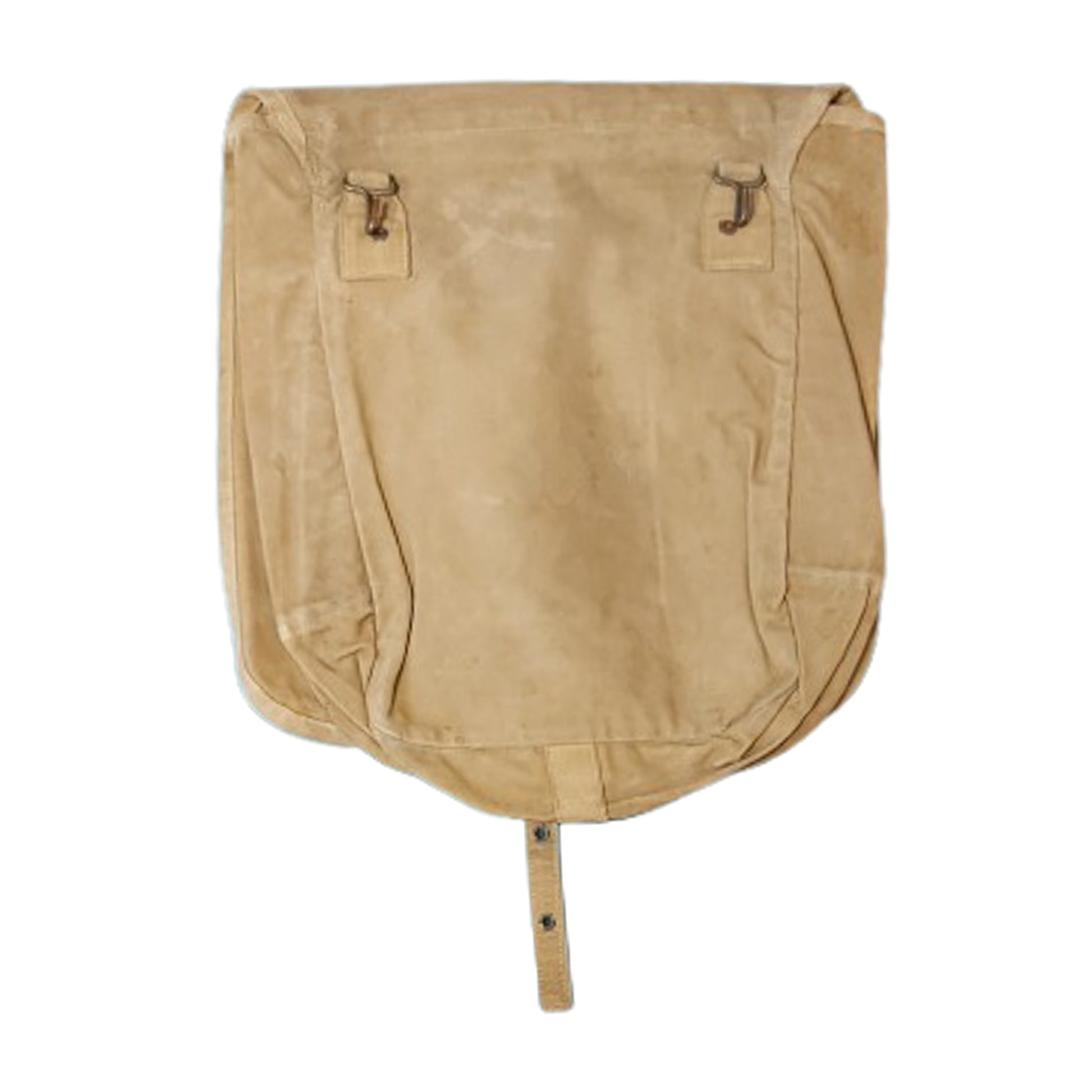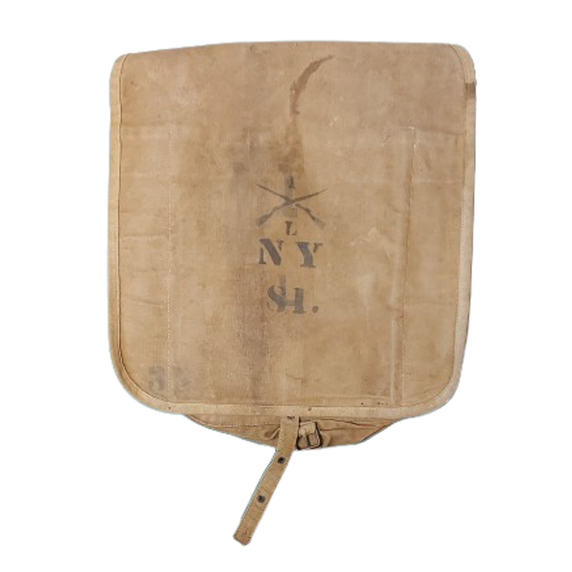 Constructed of canvas with reinforced borders with a front closure flap that is marked with 2 crossed service rifles over the number 1, with the the letter L above NY with a larger letter L below and S1. Closure flap has a single canvas strap to a metal roller buckle to cover the inner compartments. Number 38 stenciled to the lower left corner. 2 brass suspension hooks in place to the top of the reverse side. Measures 14 by 14 1/2 inches. SKU: 63185