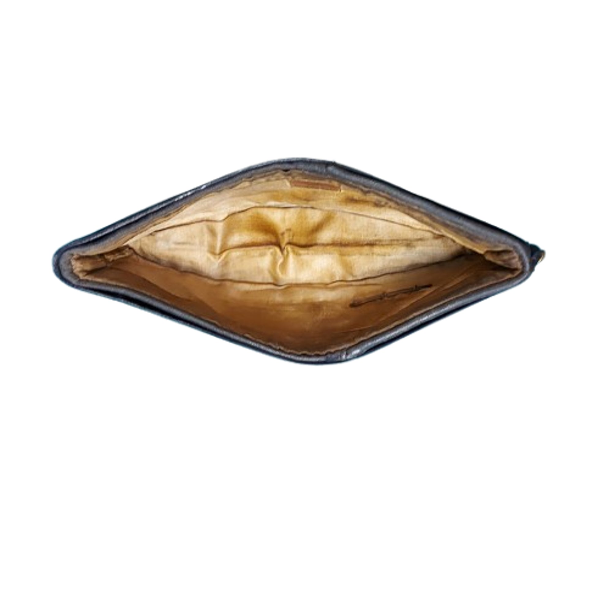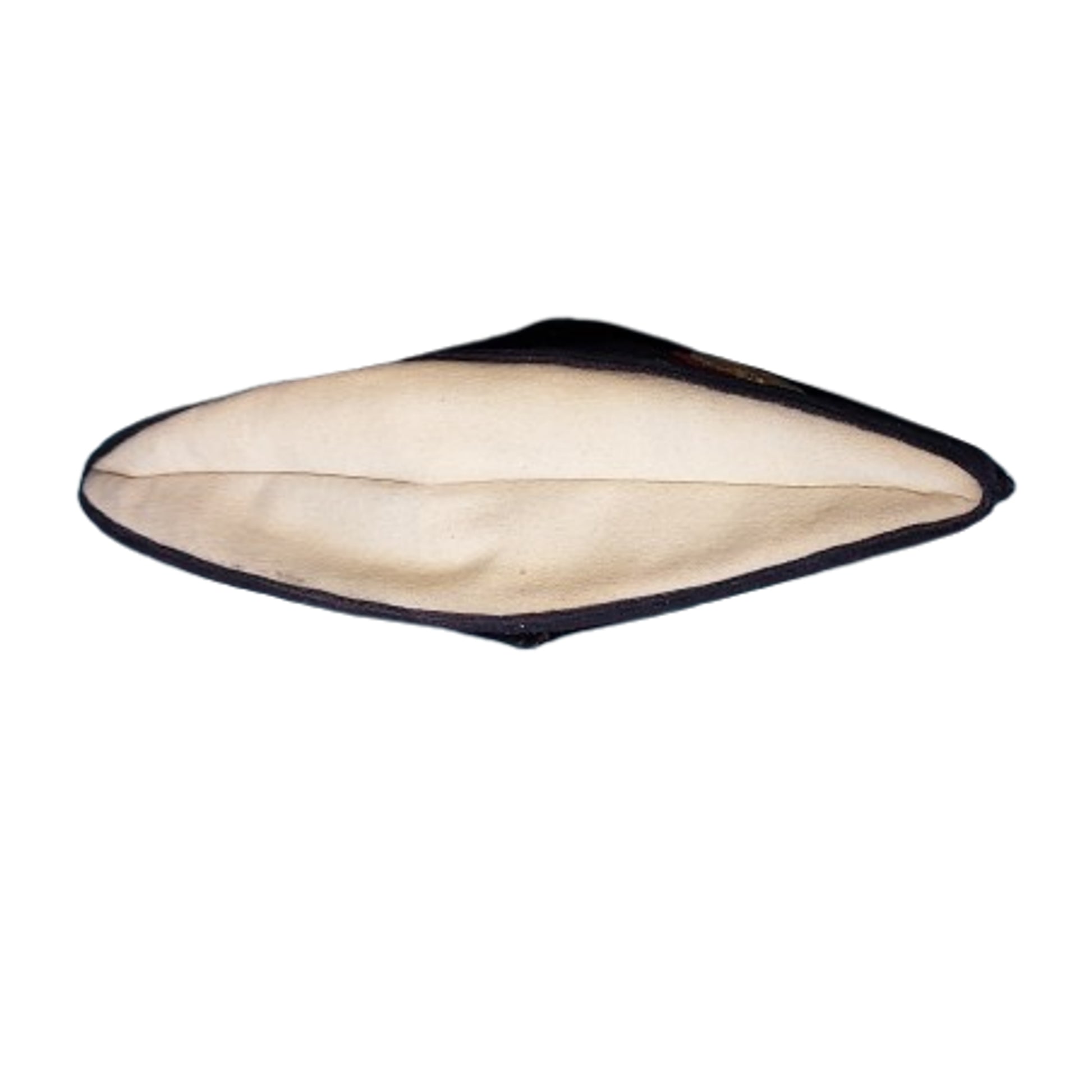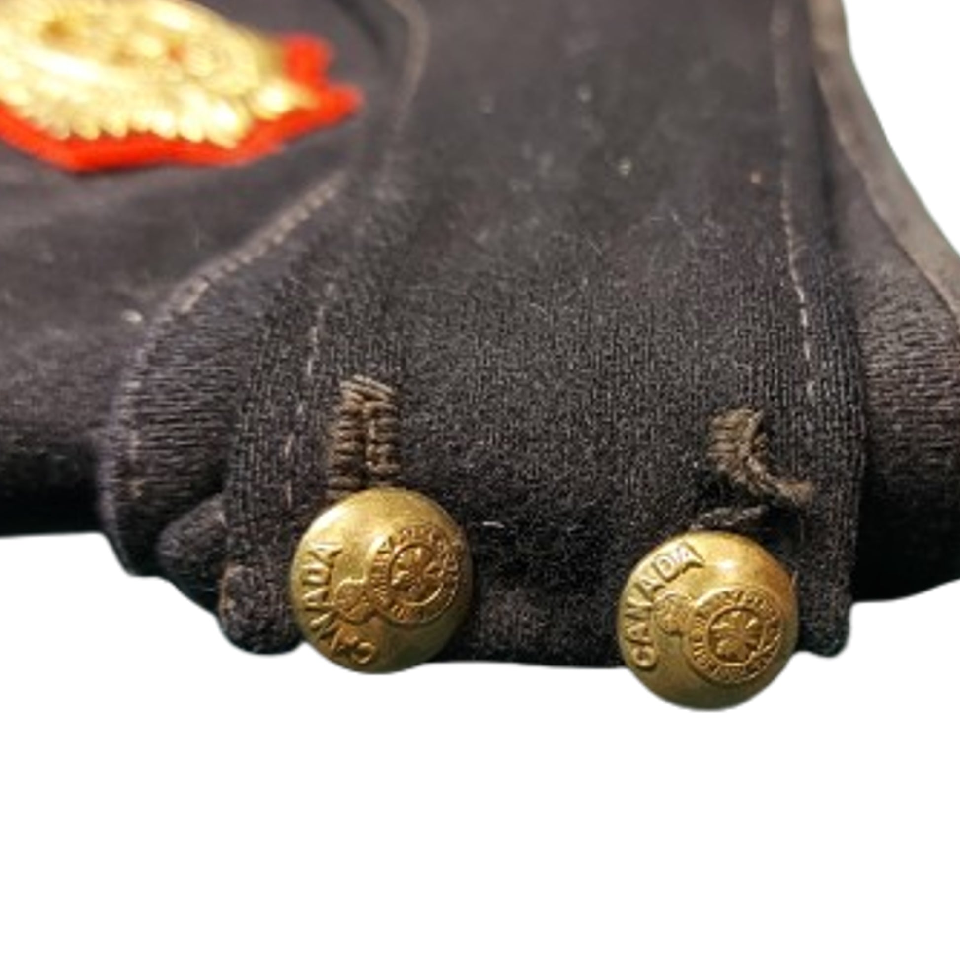 Constructed of dark blue wool with a white crown and 2 small brass CANADA front buttons. Issue brass badge with red material backing in place to the front left side. Manufactures label in place to the interior. Shows war time use and wear. SKU: 63250