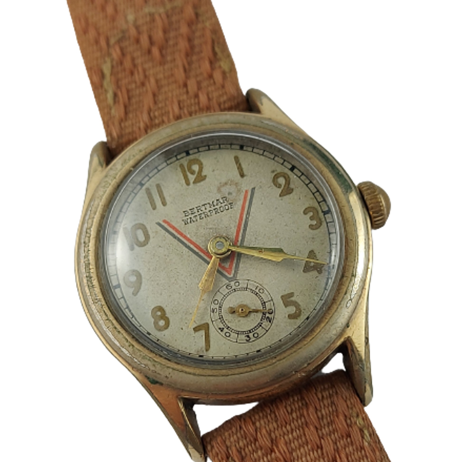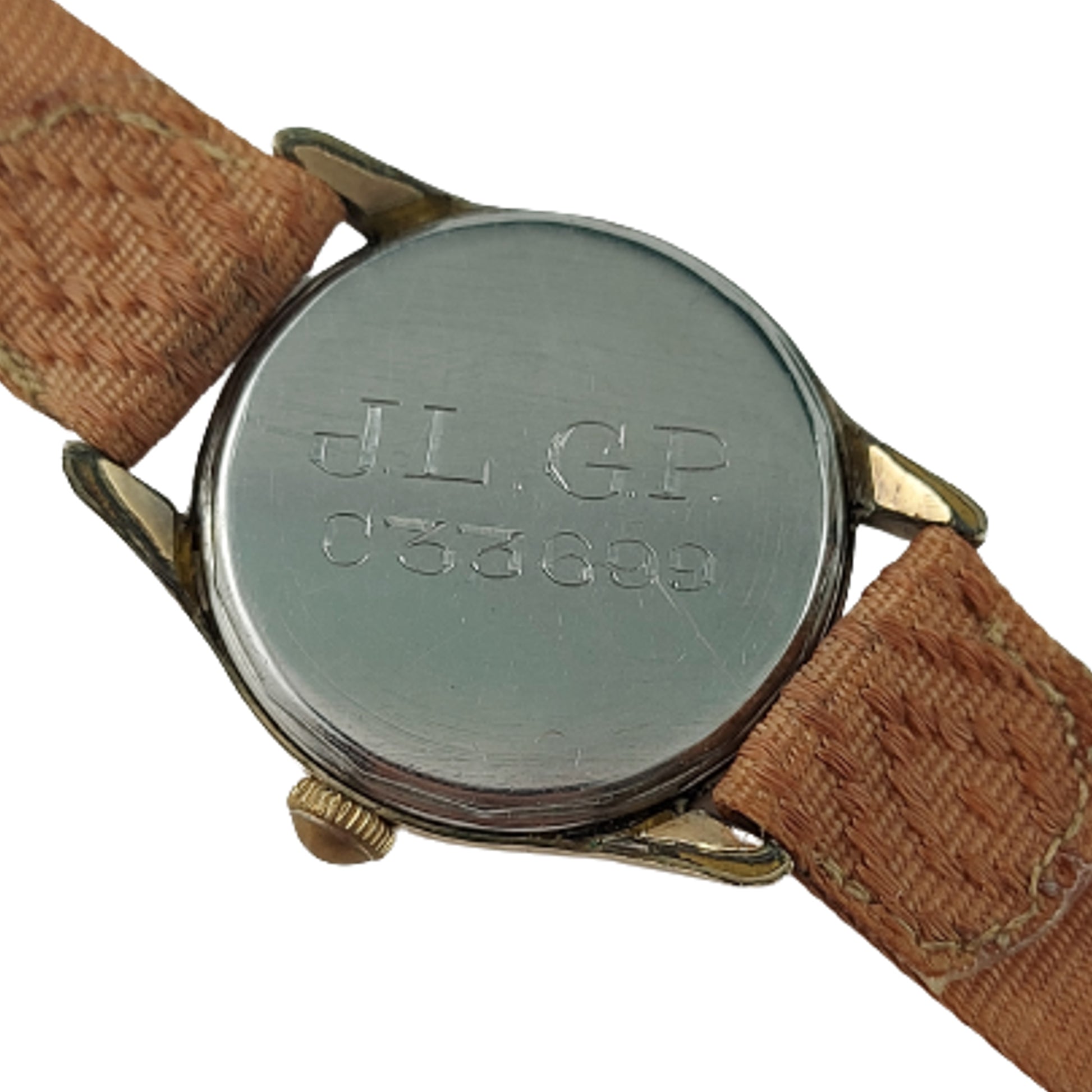 Manufacture marked Bertmar Waterproof to the dial with second hand to the lower portion, and a red and blue "V" for Victory to the center of the dial. Glass bezel in place and without damage. Engraved to the reverse, ""J.L. G.P." with the service number C33699 which shows as District Depot Number 3, Ottawa. With wrist band in place. Not presently running, but could be repaired if desired.
