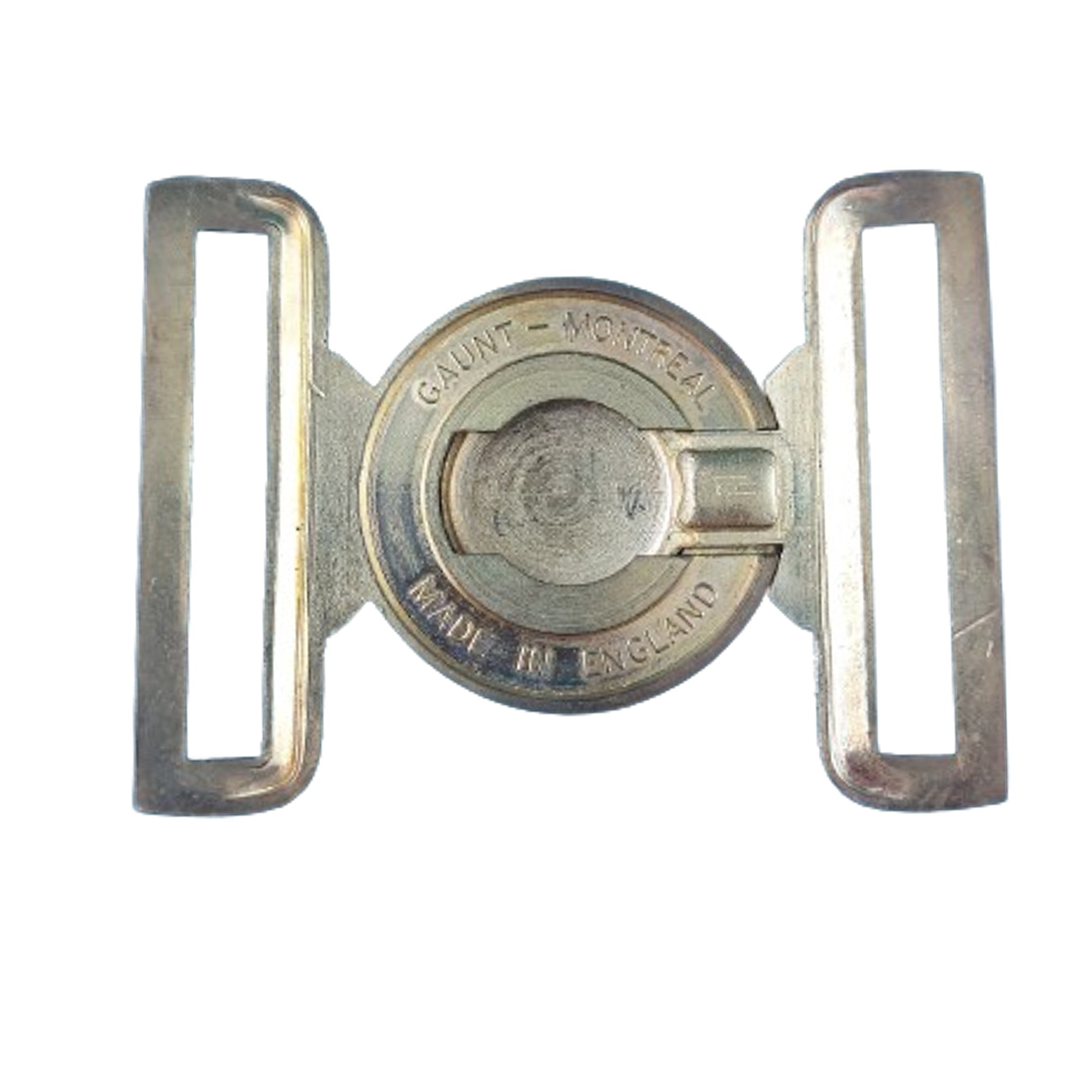 Two piece brass buckle for wear with the garrison belt. Maker marked to the reverse, Gaunt Montreal, Made In England. SKU: 61189