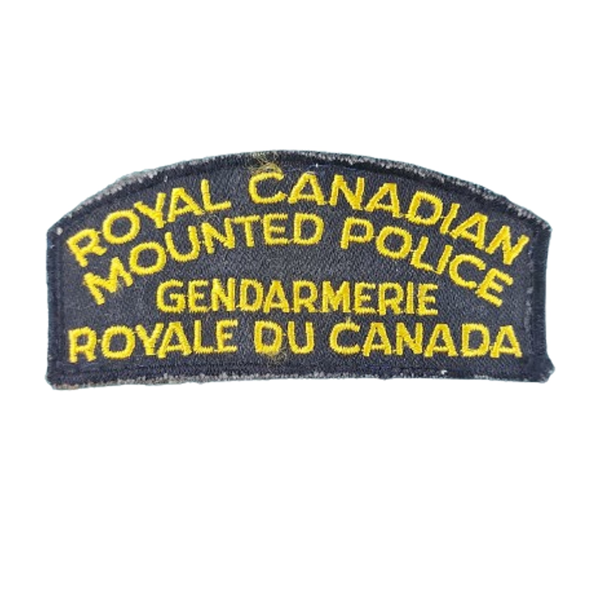 Obsolete QEII Era Royal Canadian Mounted Police - Gendarmerie Royale Du Canada Bilingual Shoulder Title, embroidered on cloth, yellow on brown. Removed from uniform. SKU: 61774