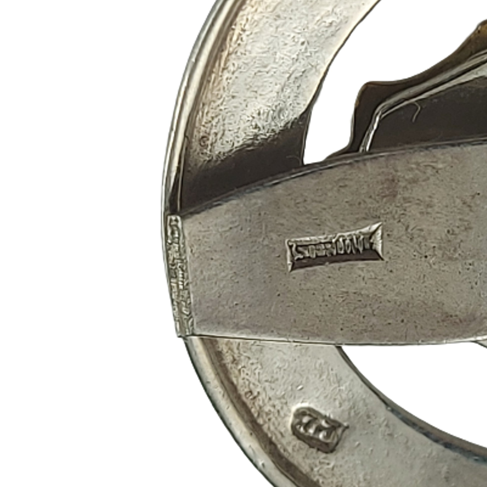 Bi-metal, multi piece construction maker marked to the reverse, and stamped "Sterling" Slider fastener. SKU: 59850