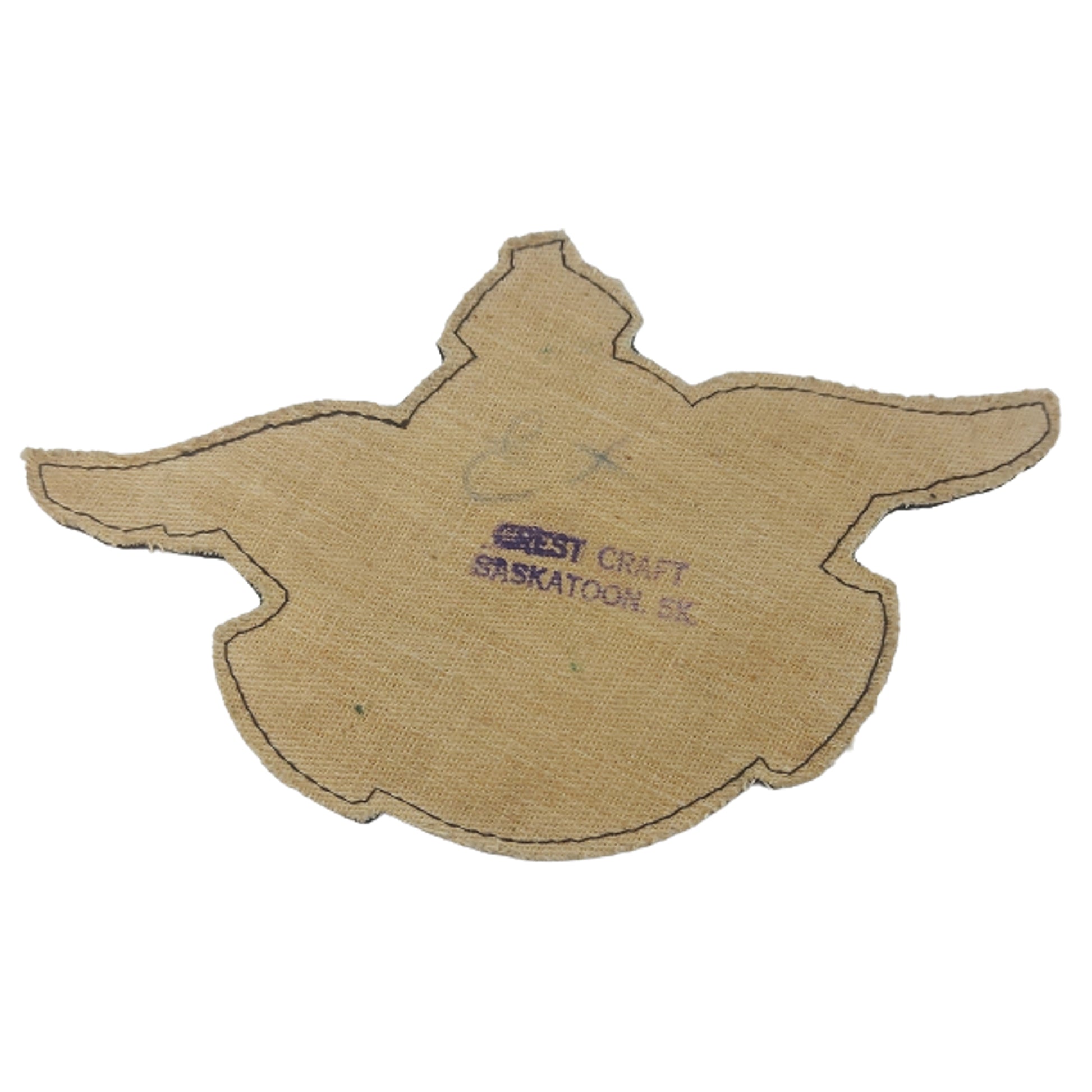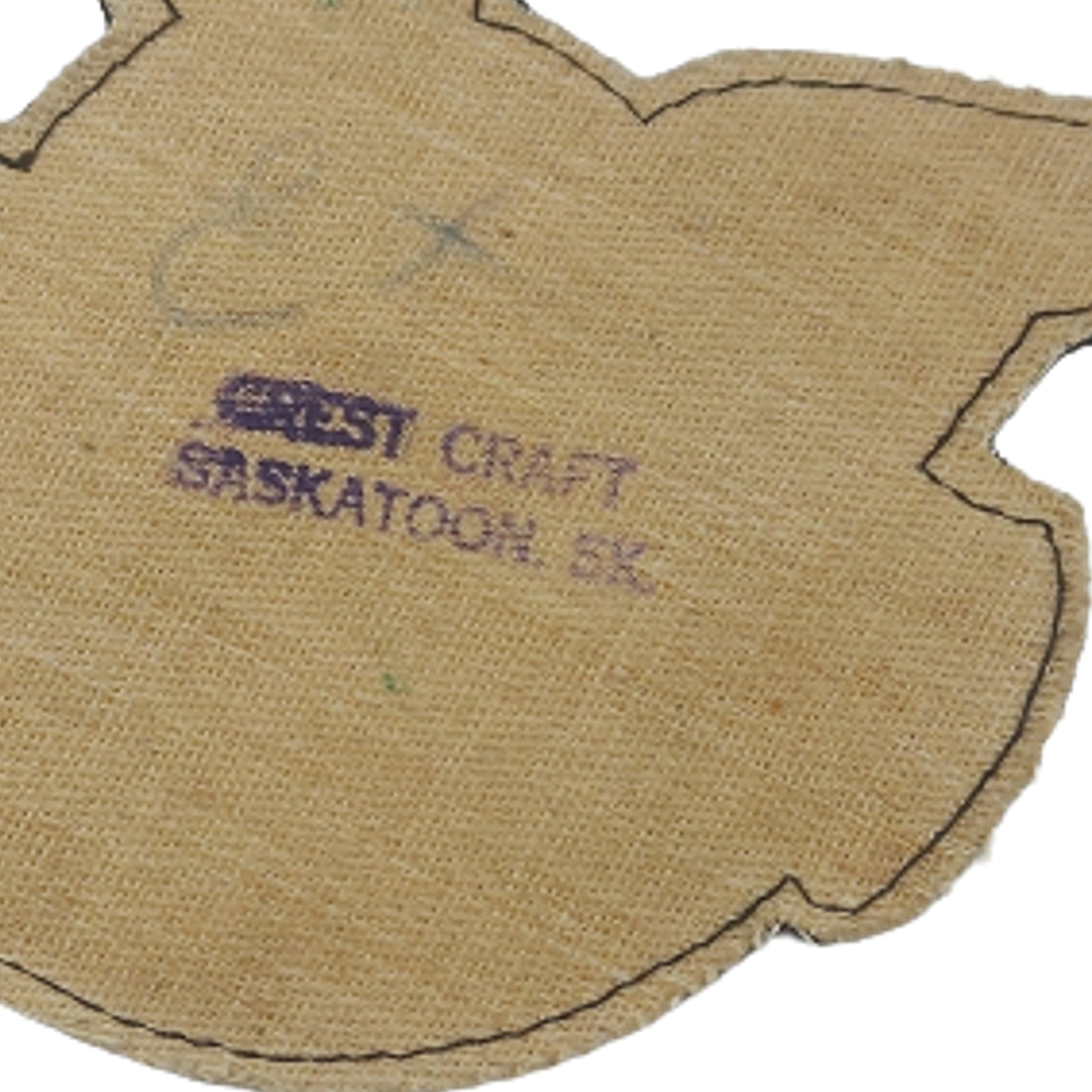 Embroidered on cloth, measuring 7 1/2 by 4 1/2 inches. Maker marked "Crest Craft, Saskatoon SK." to the reverse.