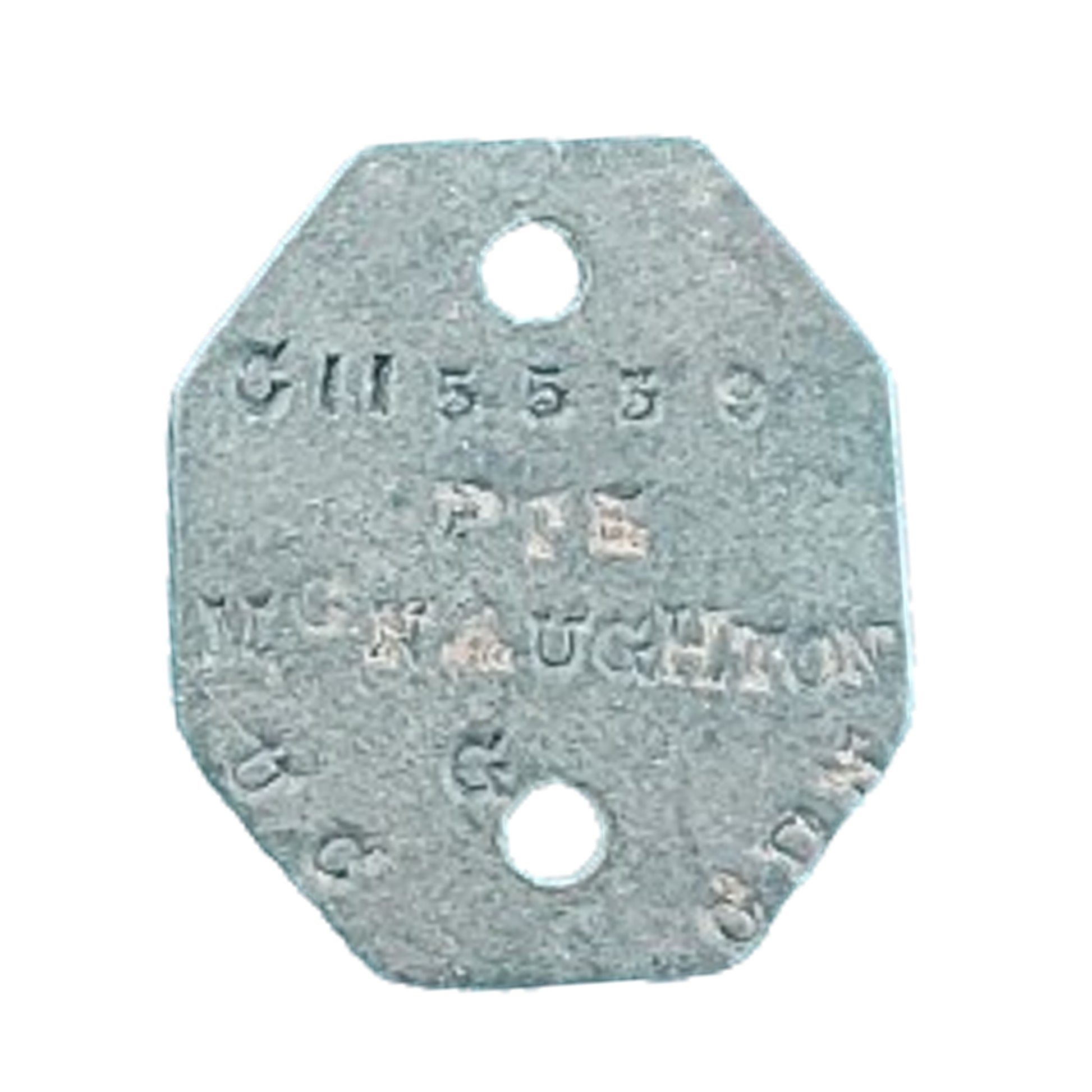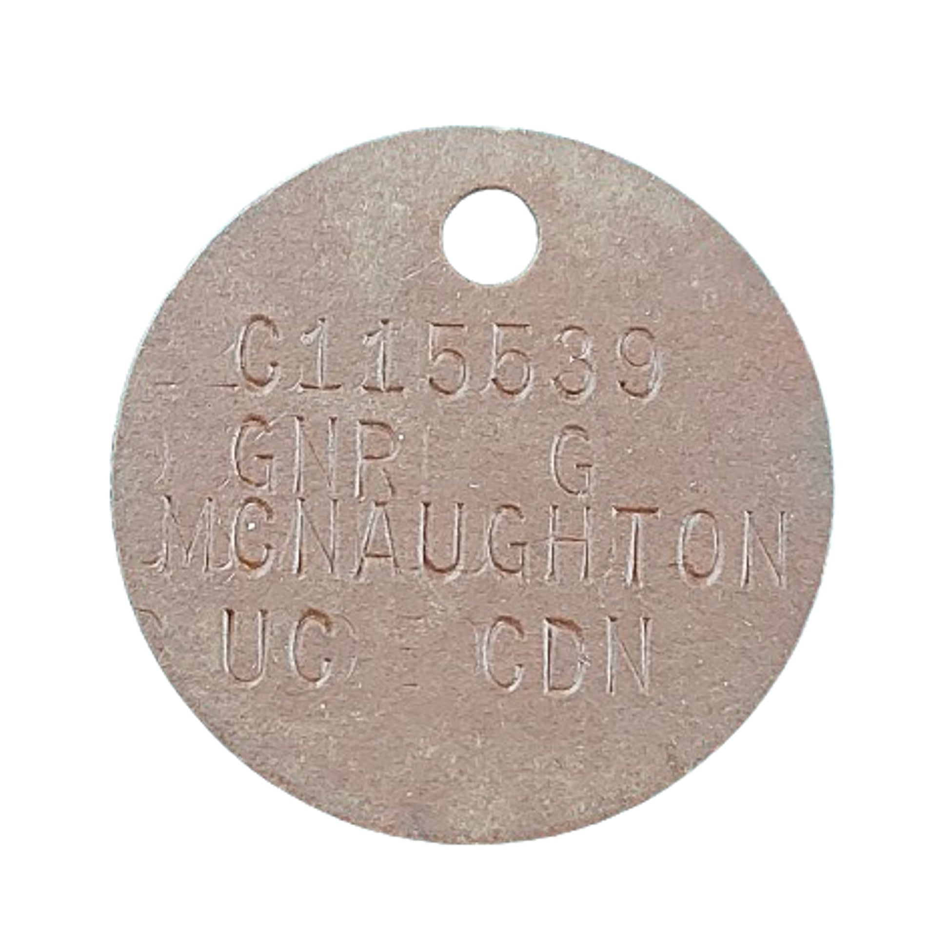 Set of 3 WW2 pressed fiber I.D. Tags, all named to C115539 Gnr. G. McNaughton. Service number shows as M.D. 7, St. John New Brunswick. SKU: 61665