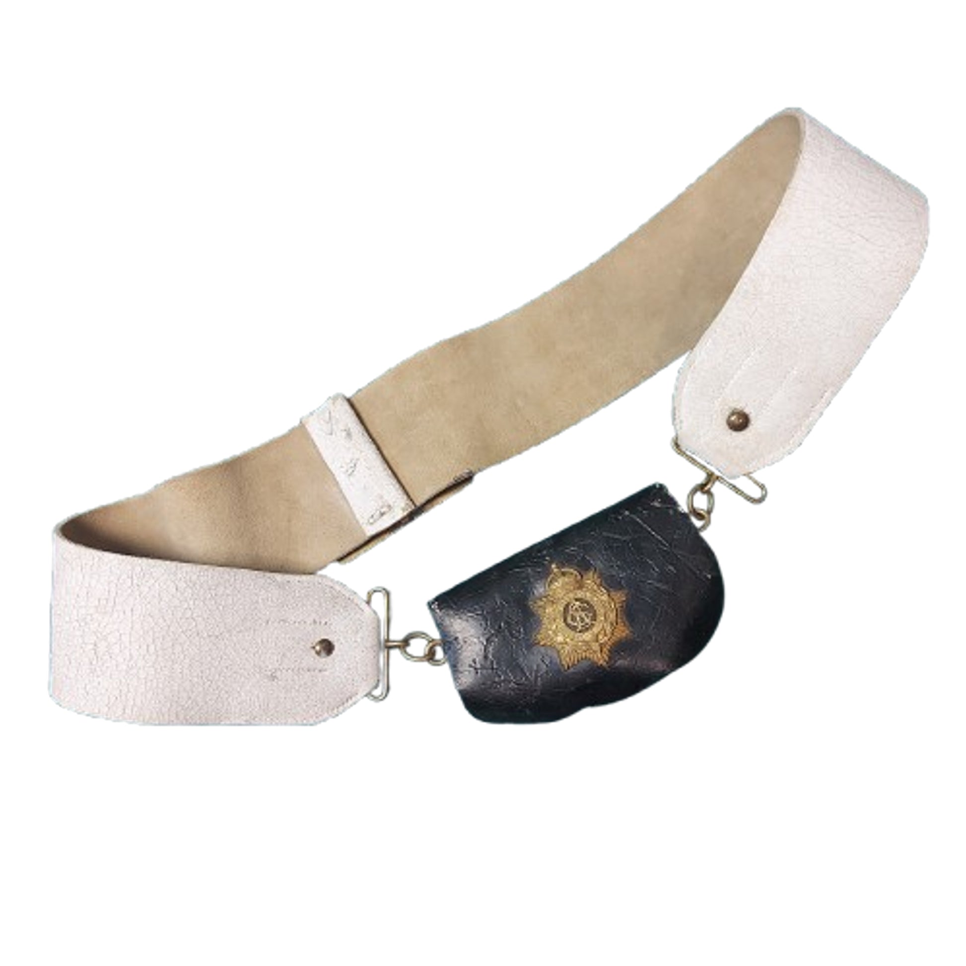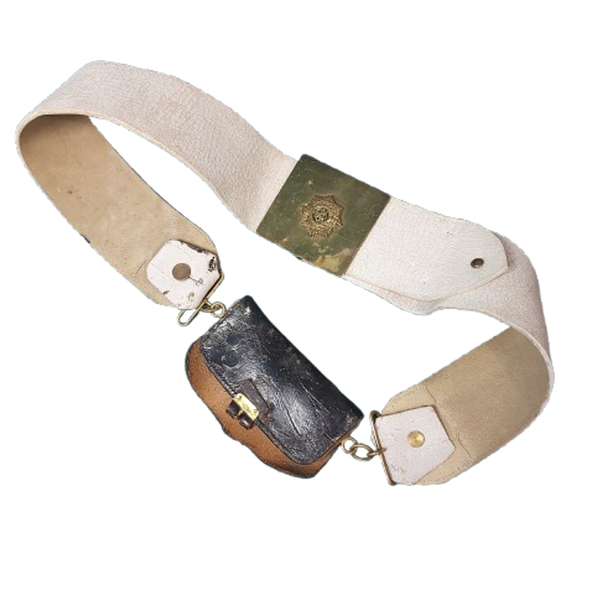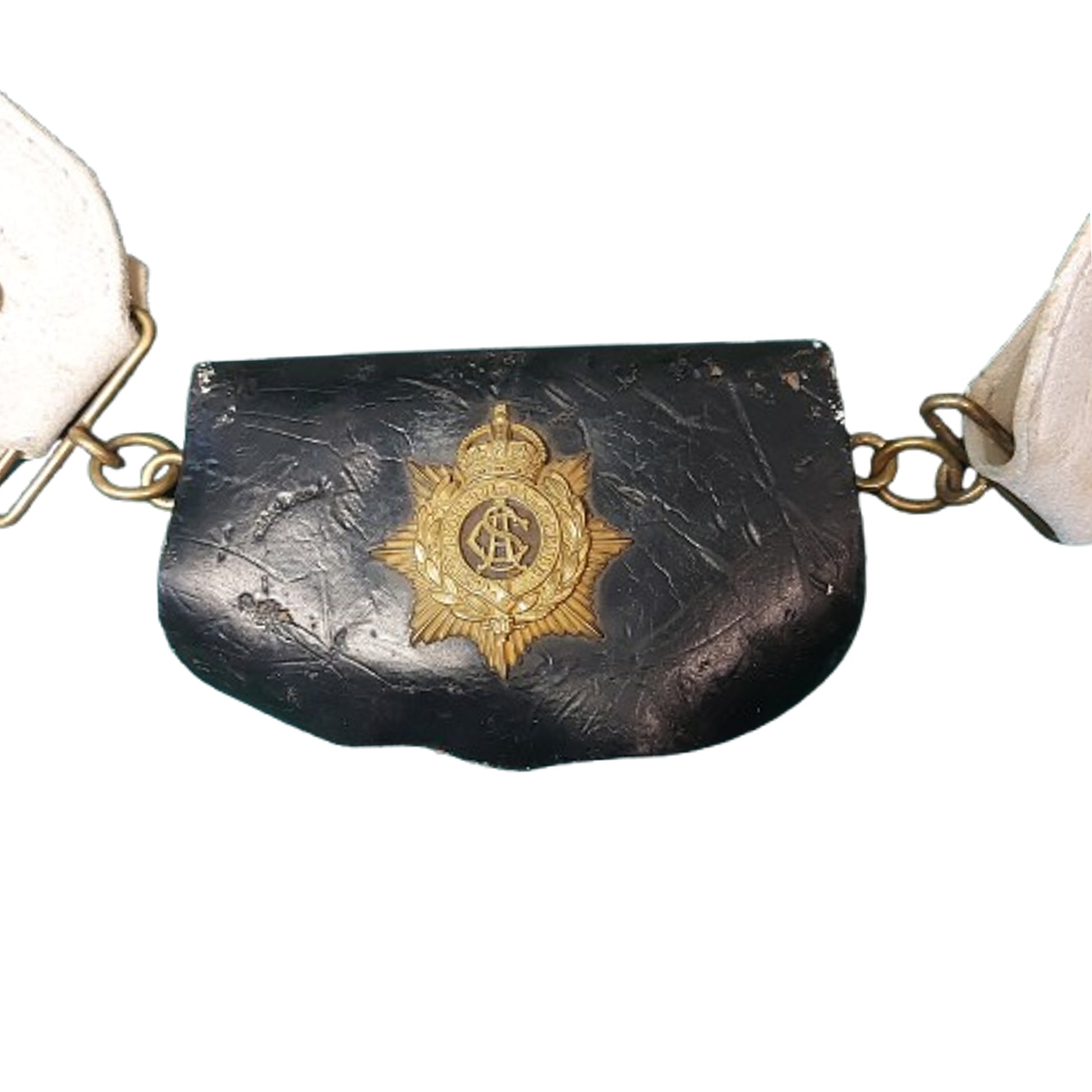White buff leather cross belt, 3 inches in width and 35 inches in total length with a large brass 3 1/4 by 3 1/2 inch buckle with a WW1 Army Service Corps badge to the center. Brass swivels to the ends attached to a black leather pouch that also has a large 2 1/4 inch by 2 1/2 inch Army Service Corps buckle to the center of the flap closure with a single strap closure to a brass tab. A pre-WW1 cross belt and pouch also used in WW1. SKU: 62289