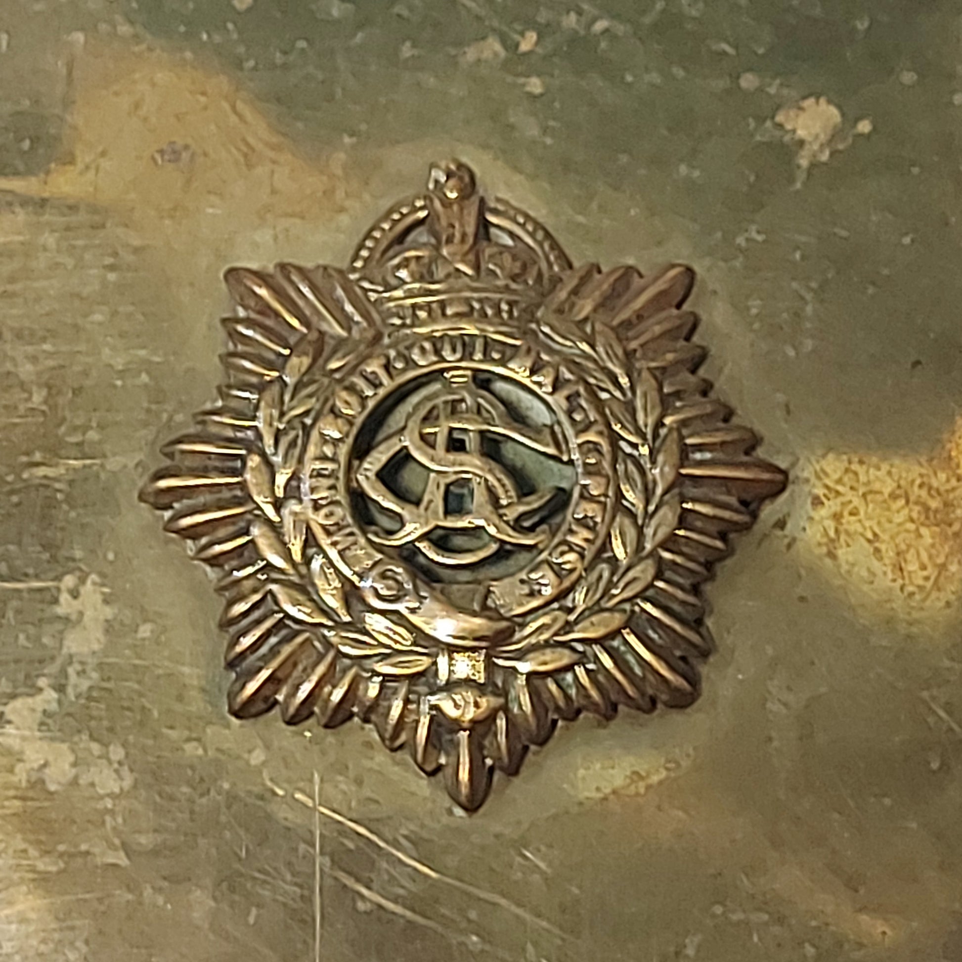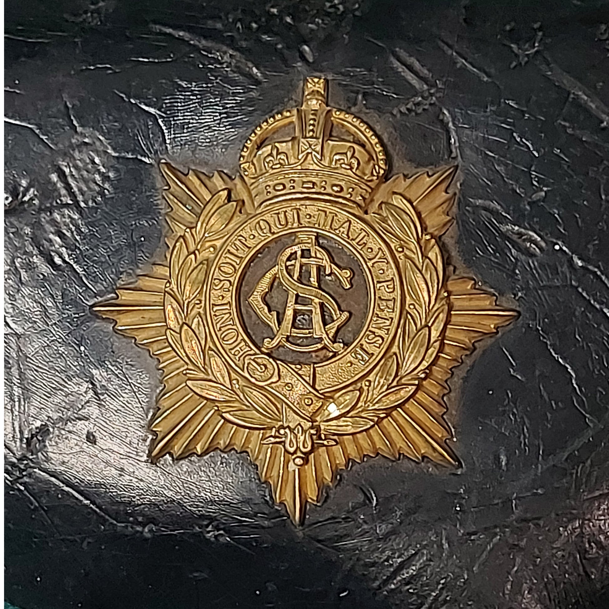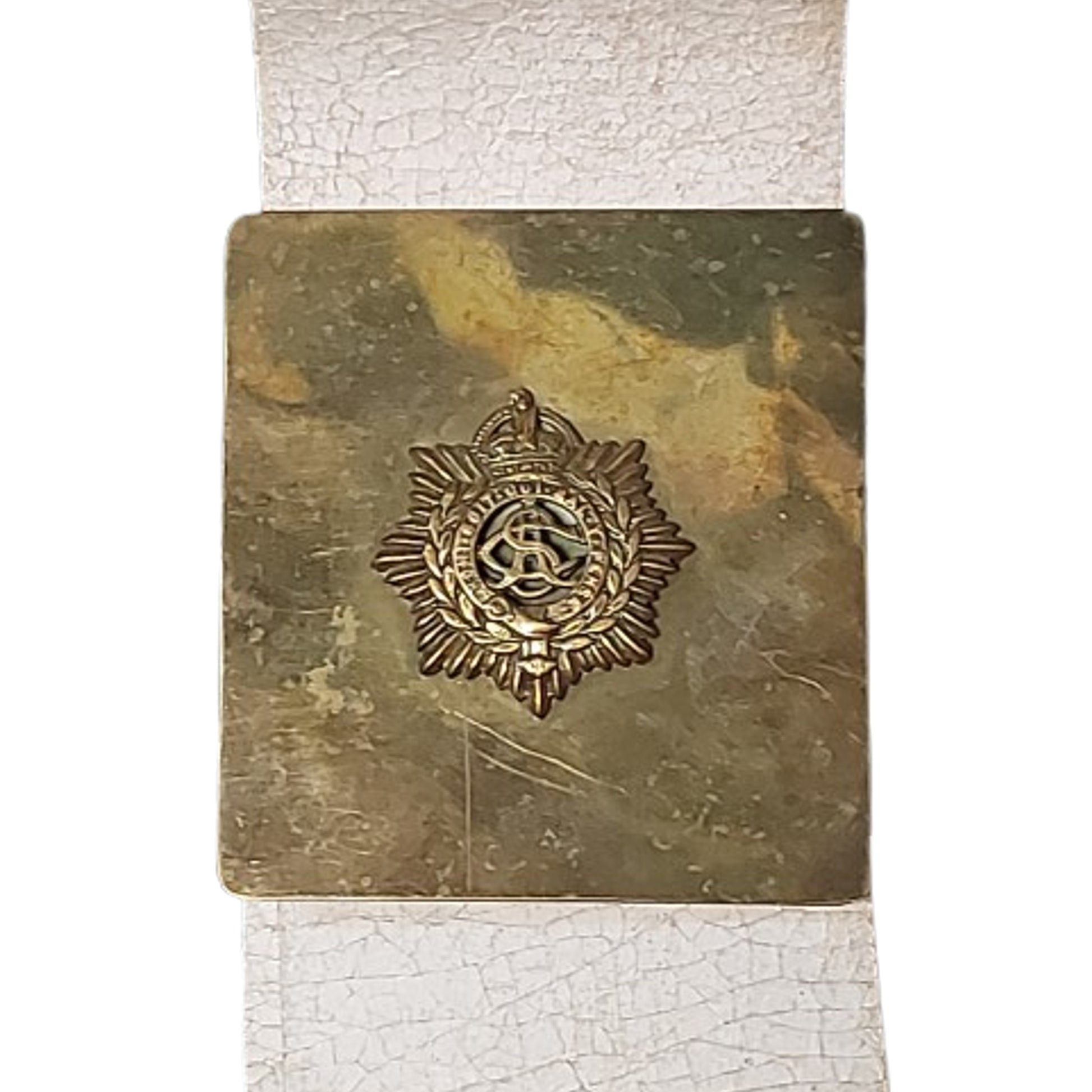 White buff leather cross belt, 3 inches in width and 35 inches in total length with a large brass 3 1/4 by 3 1/2 inch buckle with a WW1 Army Service Corps badge to the center. Brass swivels to the ends attached to a black leather pouch that also has a large 2 1/4 inch by 2 1/2 inch Army Service Corps buckle to the center of the flap closure with a single strap closure to a brass tab. A pre-WW1 cross belt and pouch also used in WW1. SKU: 62289