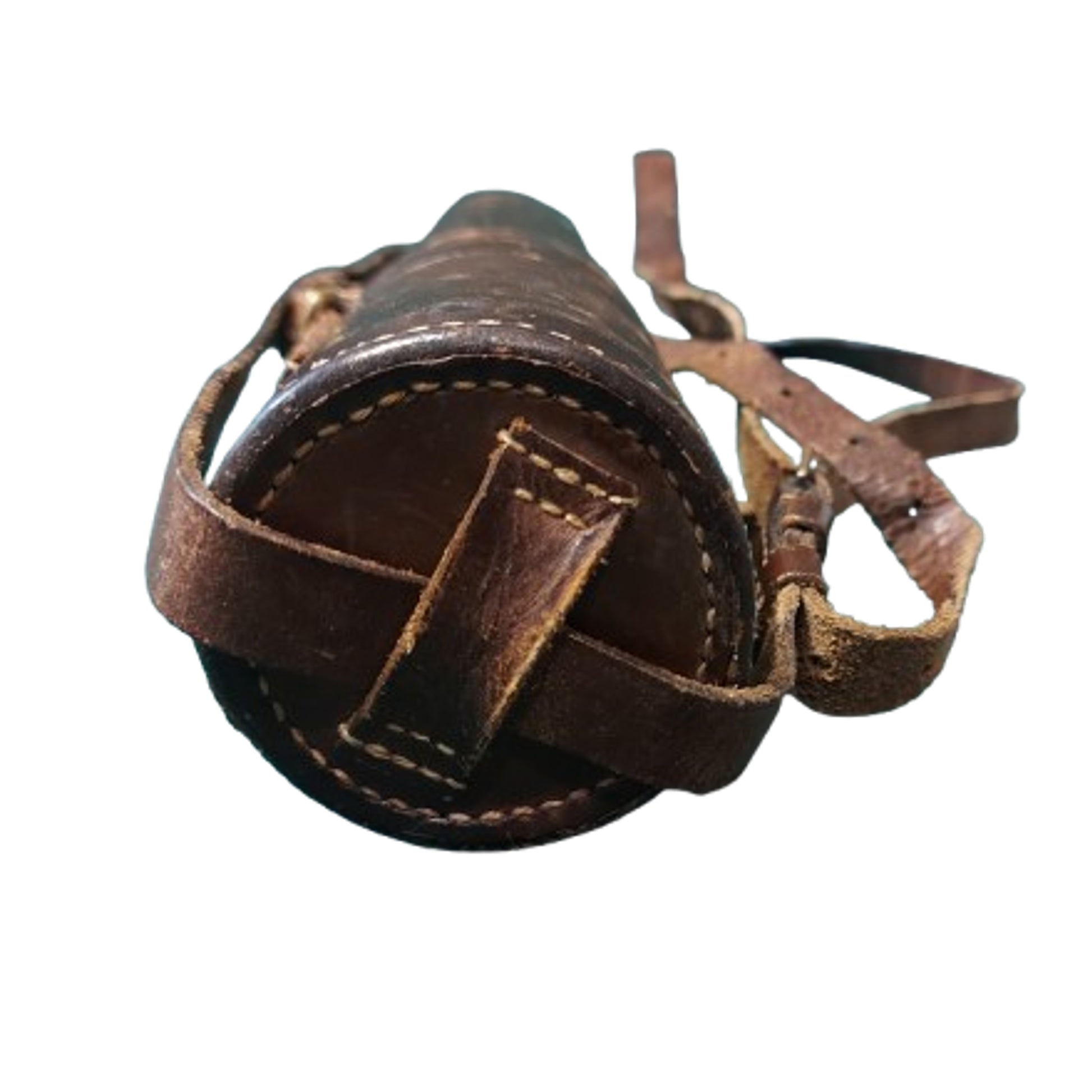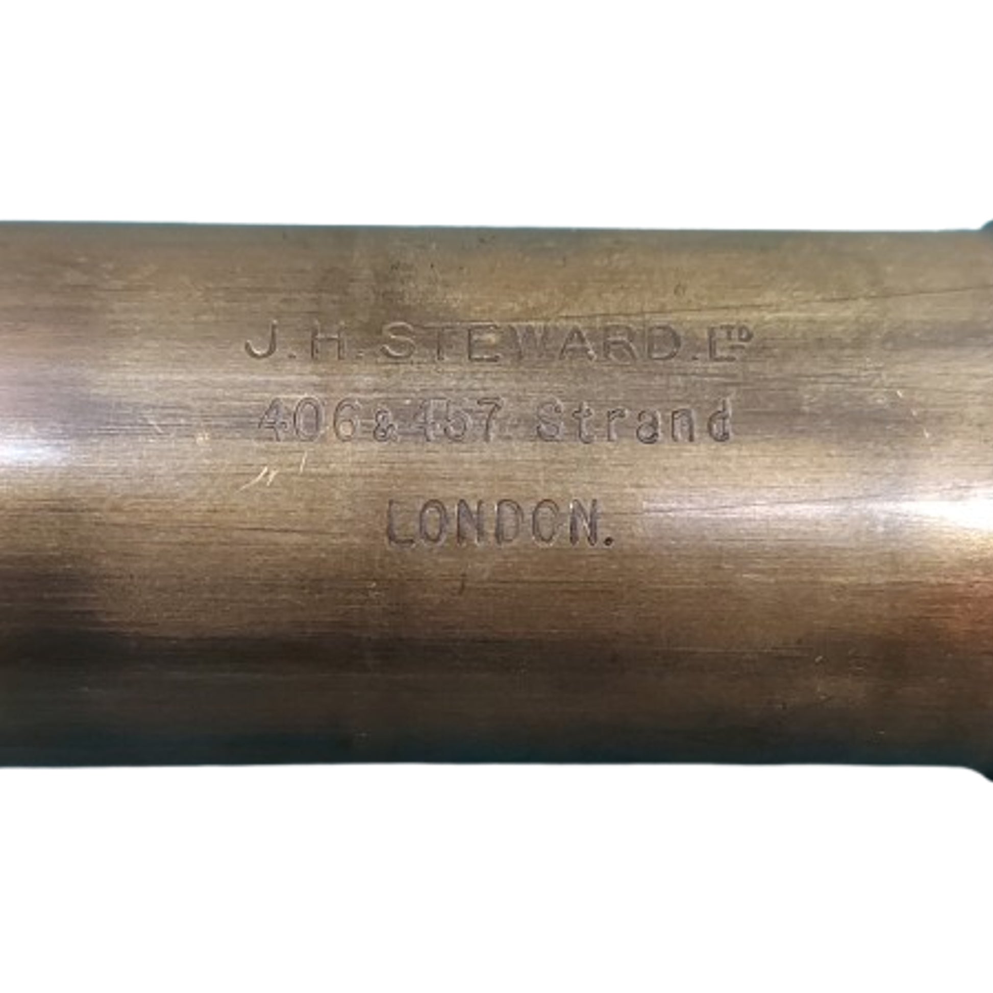 Measuring 10 1/2 inches in the closed position, and 25 inches in the open position, including the 3 inch sunshade and end cap. Three draw, brass construction with a leather wrapped 6 1/2 inch portion with a brass makers manufactures plate, "The Lord Bury Telescope , J.H. Steward Ltd. 406-457 Strand No. 5746 London". It is again maker marked to the first section above the eye piece, "J.H. Steward Ltd., 406-457 Strand, London." The telescope shows a nice, even, aged brass finish with the leather wrap being in very good condition. It is contained in the issue leather carry case with a removeable end cap and a single leather strap to a brass roller buckle and an adjustable leather carry strap. The side of the case shows a period, hand applied naming "Westbury", for Captain B. Westbury of the British Army. The optics are very cloudy with no clarity, and with a small chip to the glass, but still displays very well. SKU: 63418