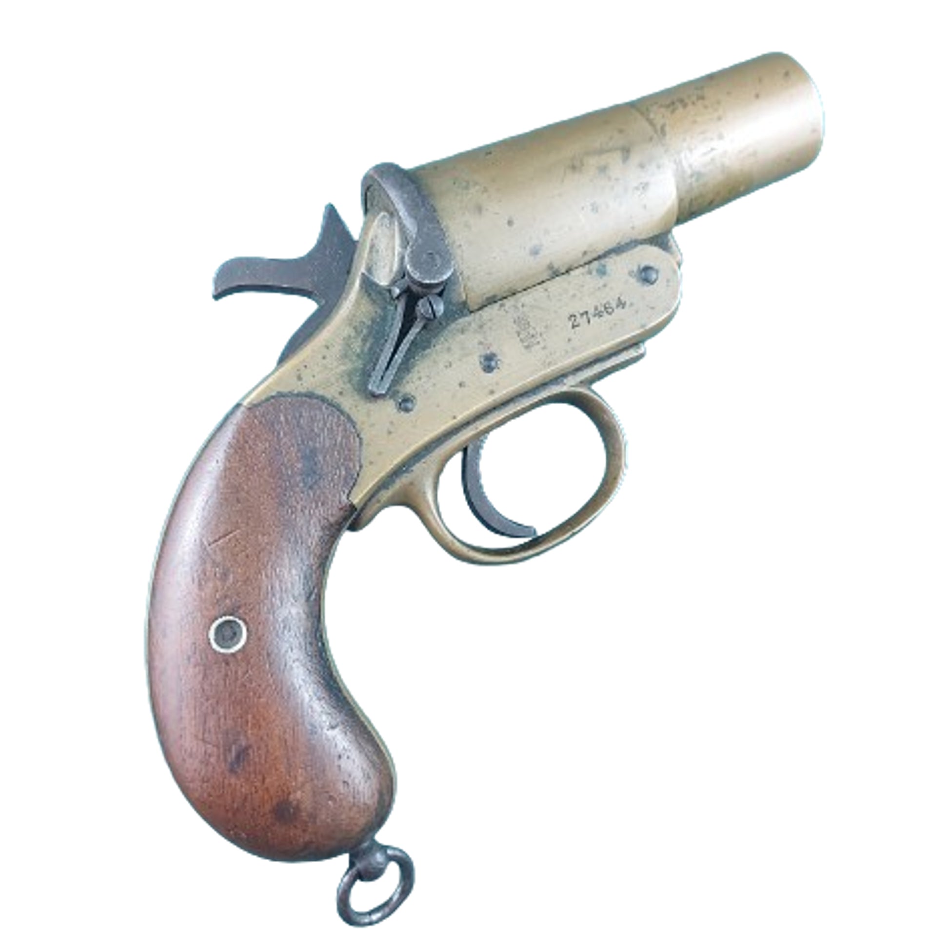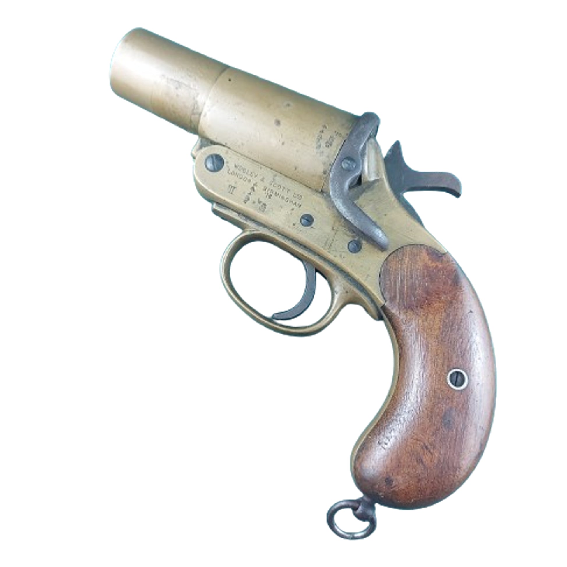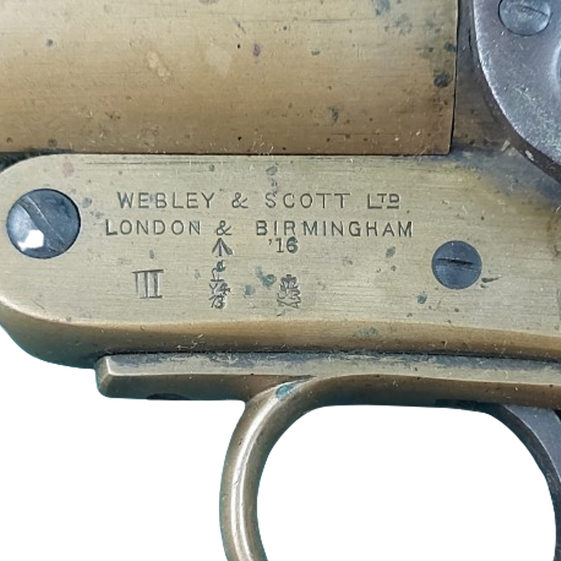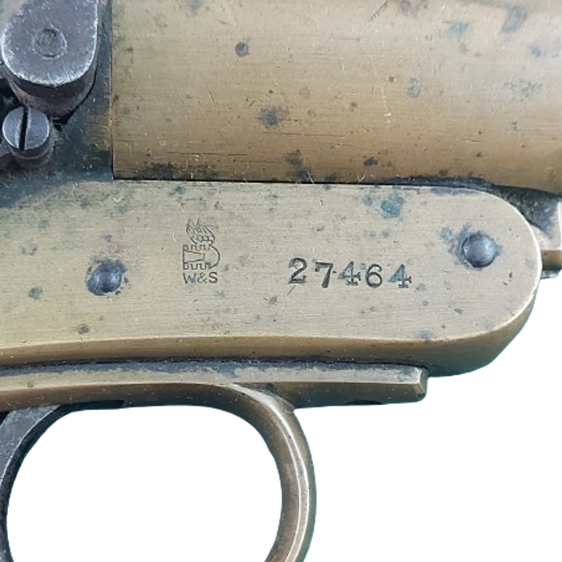 Brass, break open single shot flare pistol, maker marked Webley & Scott Ltd., London & Birmingham to the left side of the frame with a British Broadarrow and a 1916 date stamp below, followed by a line of proof marks. Webley & Scott company logo to the opposite side of the frame. Single action operation with 2 piece wood grip panels and flared barrel at the muzzle. Lanyard ring in place. Mechanically excellent and in very good original condition. SKU: 62454 CANADIAN SALES ONLY