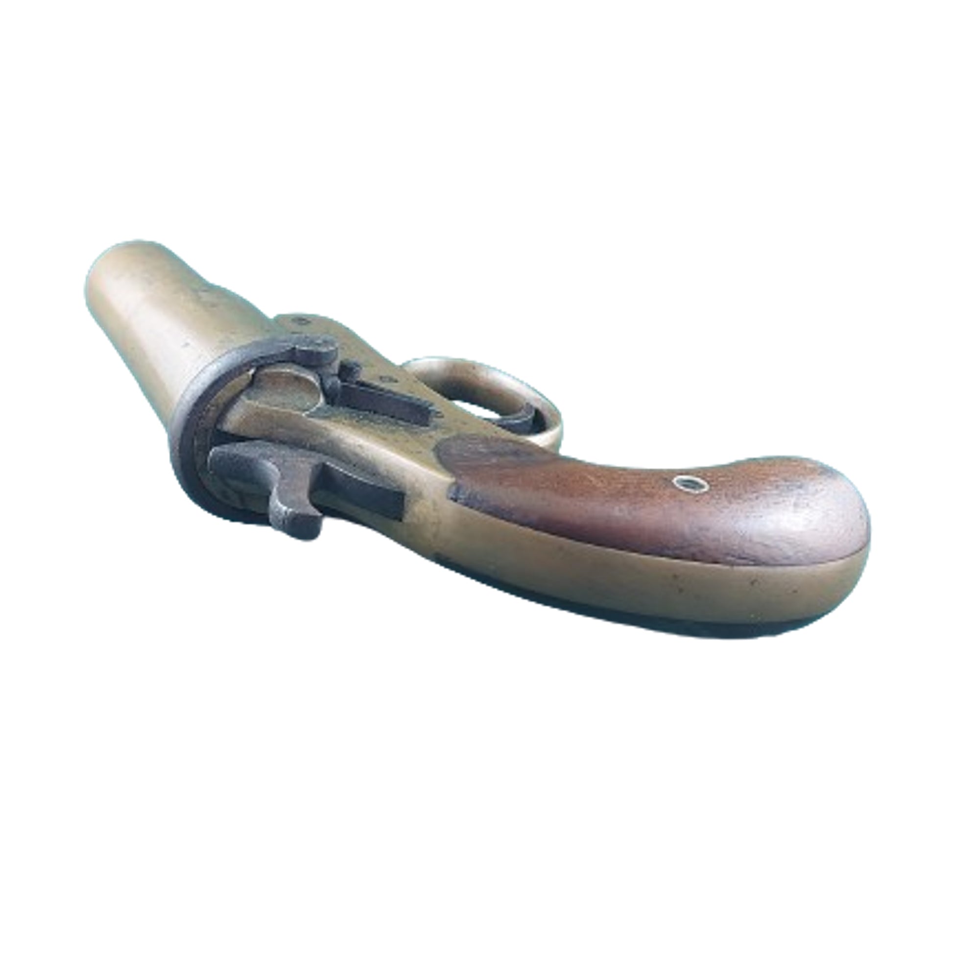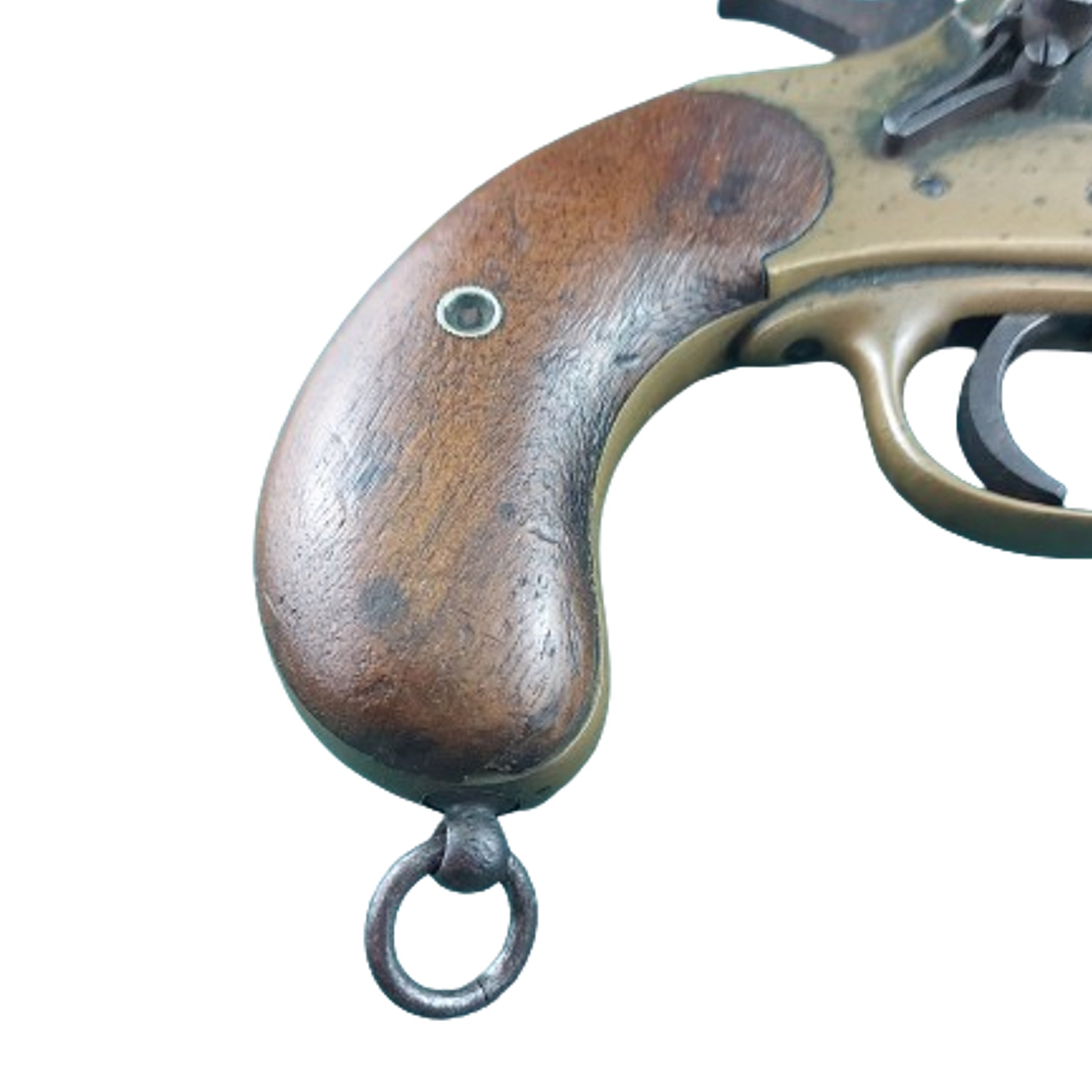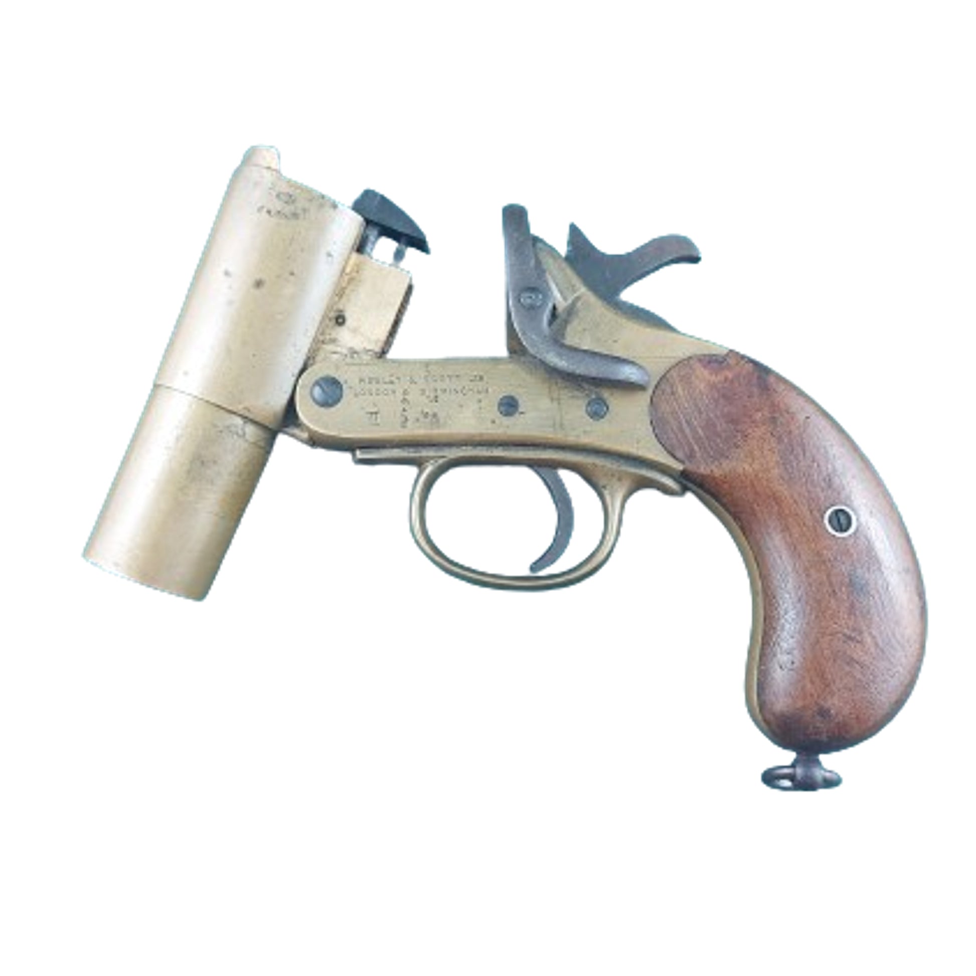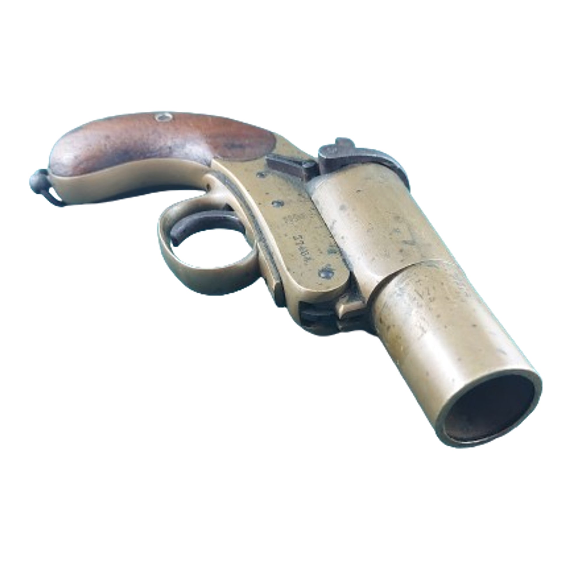 Brass, break open single shot flare pistol, maker marked Webley & Scott Ltd., London & Birmingham to the left side of the frame with a British Broadarrow and a 1916 date stamp below, followed by a line of proof marks. Webley & Scott company logo to the opposite side of the frame. Single action operation with 2 piece wood grip panels and flared barrel at the muzzle. Lanyard ring in place. Mechanically excellent and in very good original condition. SKU: 62454 CANADIAN SALES ONLY