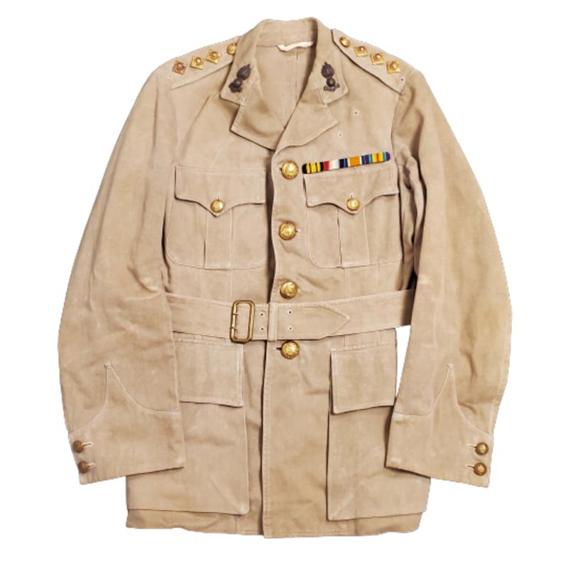 Waist length canvas tunic with 4 button 4 pocket, open collar front and waist belt in place. Rank of Captain with all correct metal pips present. Collar badges in place with ribbon bar above the left breast pocket. All of the king's Crown Royal Engineers brass buttons are in place. No manufactures label or visible markings present. SKU: 63474