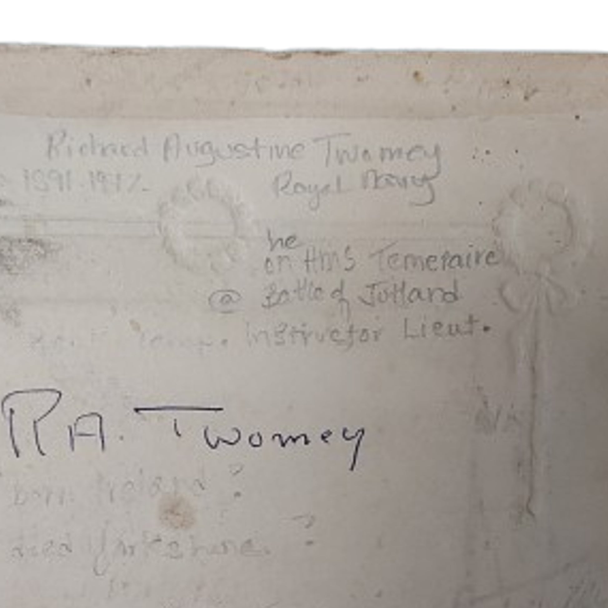 Period black and white photo, measuring 3 by 5 1/2 inches of Richard Augustine Twomey who served on the HMS Temeraire during WW1. Mounted on original matte board that measures 5 1/4 by 9 1/4 inches. Named to the reverse with handwritten notes and information. SKU: 63311