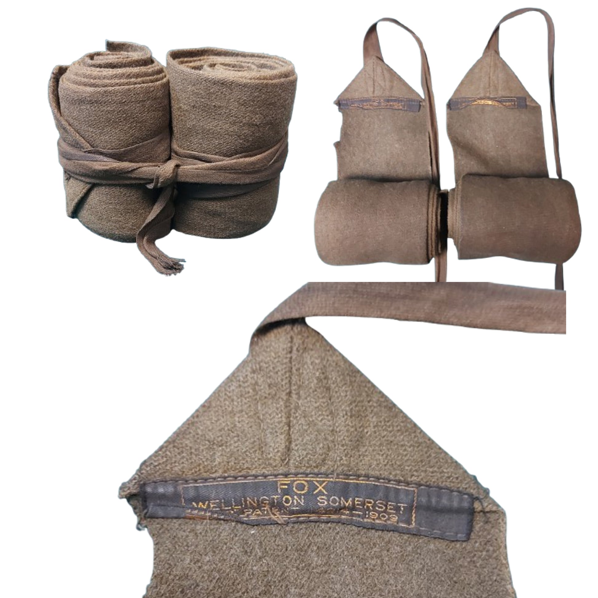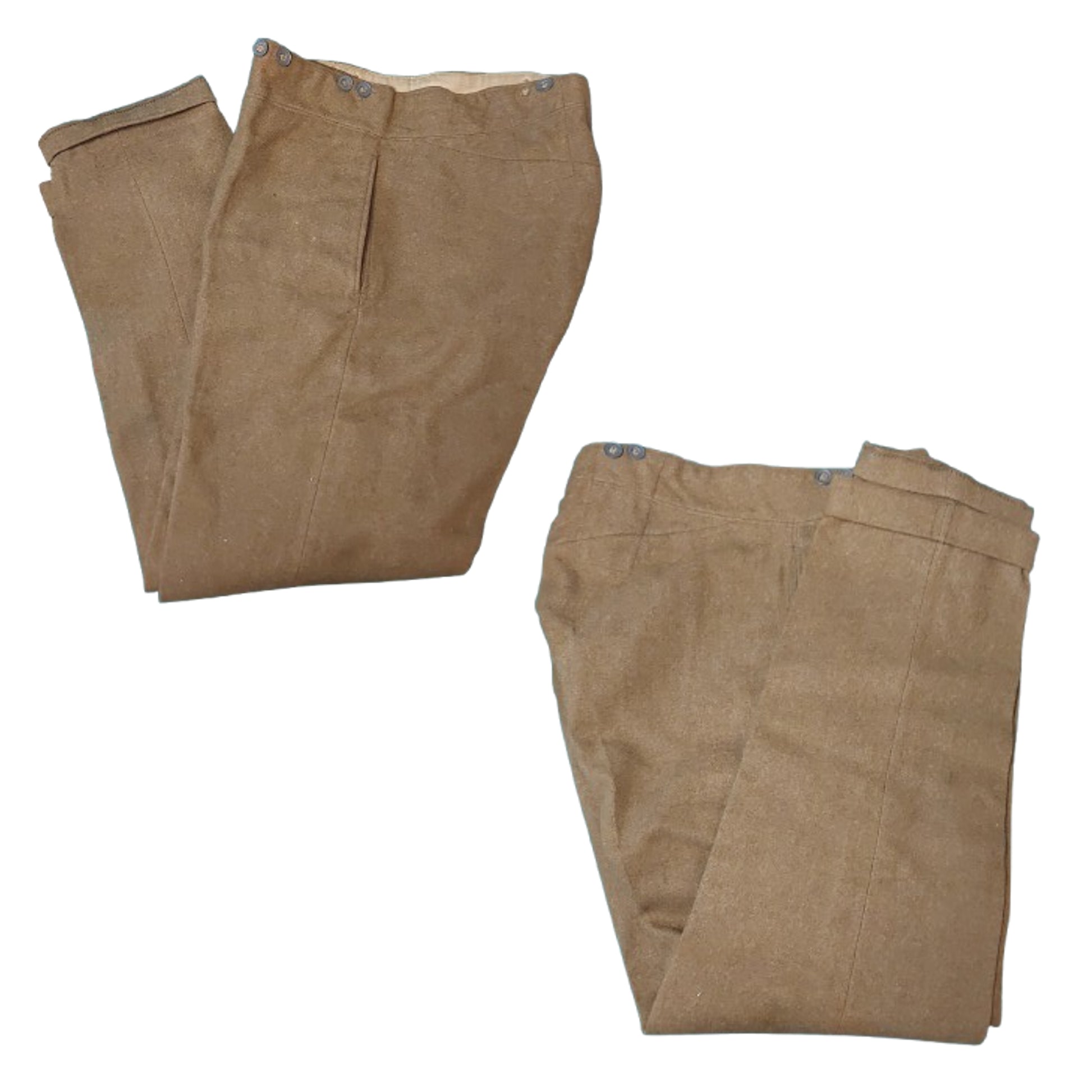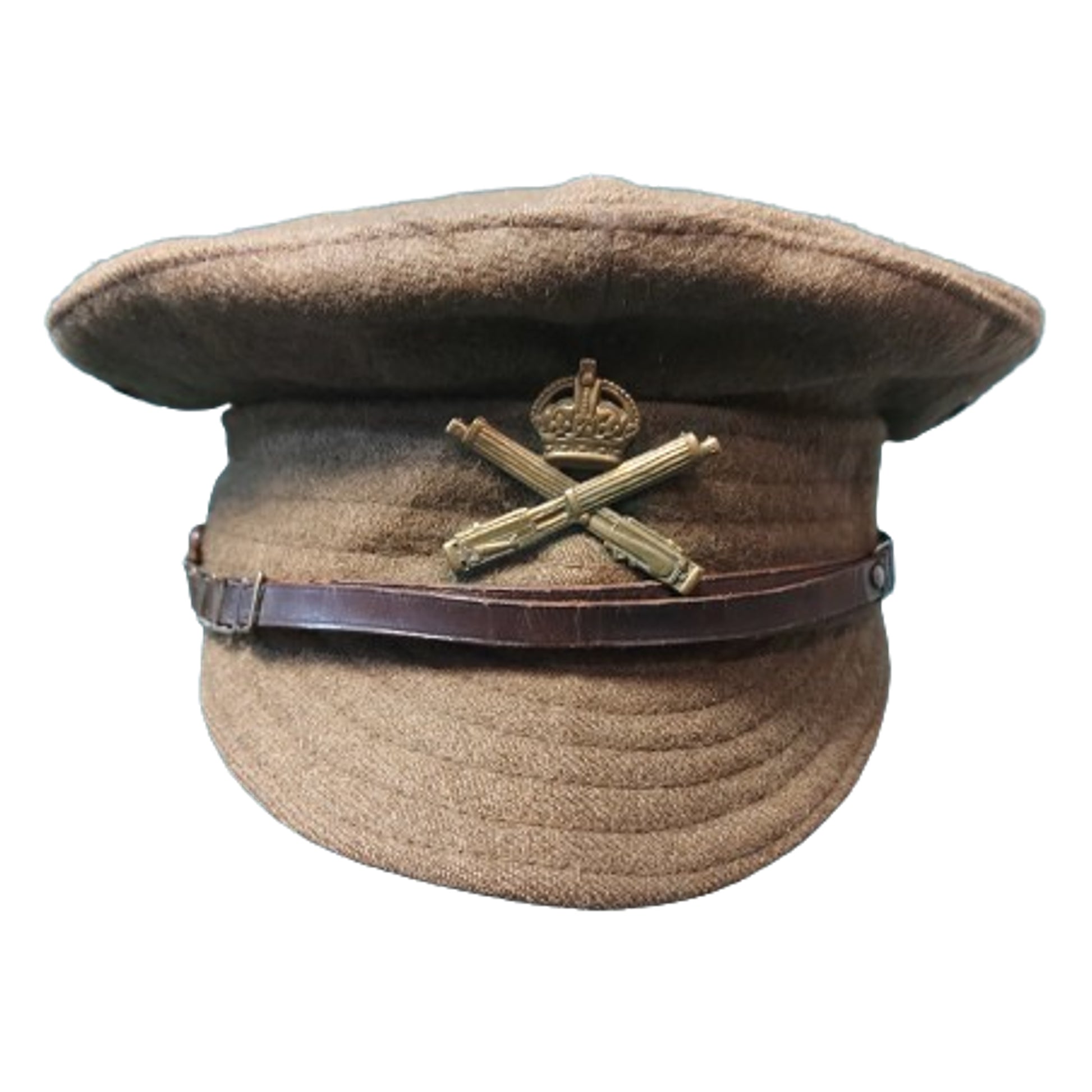 WW1 Canadian 2nd CMG Canadian Machine Gun Battalion Uniform Set, comprising of the tunic, pants, and visor cap. British 5 button, 4 pocket front tunic with a hook collar and all buttons in place. Each upper arm with the cloth 2nd Machine Gun Battalion formation patches. Lower right sleeve with embroidered on cloth 3 year overseas service chevron. Brass CANADA shoulder titles to each epaulette and brass Canadian Machine Gun Battalion collar badges in place. A pinback ribbon bar is above the right breast pocket for the Victory medal and BWM. Remnants of the paper label to the interior, and with War Department markings. Pattern 1902 straight leg pants that are marked to the interior. All buttons are present. Cuffs have rolled up, with the creases showing they have been this way for a very long time. The pants are very clean, showing some wear, and some small moth nips present. They are accompanied with an unmarked leather waist belt with a brass roller buckle and a pair of British made putties that have the manufacture labels in place to each. Both show use and wear, with one being cut into 2 sections, which could be repaired if desired. The set is also with the WW1 soft visor cap with brass badge to the front, and leather chin strap in place held in place by 2 small side buttons. The soldier has "customised" the chin strap by adding extra sliding buckles to each side. Leather sweatband to the interior that shows expected wear. No visible markings present. SKU: 63500