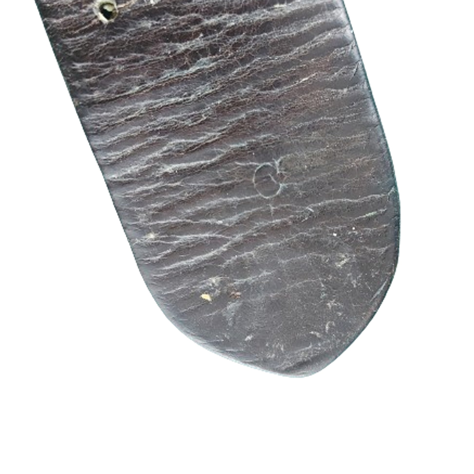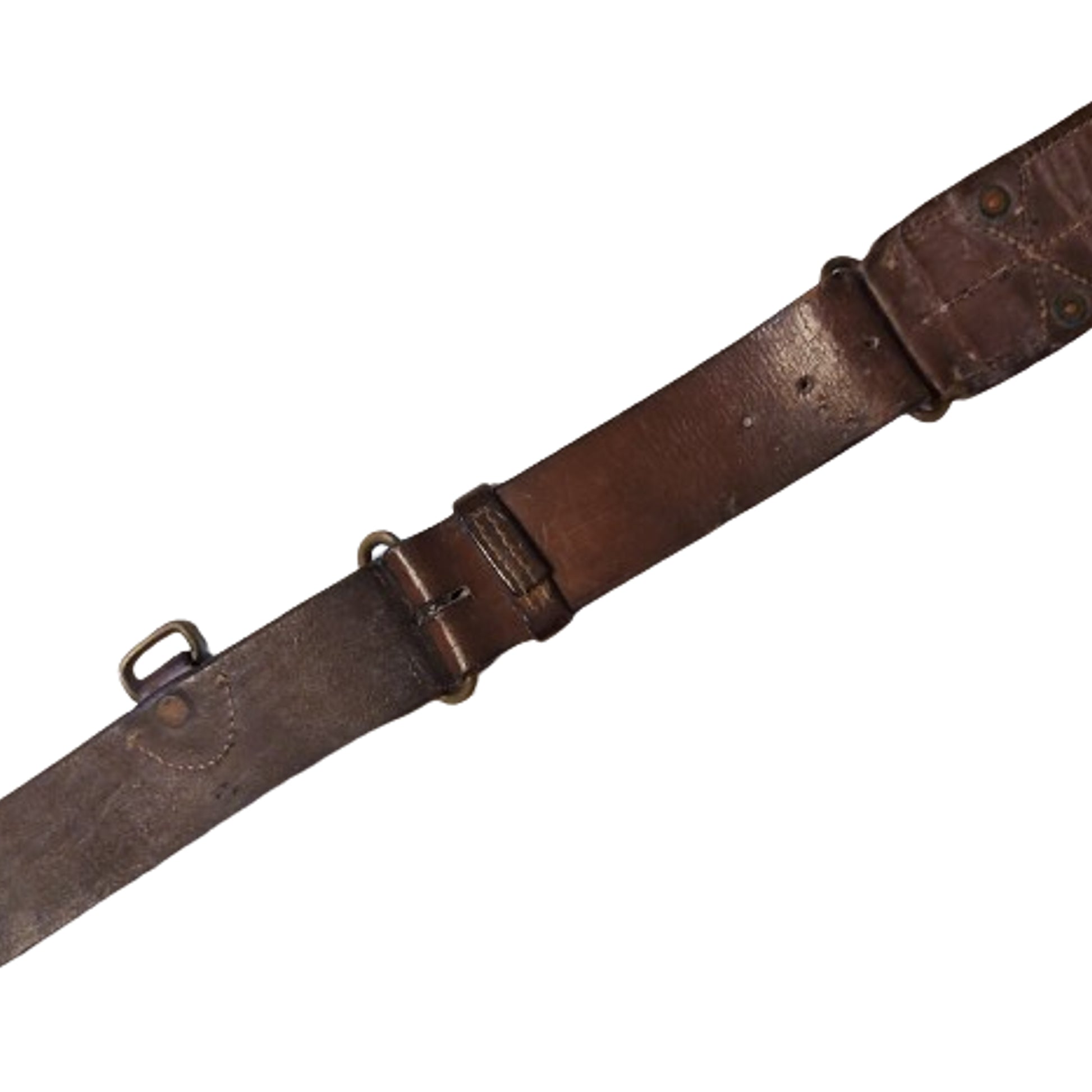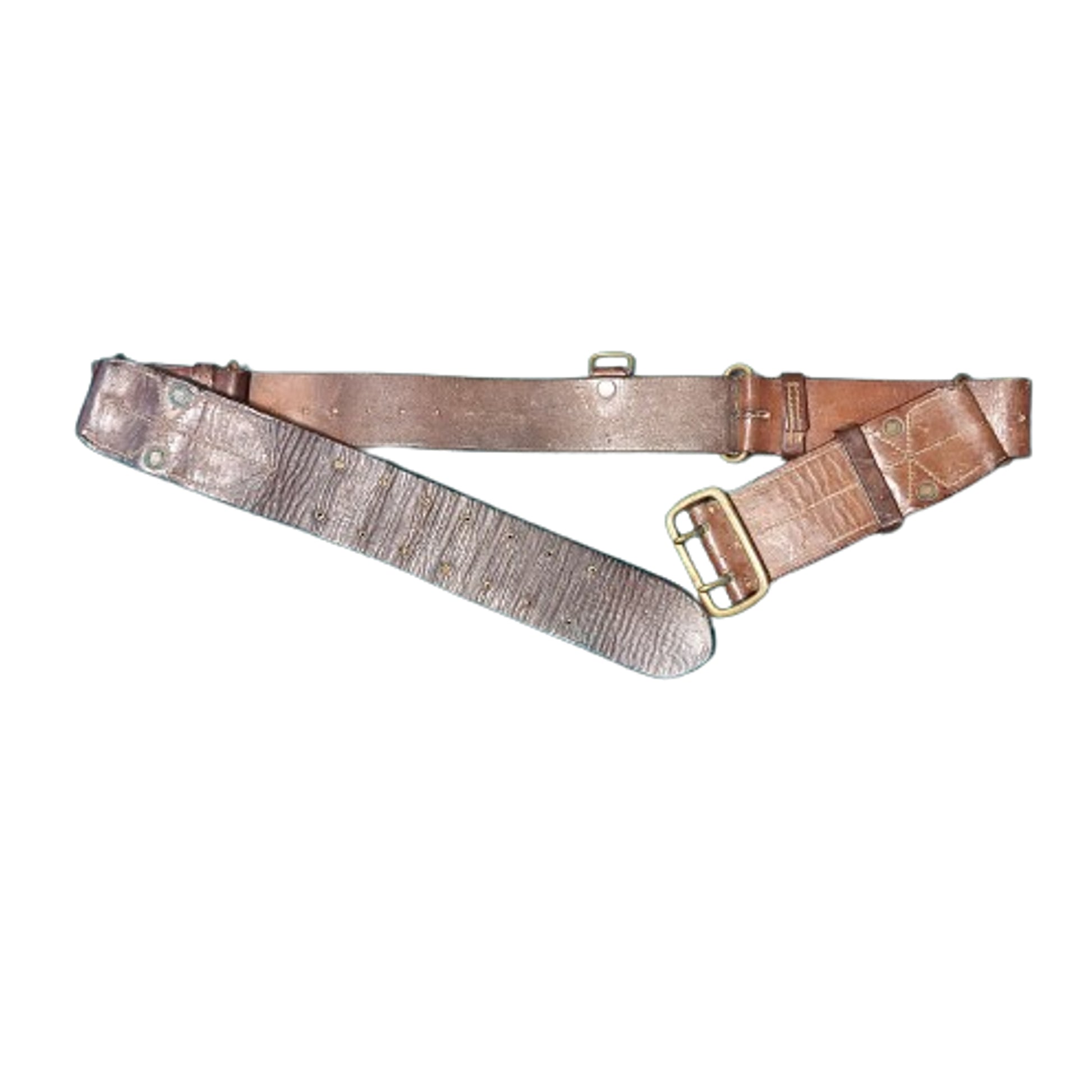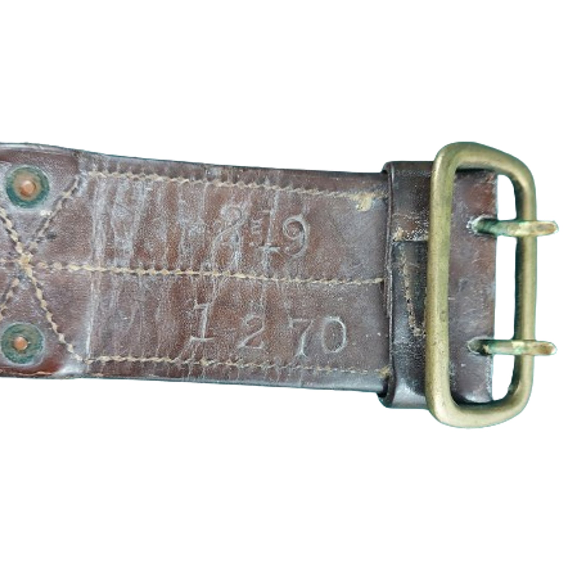 Heavy leather 3 piece construction waist belt with brass fixtures. Stamped to the interior with the number 219 above 1270 with a faint makers mark. C-Broadarrow stamped to the tab. Measures 40 inches overall with an adjustable waist size of 32 to 38 inches. SKU: 61586