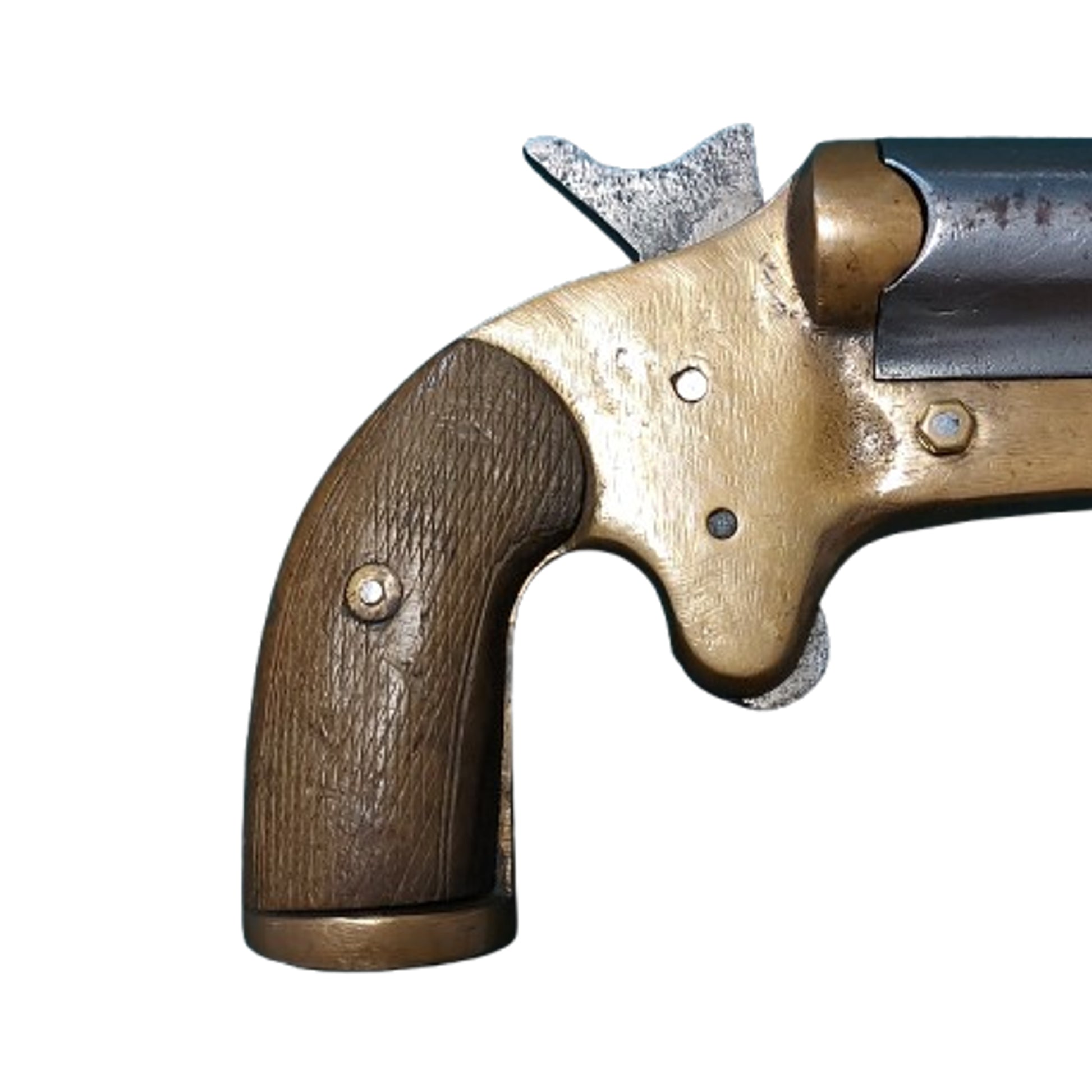 Brass and metal construction, with a brass frame stamped "Mdl 1917" to the bottom of the left side. 7 inch, round steel barrel finished in the white with a 1 inch bore. 2 piece checkered wood grip panels secured by a single screw. Missing the lanyard ring that would be mounted below. spur trigger, single action with a release lever to the lower left side. Shows expected use and wear. SKU: 63498 NO PAL REQUIRED. CANADIAN SALES ONLY.