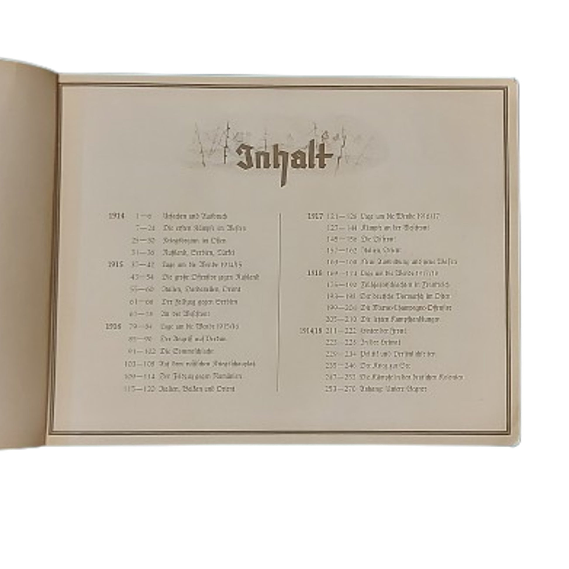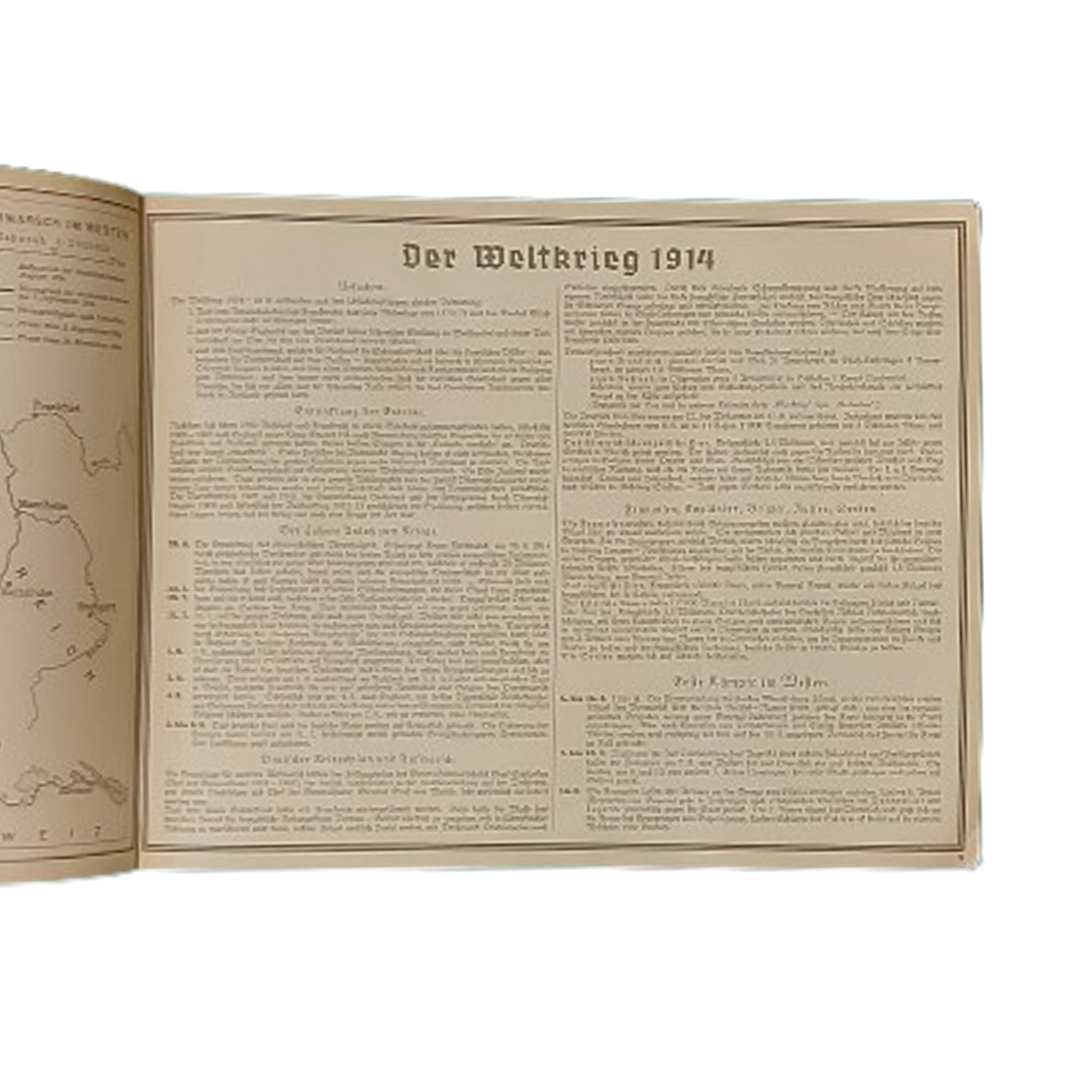 WW1 German Der Welt Krieg Cigarette Card Album, measuring 13 3/4 by 10 3/4 inches, soft cover, and containing 72 pages with all of the color cards in place except 2. Covers all aspects of the German forces from 1914 to 1918. Very good condition overall. SKU: 63157