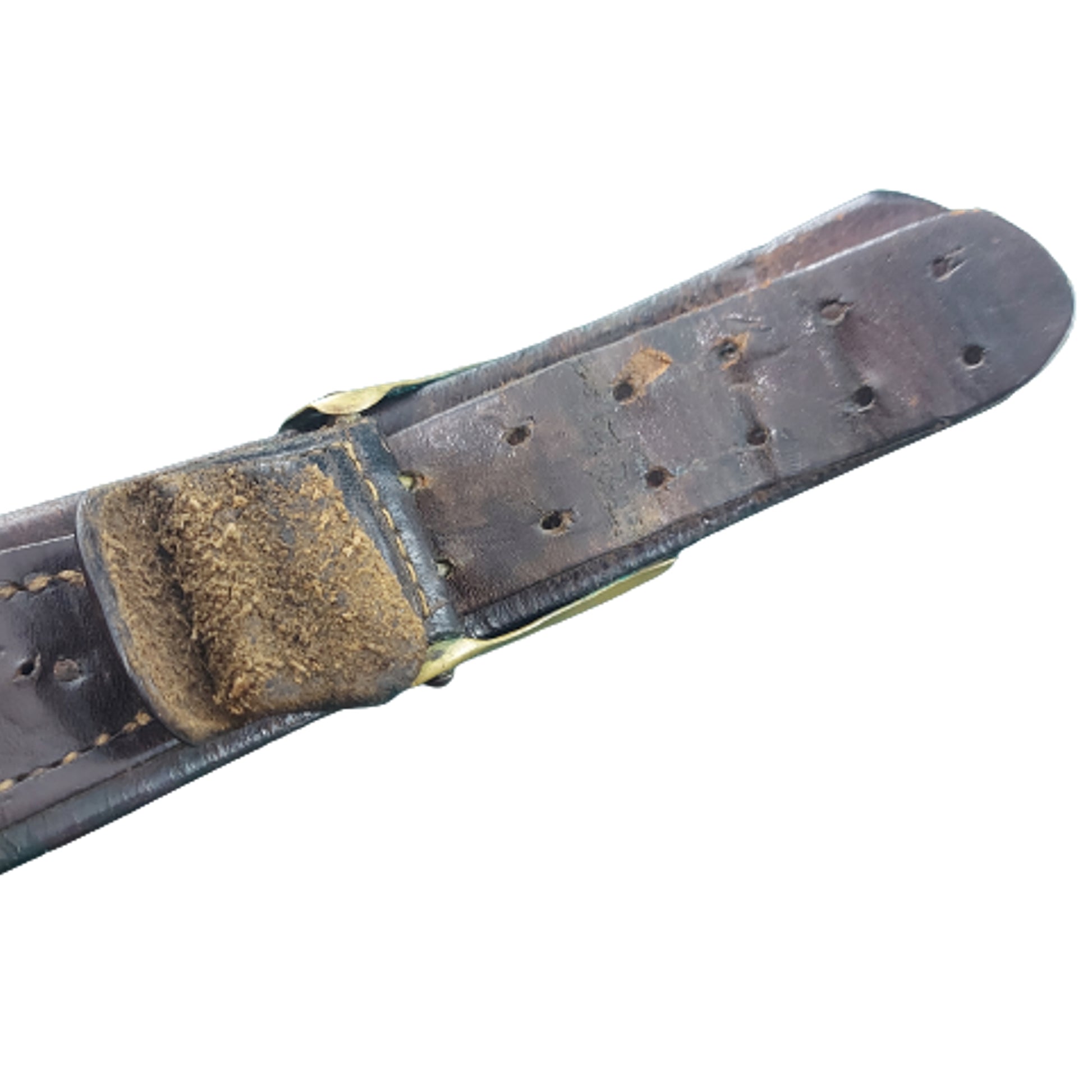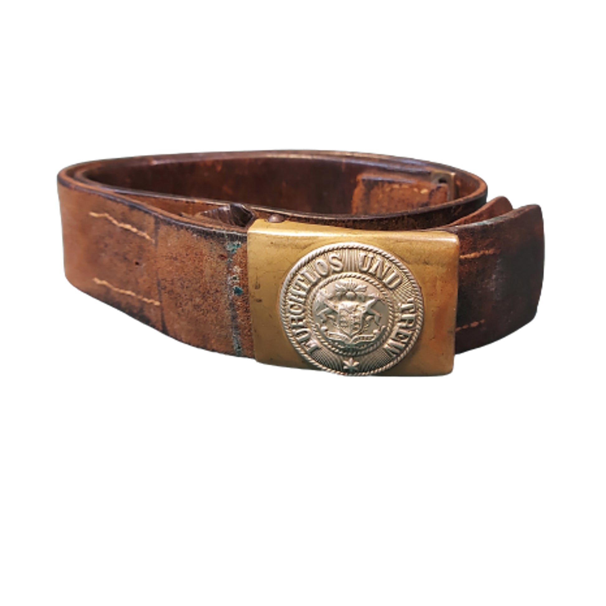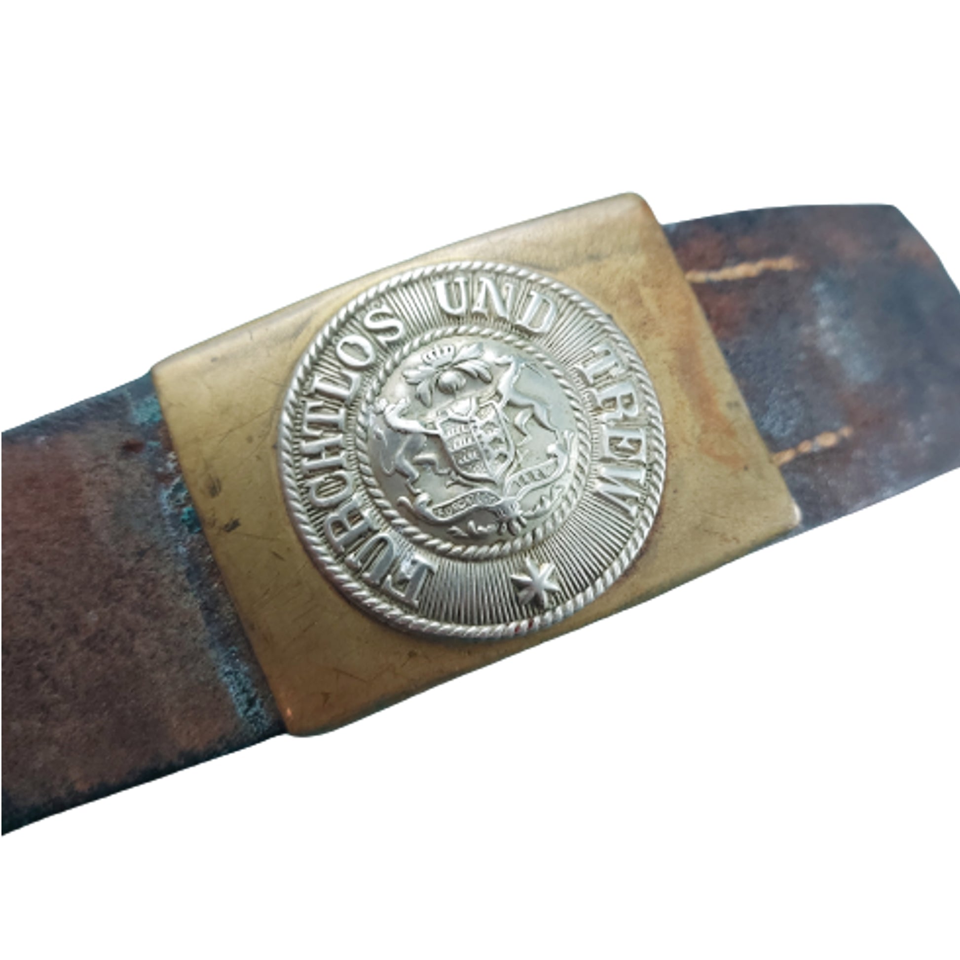 Leather belt measuring 34 inches in total length with the issue bi-metal multi piece construction buckle in place with a raised center reading "Furchtlos Und Trew" (Fearless And True). Belt shows war time use and wear with the buckle having an even aged patina finish to the brass and nickel silver finish. SKU: 60720