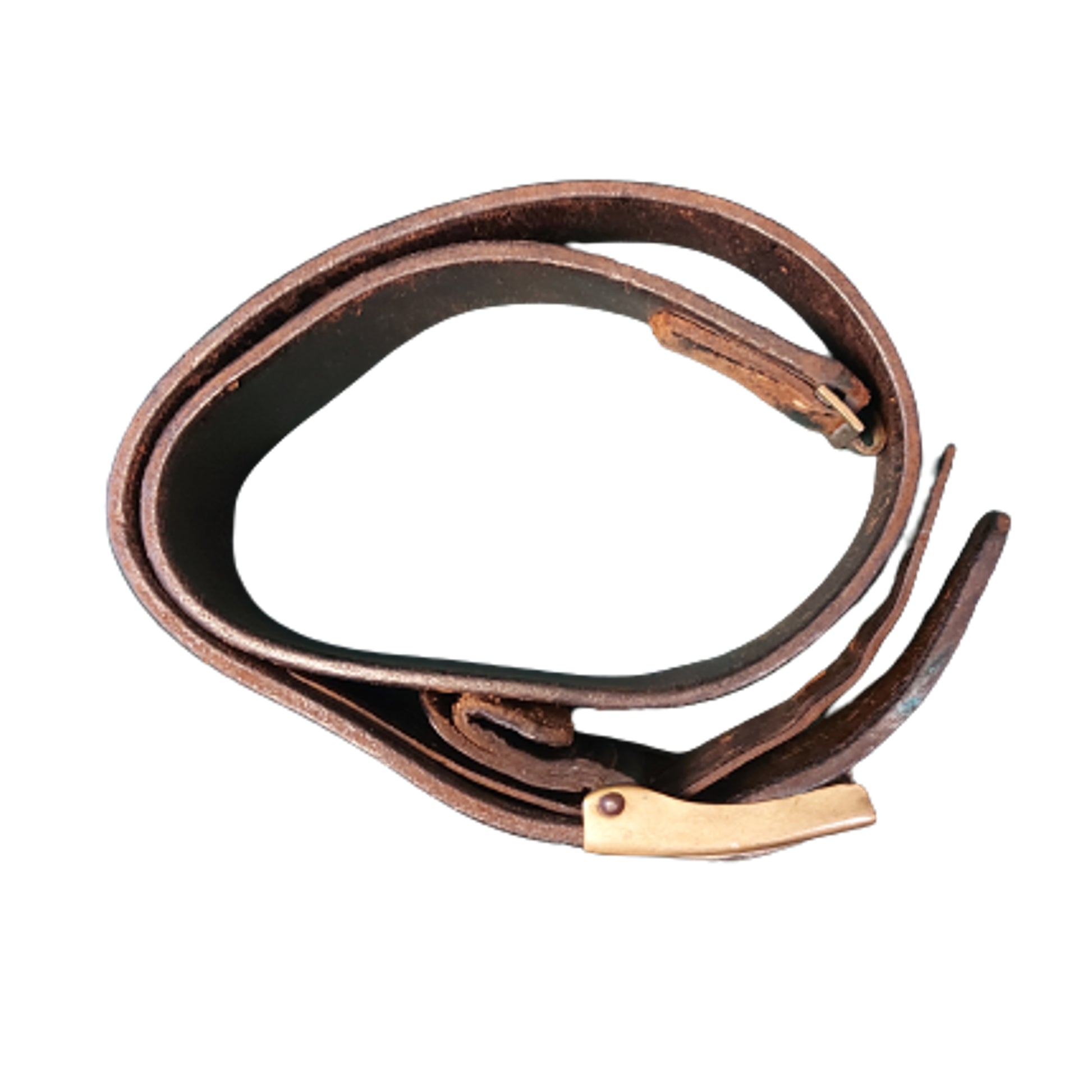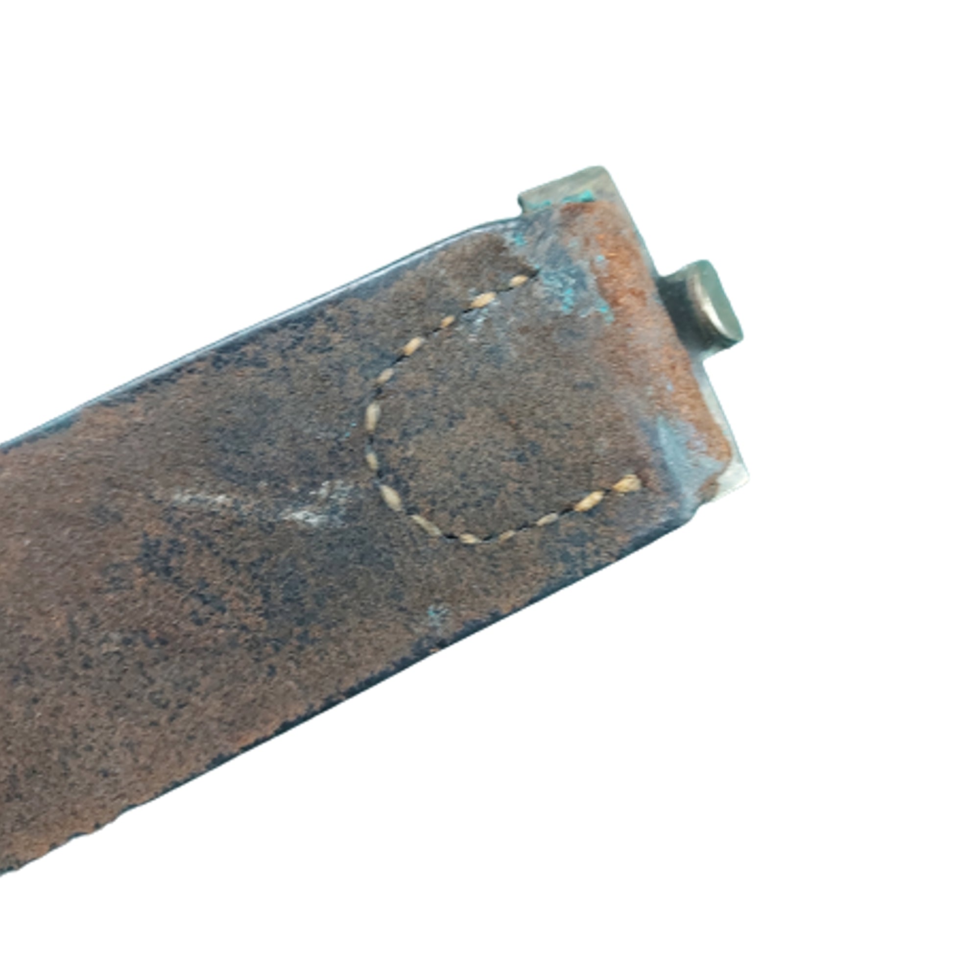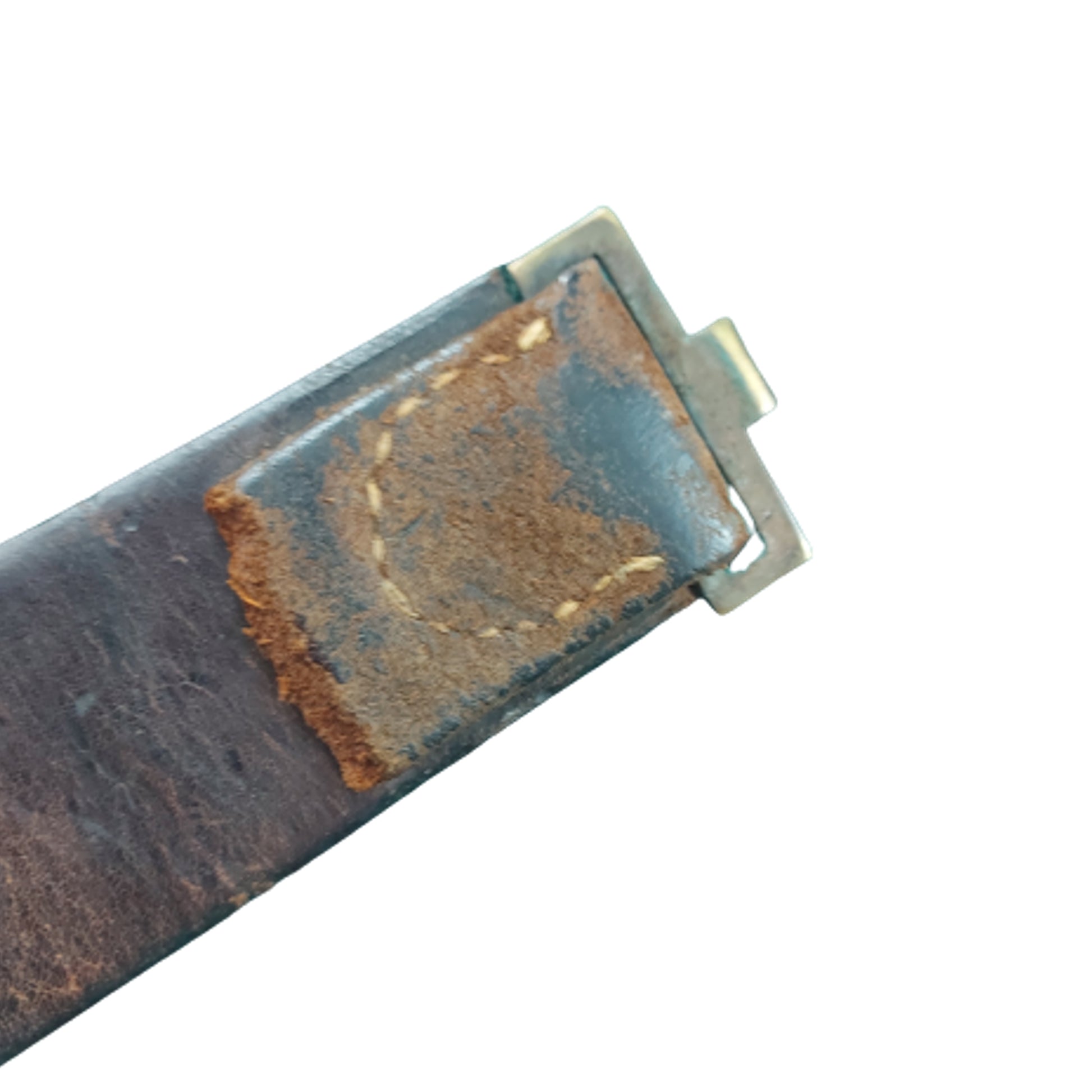 Leather belt measuring 34 inches in total length with the issue bi-metal multi piece construction buckle in place with a raised center reading "Furchtlos Und Trew" (Fearless And True). Belt shows war time use and wear with the buckle having an even aged patina finish to the brass and nickel silver finish. SKU: 60720